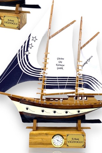Kişiye Özel İsimli ve Saatli Gemi Maketi - SARI LACİVERT- El Yapımı Doğal Ahşap