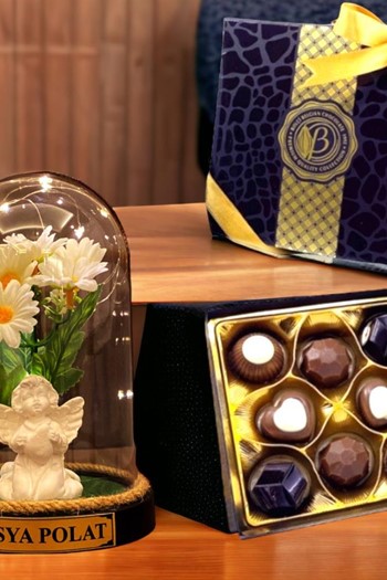 Kişiye Özel Tasarım Beyaz Melekli, Papatyalı ve Led Işıklı Fanus - Çikolata Kutulu