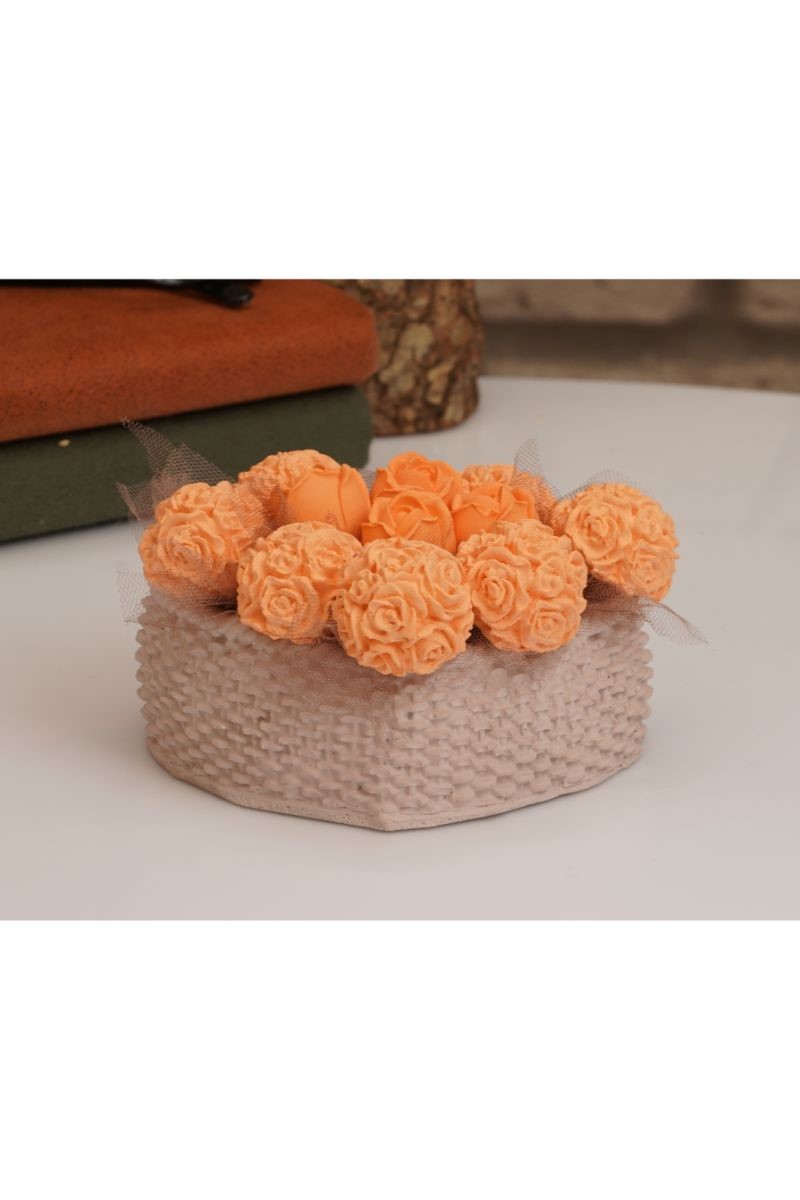 Özel Tasarım Taş Döküm Somon Kalpli Saksıda Top Güller Kokulu Taş Çiçek