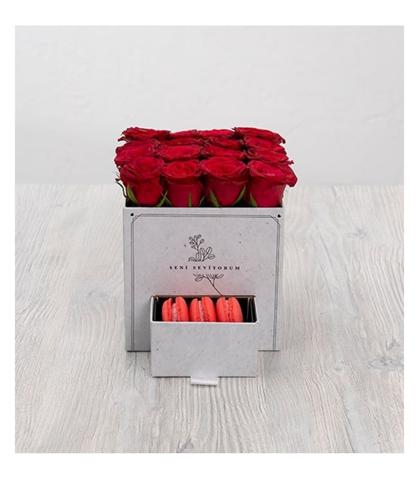 101 Dilde Seni Seviyorum Beyaz Kutuda Kırmızı Güller ve Makaron