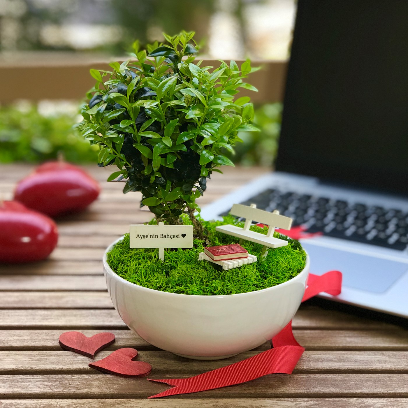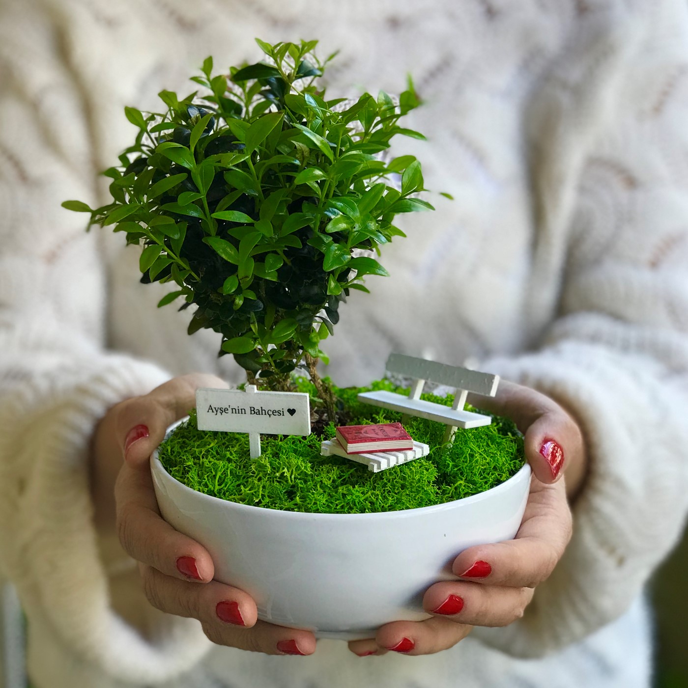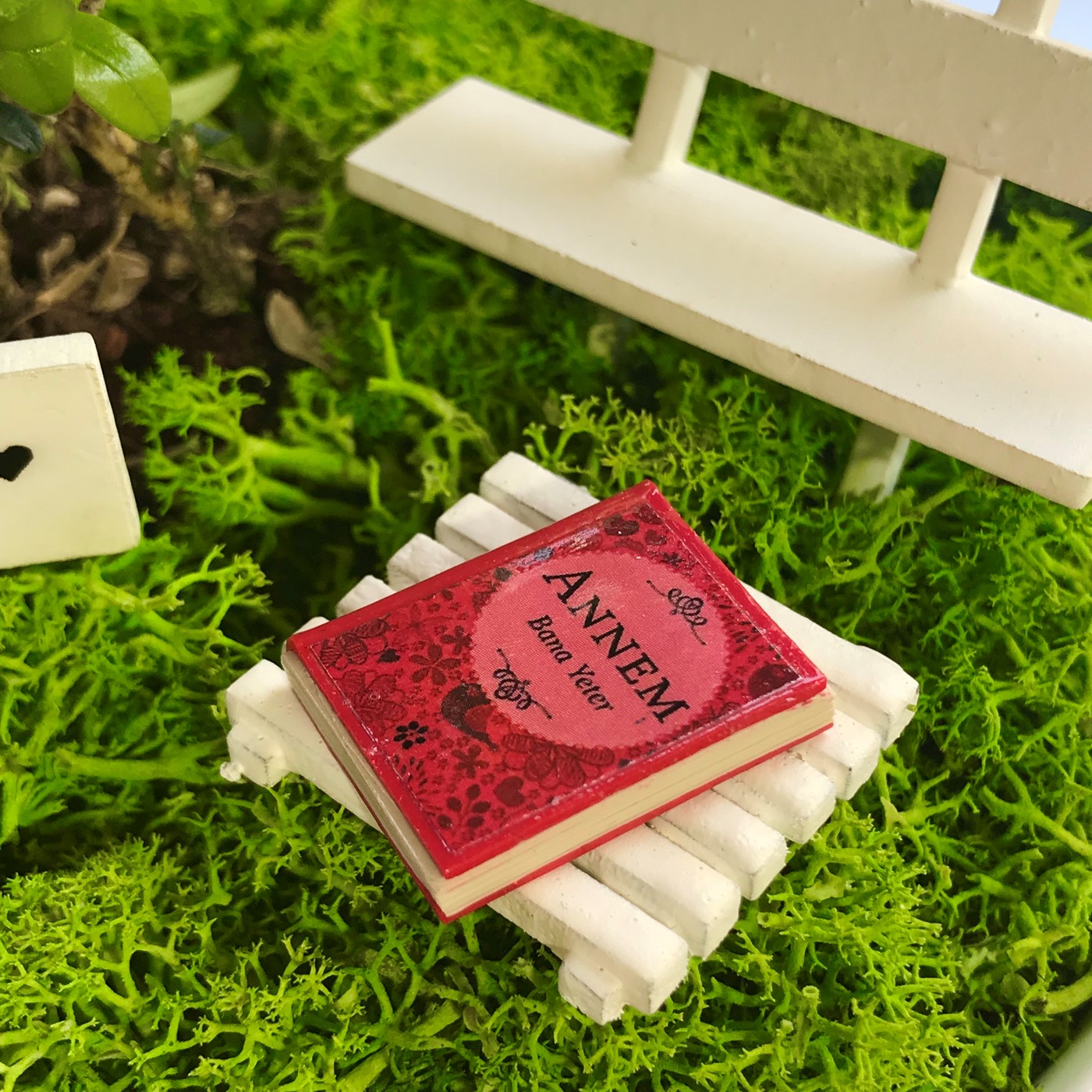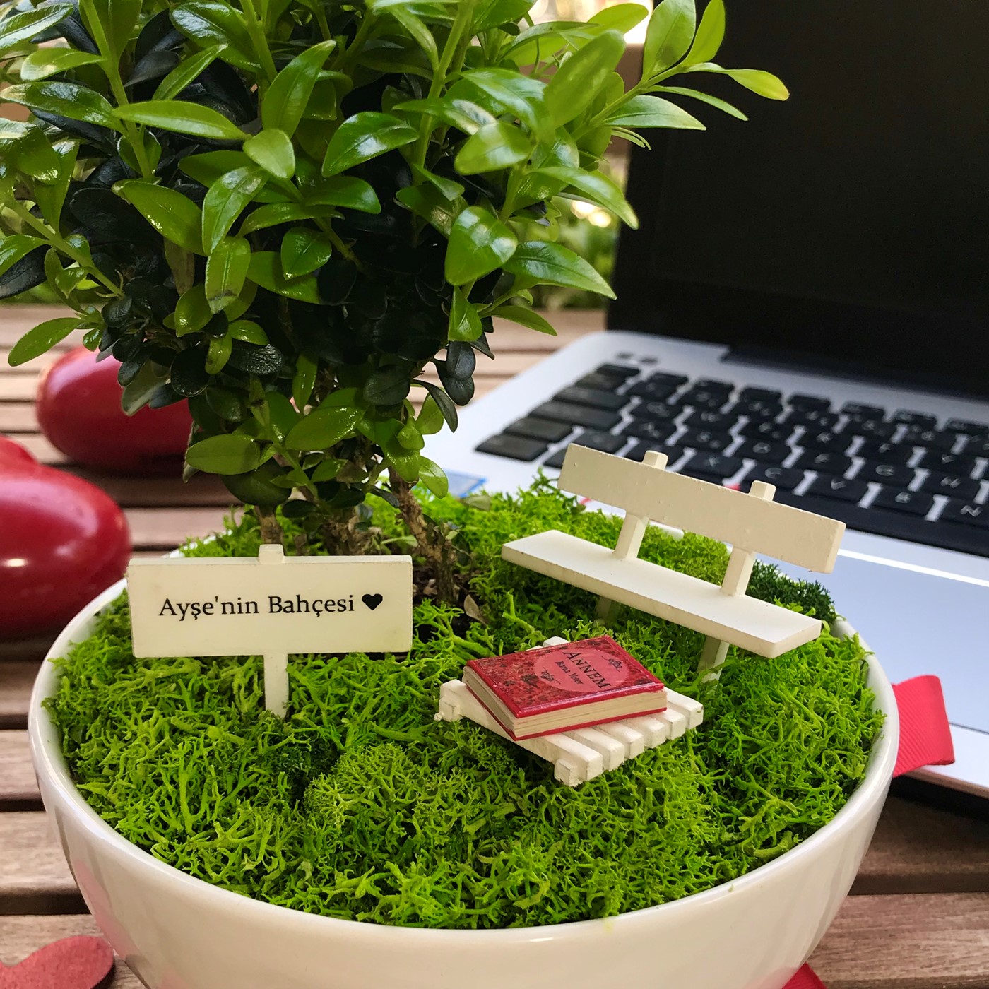 Bu orijinal tasarım yıllarca unutulmayacak eşsiz bir hediye arayanlar için canlı bitkiler ve ahşap mobilyalarla hazırlanmıştır. El emeği ile üretilen şeyler her zaman özeldir. Minyatür bahçeniz, anneniz, yeni anne olmuş arkadaşınız veya eşiniz için seçilen bitkiler ve tek tek elde hazırlanan aksesuarlarla tamamlanır. Minyatür bahçe, yaklaşık 13 cm çapında 6 cm yüksekliğinde benzer formdaki porselen ya da seramik kaplarda Buxus Sempervirens türü bitki ile hazırlanır. Bahçede el yapımı ahşap bank, ahşap sehpa ve üzerinde el yapımı minyatür Annem Bana Yeter kitabı bulunmaktadır. Zarif hediyeniz, Kişiye Özel hazırlanan şık bir bahçe tabelası ile tamamlanmaktadır. Büyük bölümü tek tek elde hazırlanan minyatür aksesuarların tasarımlarında değişiklikler ya da milimetrik ölçü farklılıkları bulunabilir. Bakım: Minyatür bitki canlıdır. Bol gün ışığı alan dış mekanlar için uygundur. Minyatür bahçenin zemininde canlı ya da şoklanmış yosun kullanılır. Yosunlar zamanla renk ve dokularını kaybedebilir.