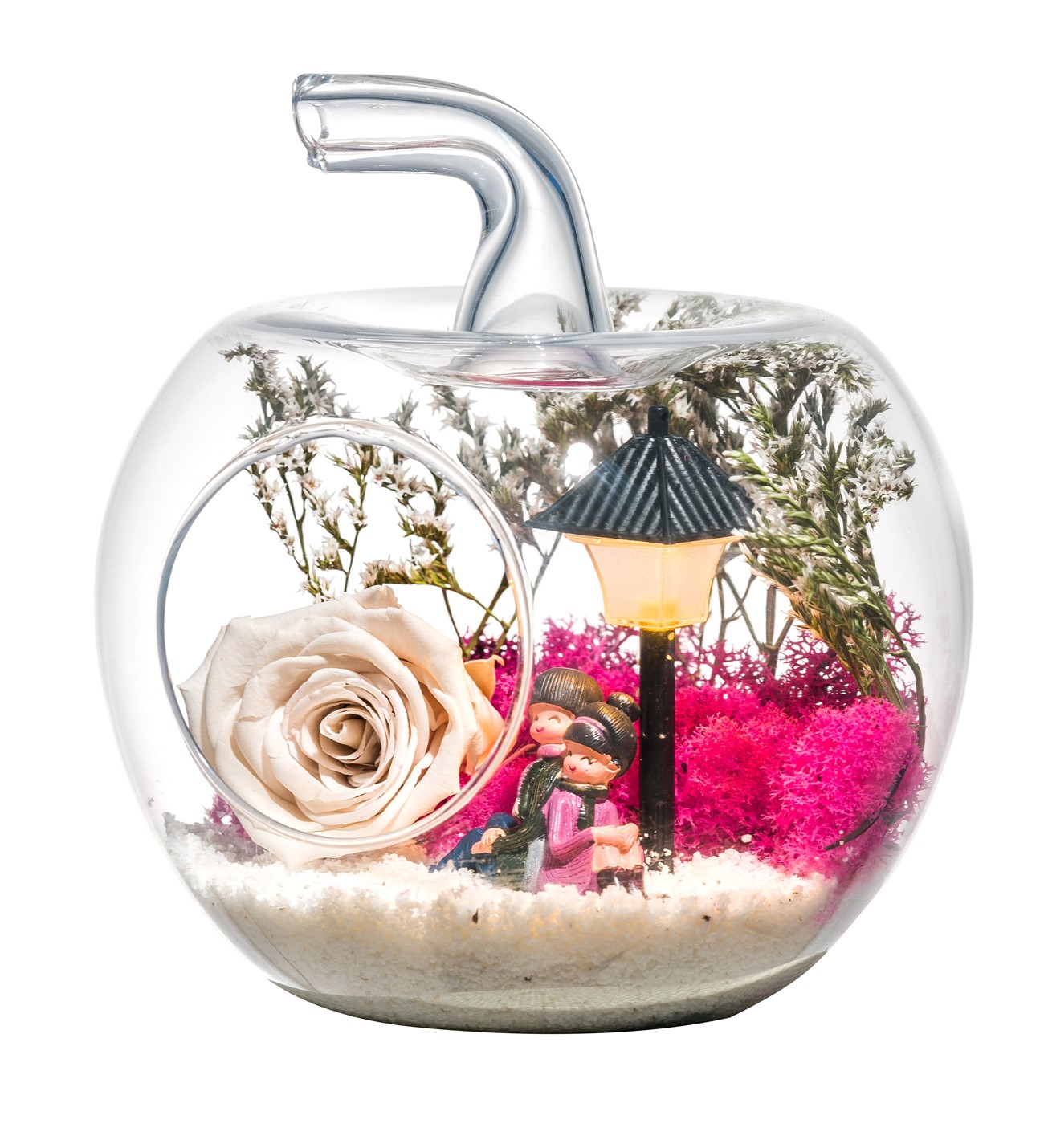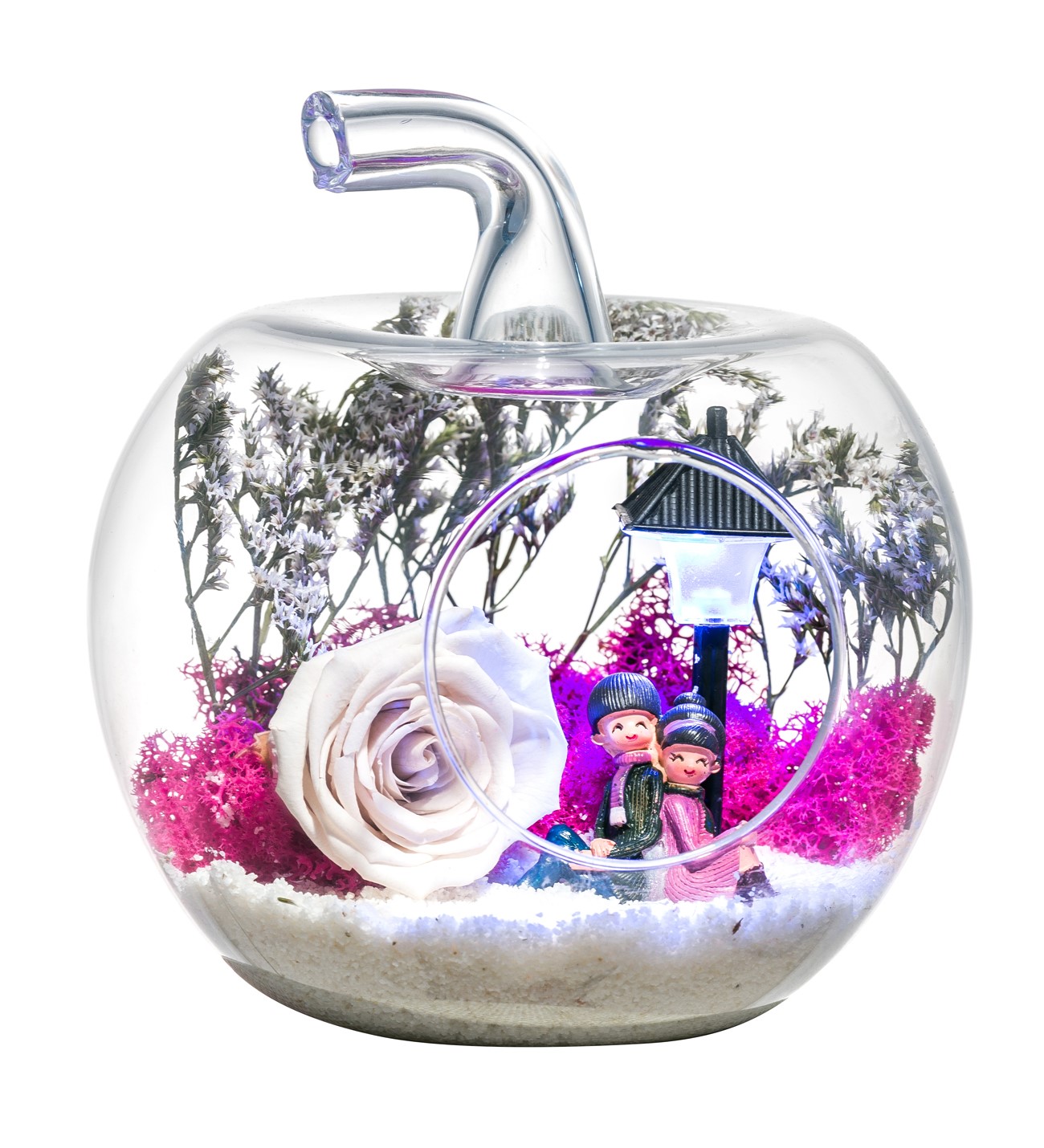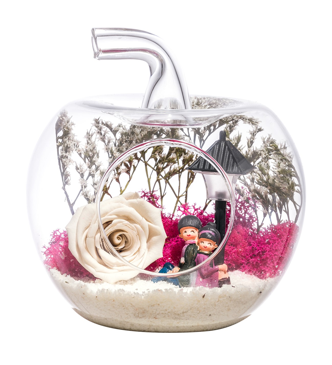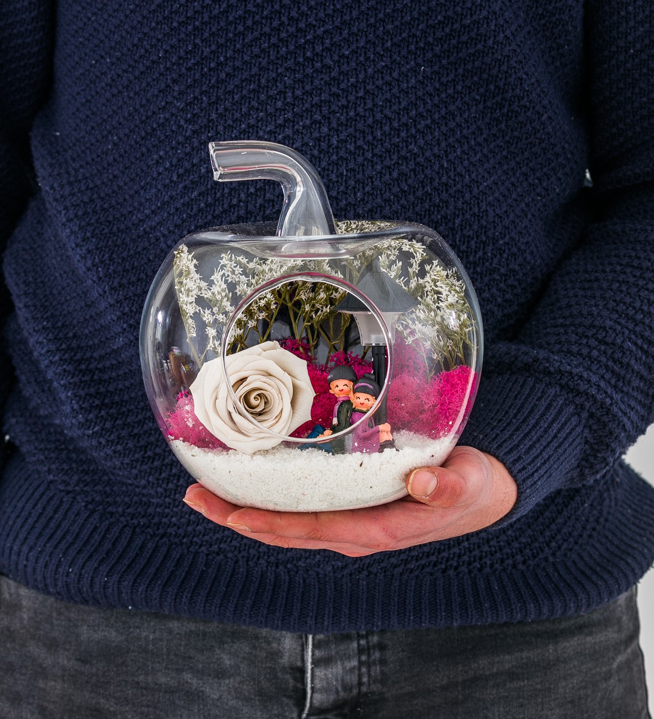 Küçük boy elma cam fanus içerisinde tasarladığımız bu çok özel teraryum, iddialı rengiyle bulunduğu ortamda herkese mutluluk dağıtacaktır. Tasarımımız; beyaz kum, şoklanmış yosunlar, kurutulmuş bitkilerle beraber bir adet ışığı yanan lamba, bir adet solmayan gül ve sırt sırta yaslanarak oturmuş aşkın tadını çıkartan sevgilileri simgeleyen objeyle tamamlanmıştır. Ev ve ofis ortamlarının tamamında sergilenebilir teraryumun içinde canlı bitki bulunmadığından, herhangi bir bakıma ihtiyacı yoktur. Özellikle her ortamda yıllarca, zevkle izlenebilecek çok özel bir teraryumdur.