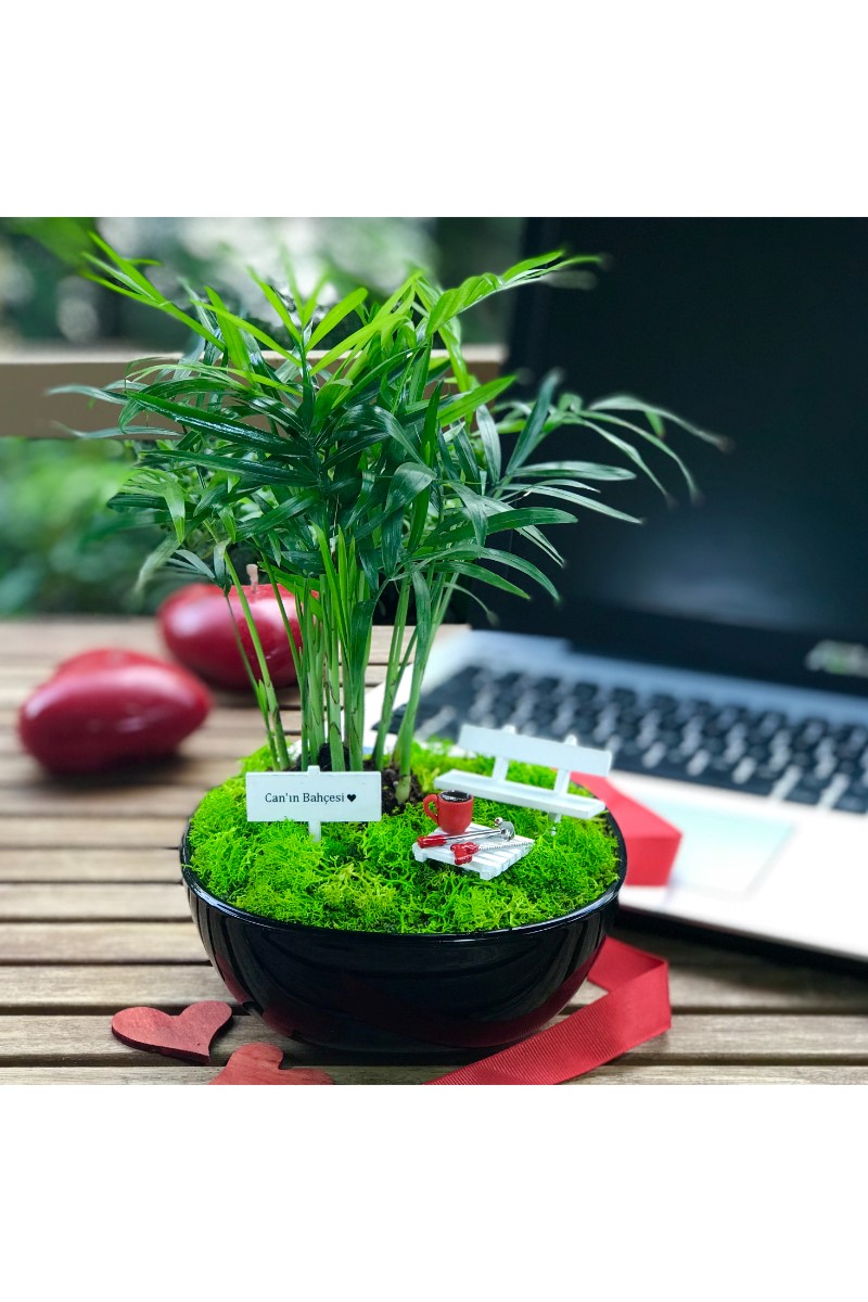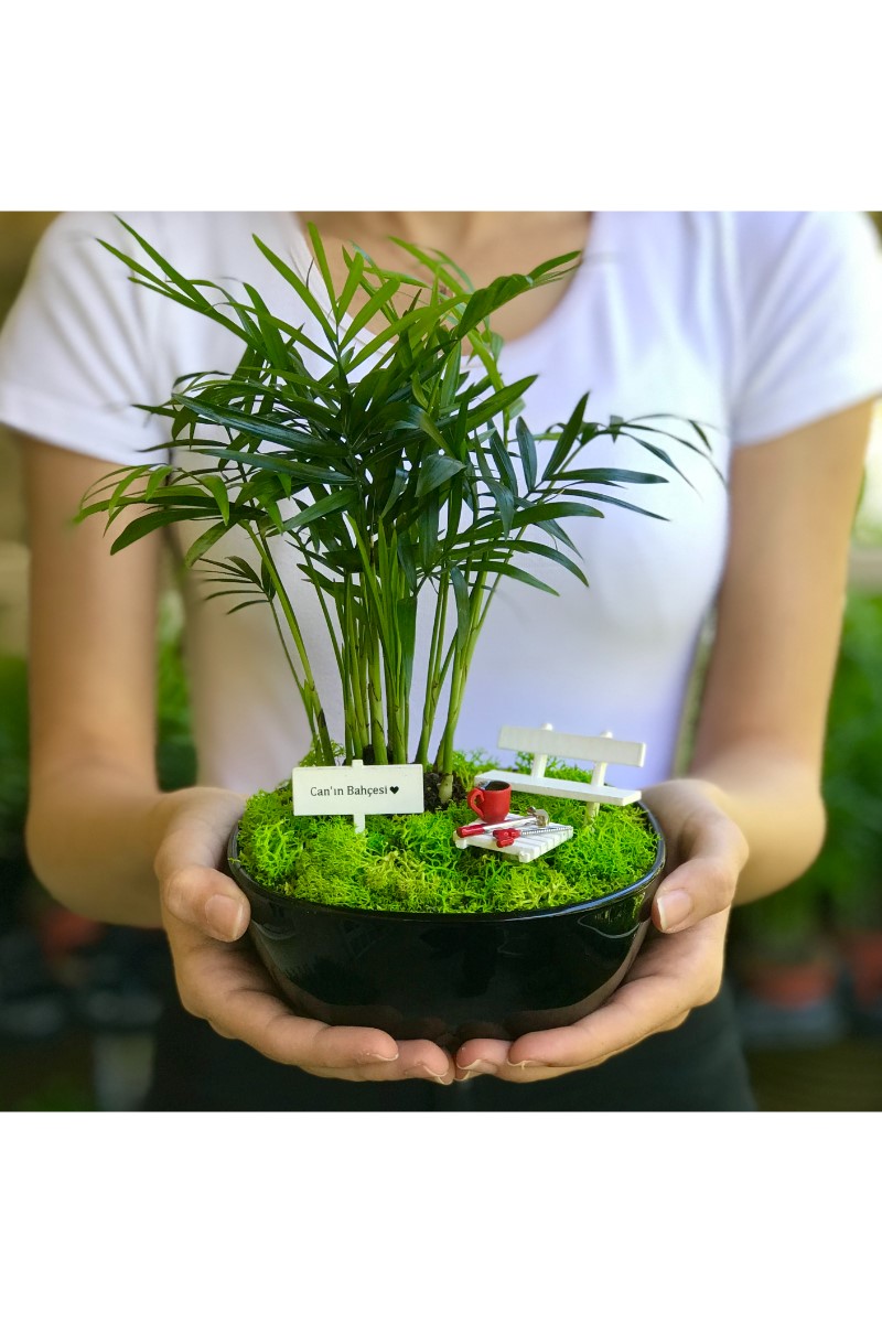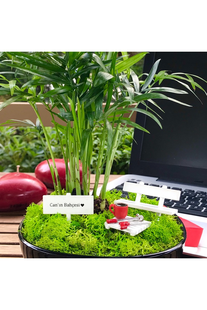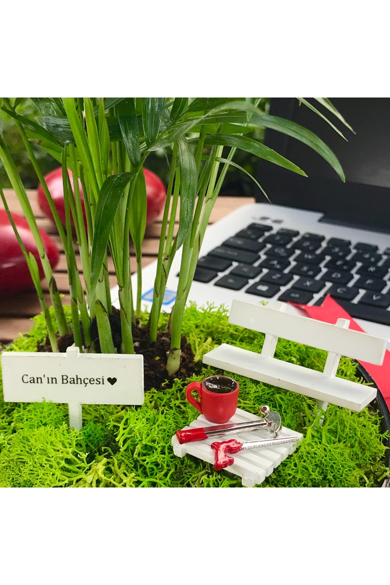 Kap : 14 x 14 cm. boyutunda siyah cam ya da siyah seramik Bitki : Chamaedora Elegans Aksesuarlar : El yapımı ahsap bank ve ahşap sehpa, sehpa üzerinde el yapımı minyatür kahve fincanı ve minyatür çekiç ve testere figürleri ve isme özel hazırlanan el yapımı minyatür bahçe tabelası (Tüm aksesuarlar fiyata dahildir) Bakım : Minyatür bitki canlıdır. Bol gün ışığı alan iç mekanlar için uygundur. Detaylı bakım kılavuzu bahçe ile birlikte gönderilir.