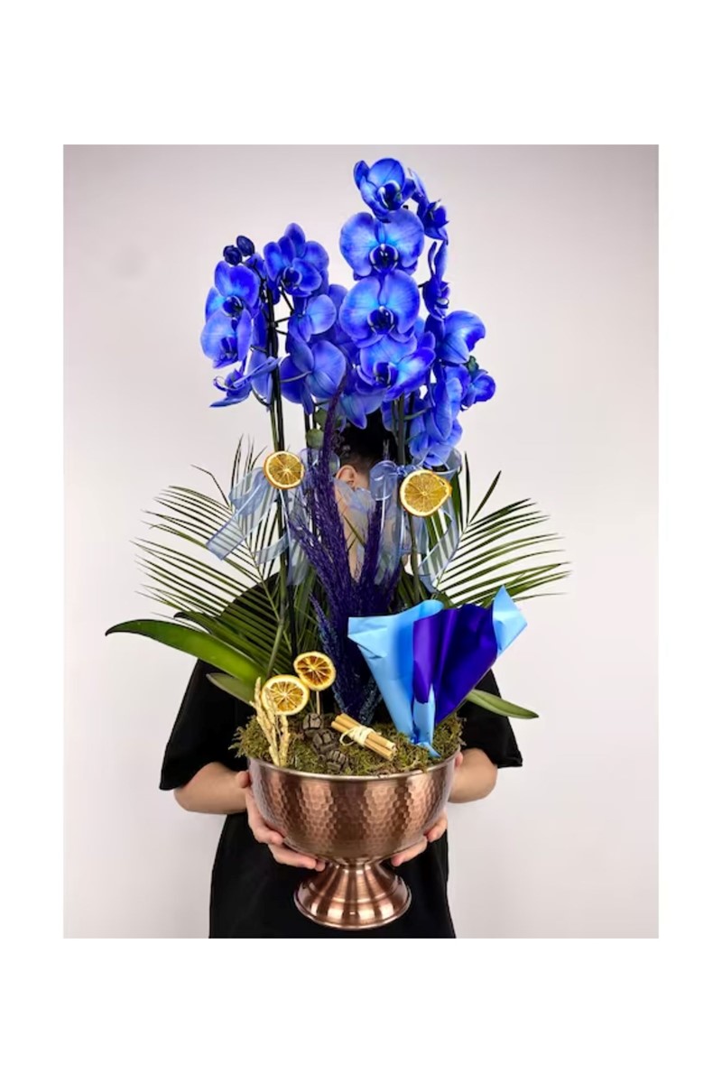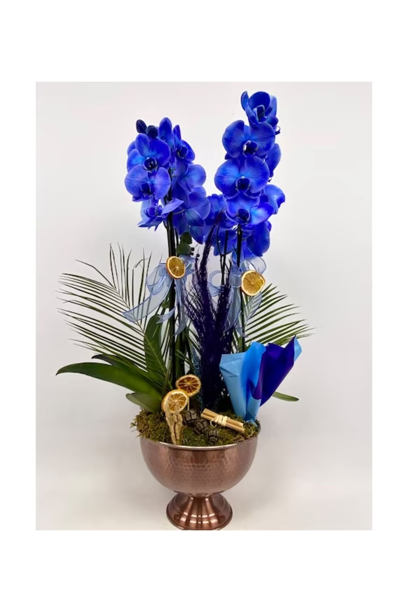 Bakır Saksıda 4 Dal Mavi Orkide Tasarım