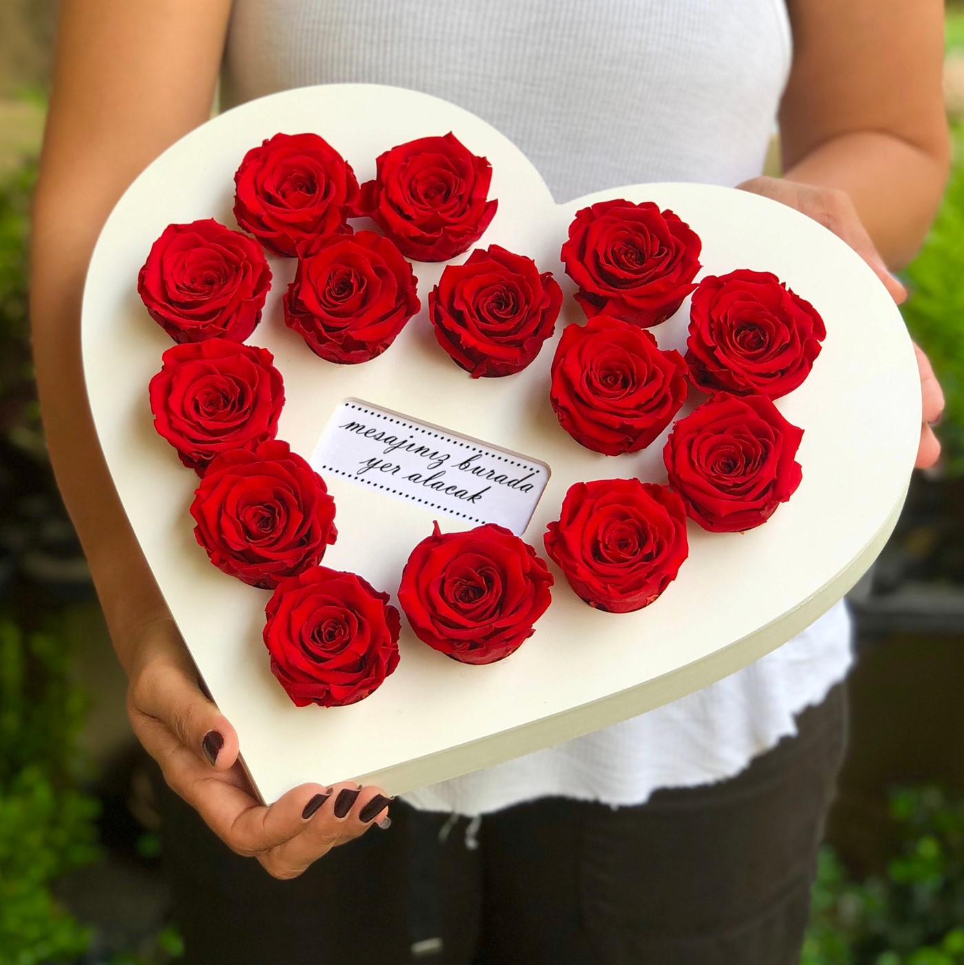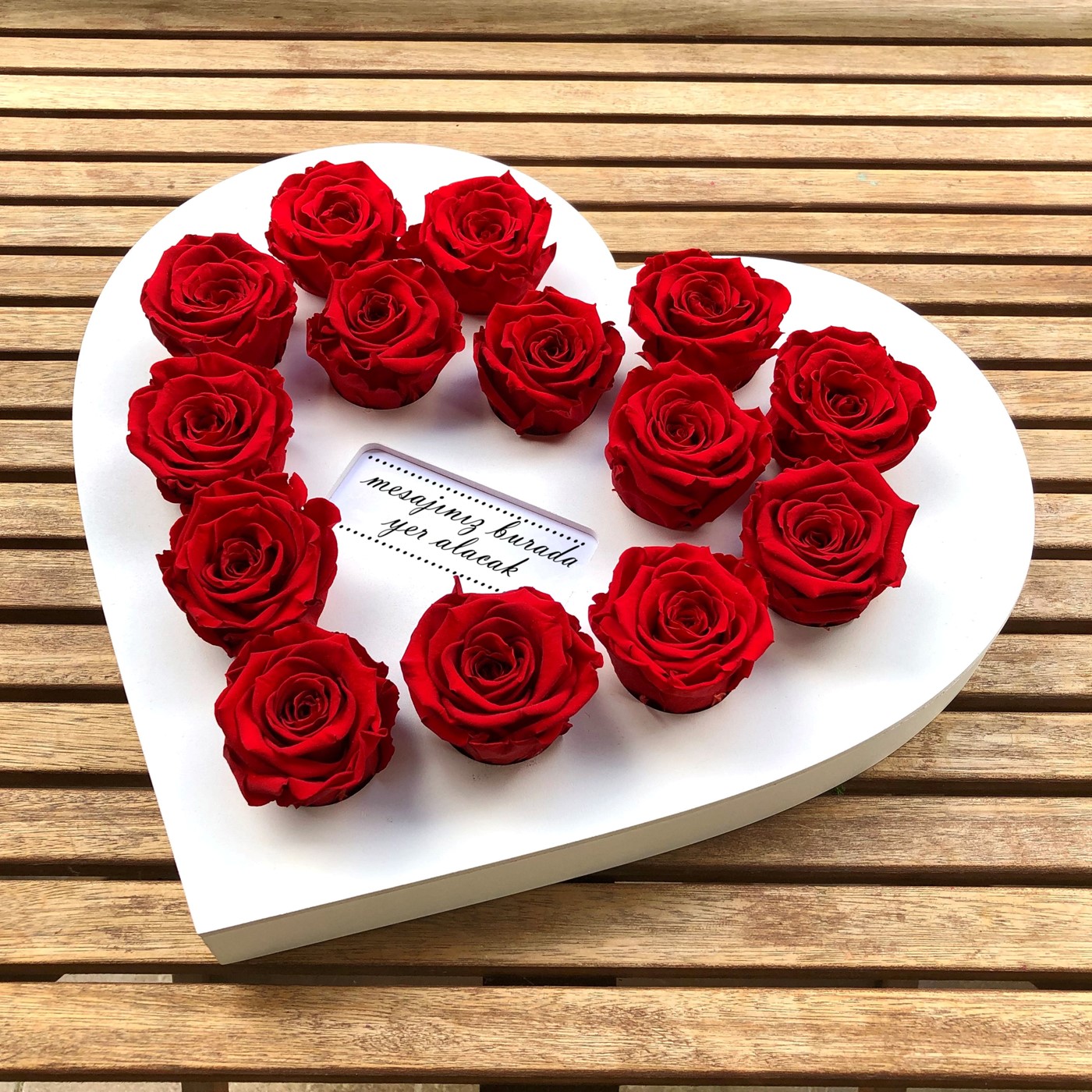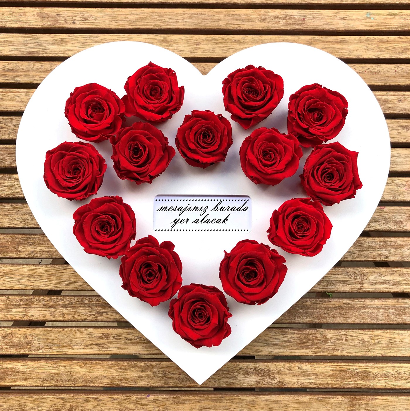 Özel üretim beyaz renkte kalp formlu ahşap platform üzerinde 14 adet kırmızı XL boy solmayan gül ile hazırlanmıştır. Ahşap platform üzerinde sevdiklerinizin adının yer aldığı isim kartı bulunmaktadır.Kalp formlu platformun yaklaşık boyutları: 33.5 x 37 cm ve yükseklik 3.5 cm’dir. Hediyeniz özel tasarım hediye kutusunda teslim edilir. *Solmayan güller özenle seçilen ve özel işlemden geçirilen gerçek Ekvator gülleridir. Nem ve direk güneş ışığından korunarak, hiçbir bakıma gerek duymadan 3 yıla kadar görünümlerini koruyabilirler.