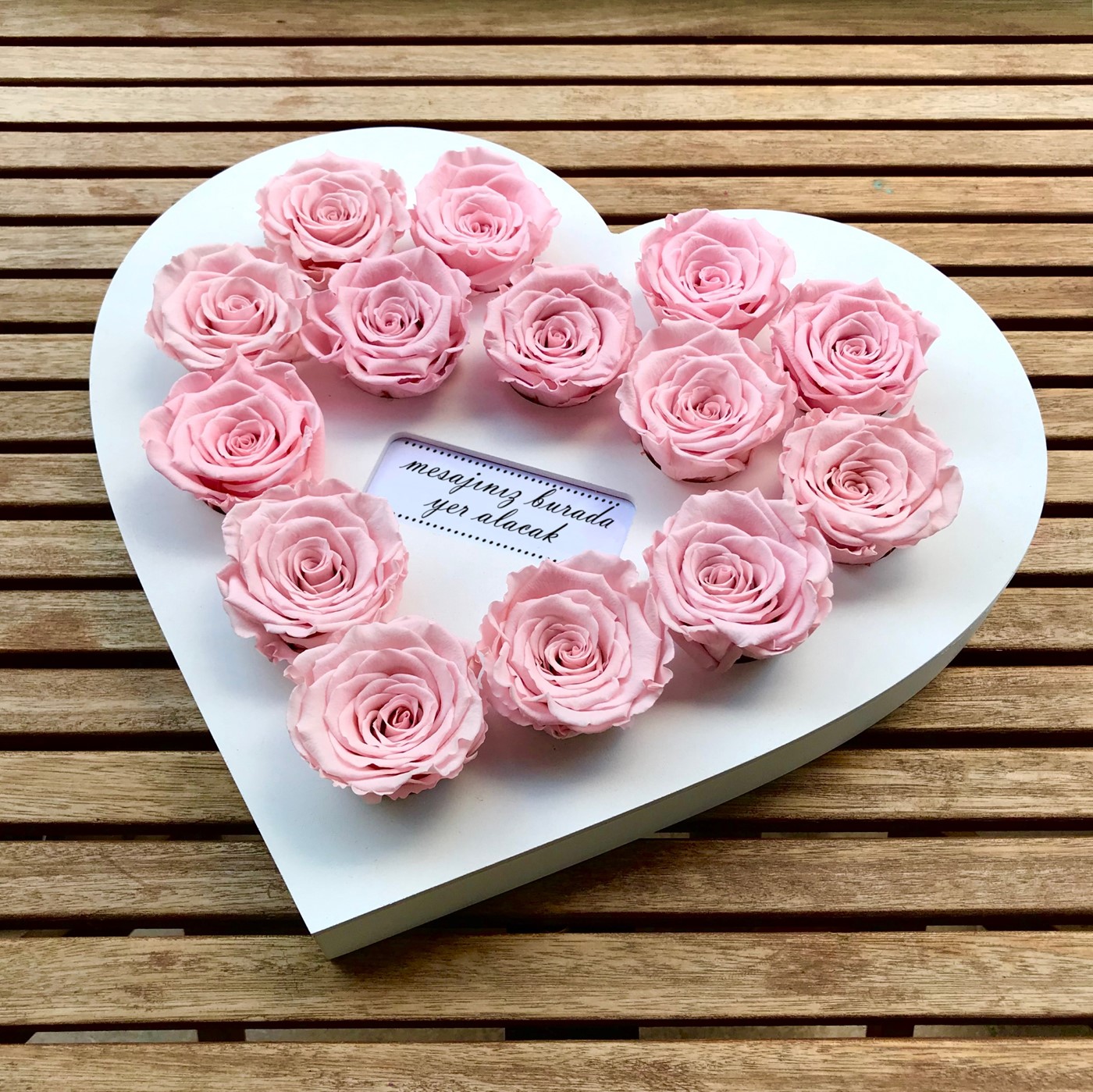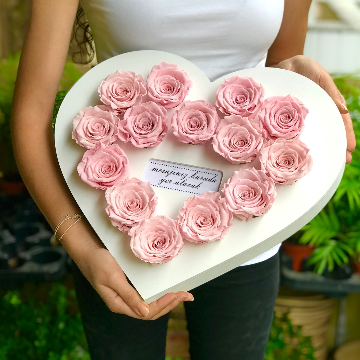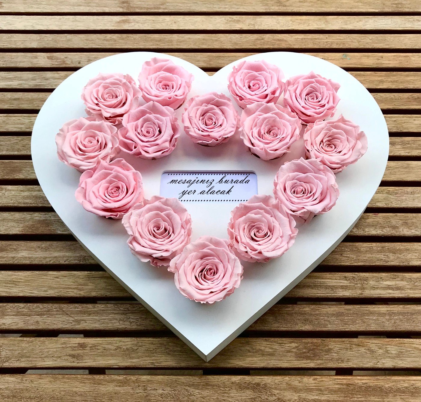 Özel üretim beyaz renkte kalp formlu ahşap platform üzerinde 14 adet pembe XL boy solmayan gül ile hazırlanmıştır. Ahşap platform üzerinde sevdiklerinizin adının yer aldığı isim kartı bulunmaktadır. Kalp formlu platformun yaklaşık boyutları: 33.5 x 37 cm ve yükseklik 3.5 cm’dir. Hediyeniz özel tasarım hediye kutusunda teslim edilir. *Solmayan güller özenle seçilen ve özel işlemden geçirilen gerçek Ekvator gülleridir. Nem ve direk güneş ışığından korunarak, hiçbir bakıma gerek duymadan 3 yıla kadar görünümlerini koruyabilirler.