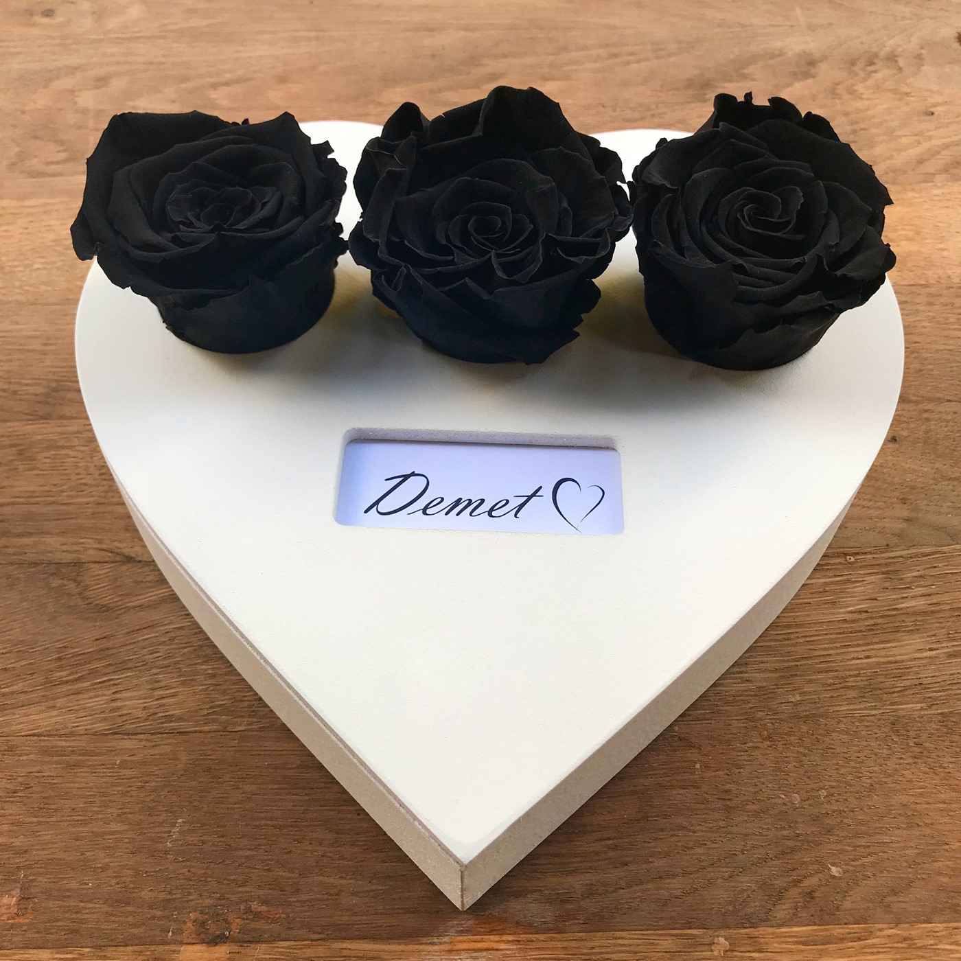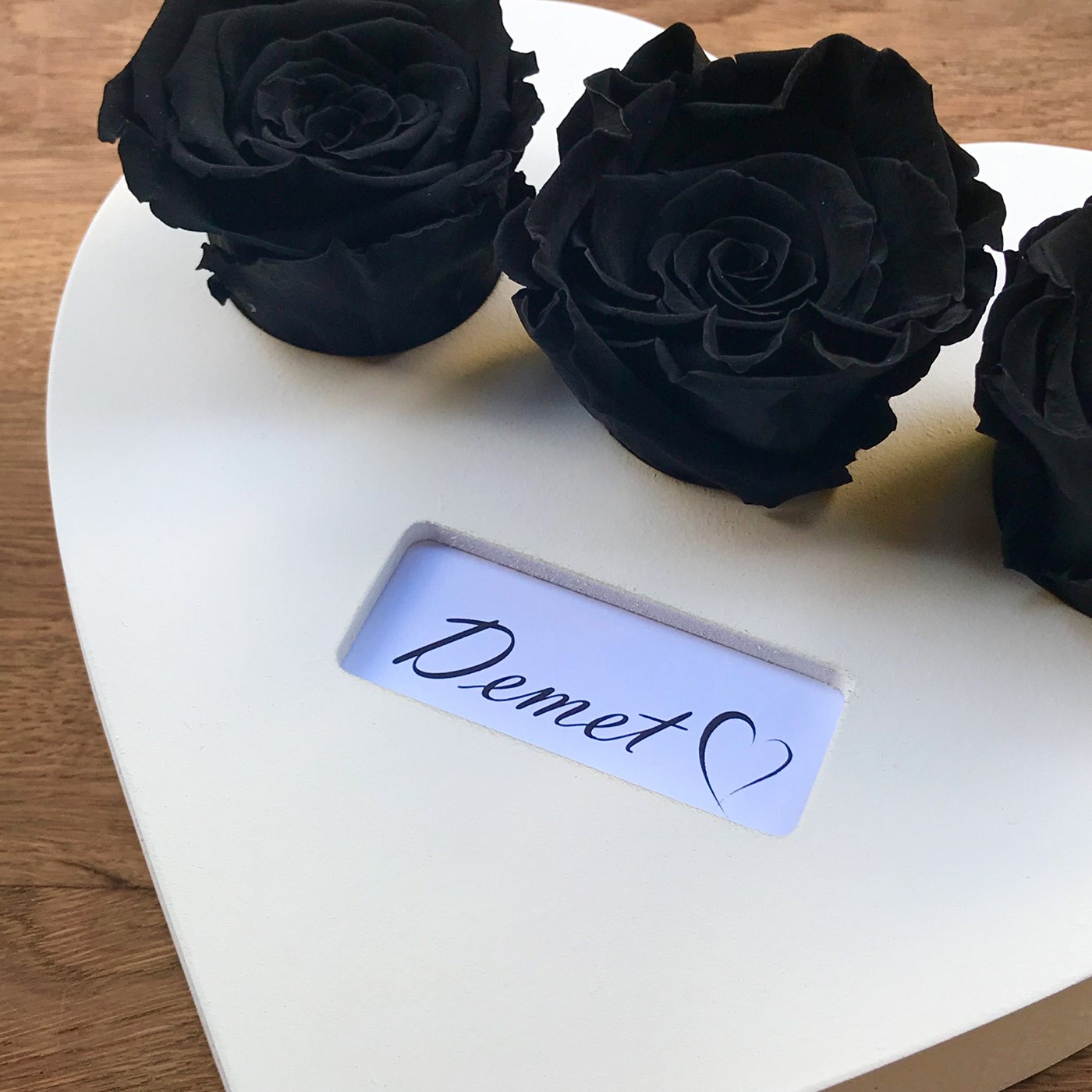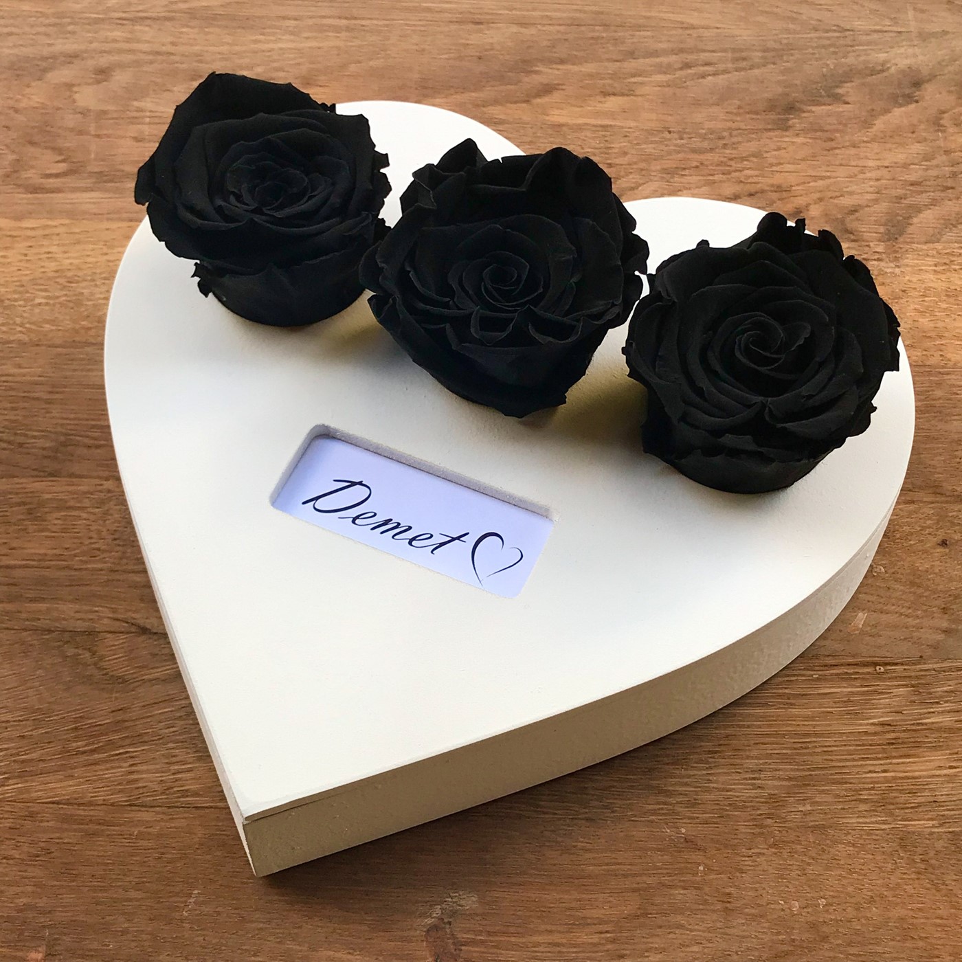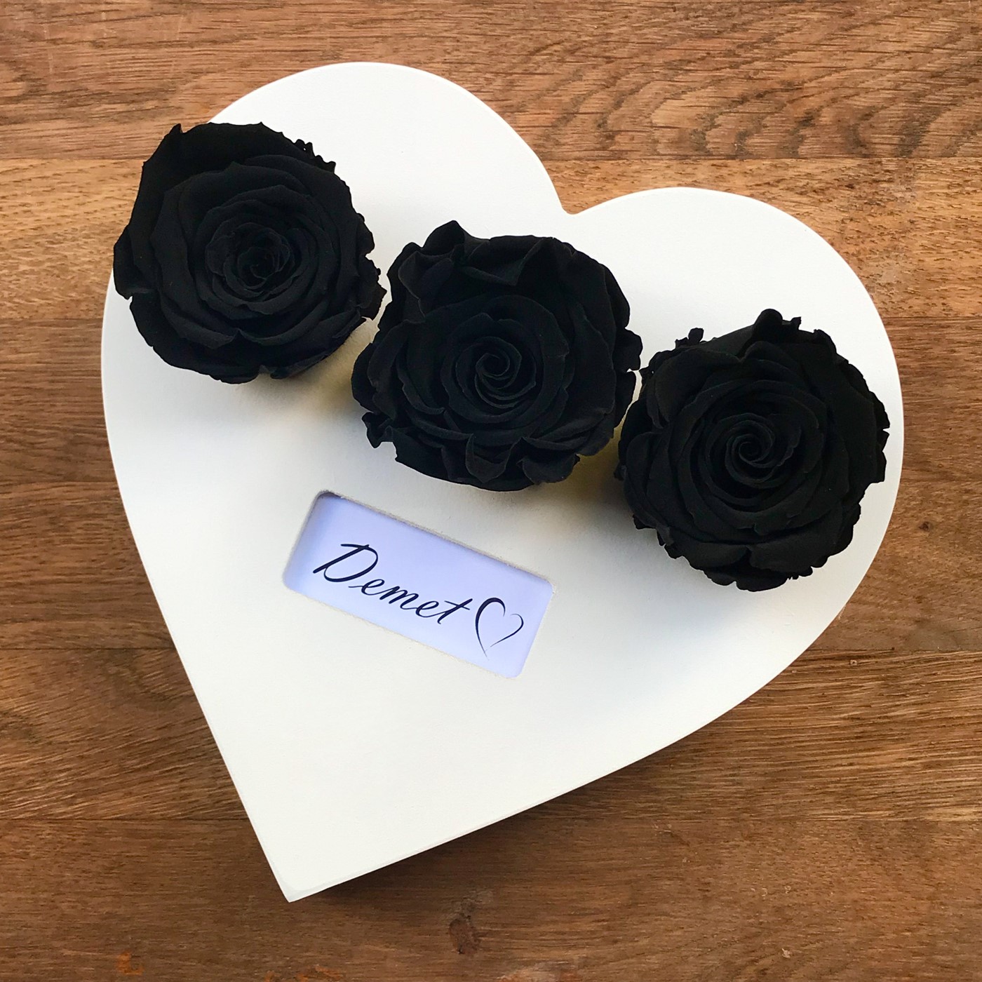 Özel üretim beyaz renkte kalp formlu ahşap platform üzerinde 3 adet siyah XL boy solmayan gül ile hazırlanmıştır. Ahşap platform üzerinde standart isim kartı yer alır. Kalp formlu platformun yaklaşık boyutları: 20 x 20 cm ve yükseklik 3.5 cm’dir. Hediyeniz "özel tasarım" hediye kutusunda teslim edilir. *Solmayan güller özenle seçilen ve özel işlemden geçirilen gerçek Ekvator gülleridir. Nem ve direk güneş ışığından korunarak, hiçbir bakıma gerek duymadan 3 yıla kadar görünümlerini koruyabilirler.