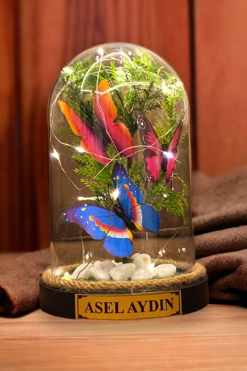 Kap : 20 x 20 cm. siyah cam Bitki : Haworthia Sukulent Aksesuarlar : El yapımı minyatür ev (bungalov / tiny house), minyatür çakıl taşı figürleri, minyatür kırmızı mantar ve isme özel hazırlanan ahşap bahçe tabelası (Tüm aksesuarlar fiyata dahildir )