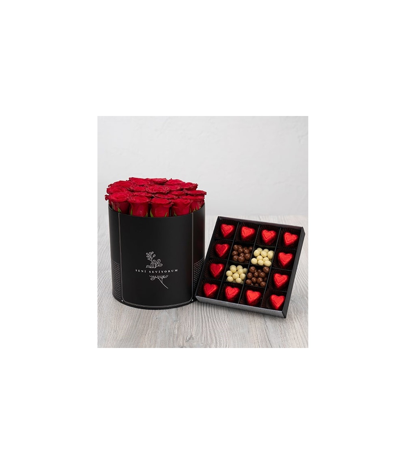 Kutu Ölçüsü: 18*18*18 cm (en*boy*yükseklik) Gül Adeti:17-20adetarası . 12 adet kalp çikolta ve sütlü ve çikolatalı draje Not: Güllerin renk tonları ve boyutları mevsim koşullarına göre değişiklik gösterebilir.