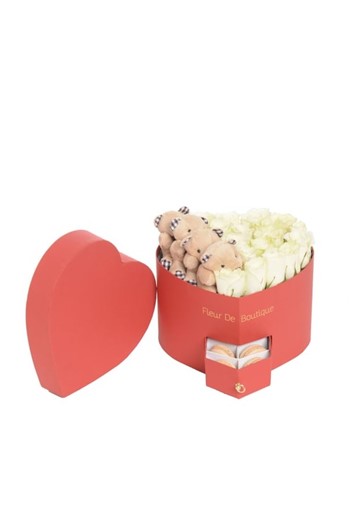 55 cm çapındaki büyük siyah kalp kutuda beyaz papatyalar, pembe güller ve ayıcıklarla kombin edilmiştir. papatya rengi : beyaz gül rengi : pembe gül adeti : 12 ayıcık adeti : 9