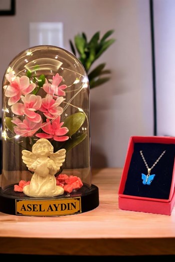 Canım Arkadaşım Temalı Led Işıklı Fanus - Zambak Çiçekli ve Kelebek Kolyeli