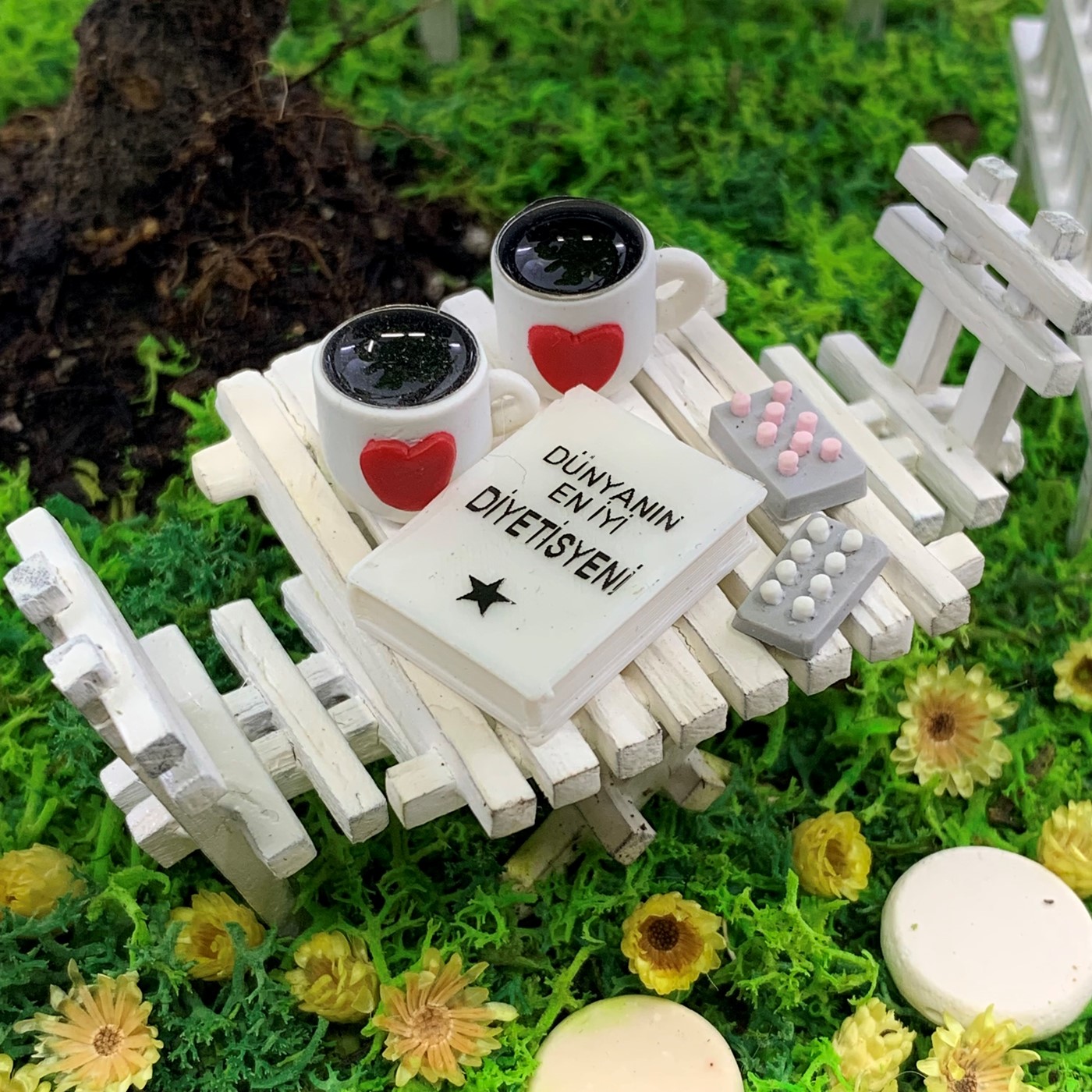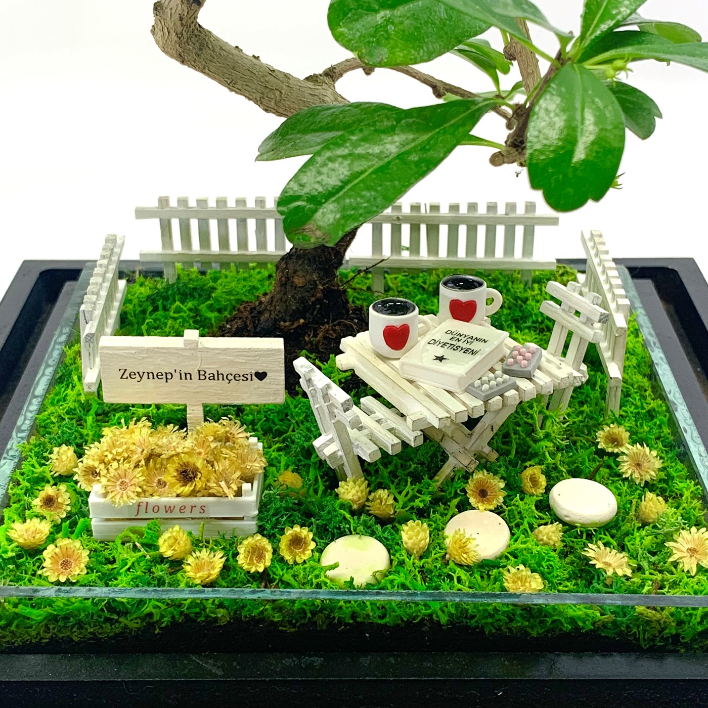 Aksesuarlar : El yapımı ahşap bahçe çitleri, el yapımı ahşap masa ve sandalyeler, masa üzerinde minyatür kitap, fincanlar ve minyatür ilaç figürleri, el yapımı ahşap kasa içerisinde gerçek kurutulmuş minik sarı çiçekler, el yapımı minyatür taş figürleri, isme özel hazırlanan bahçe tabelası (Tüm aksesuarlar fiyata dahildir)
