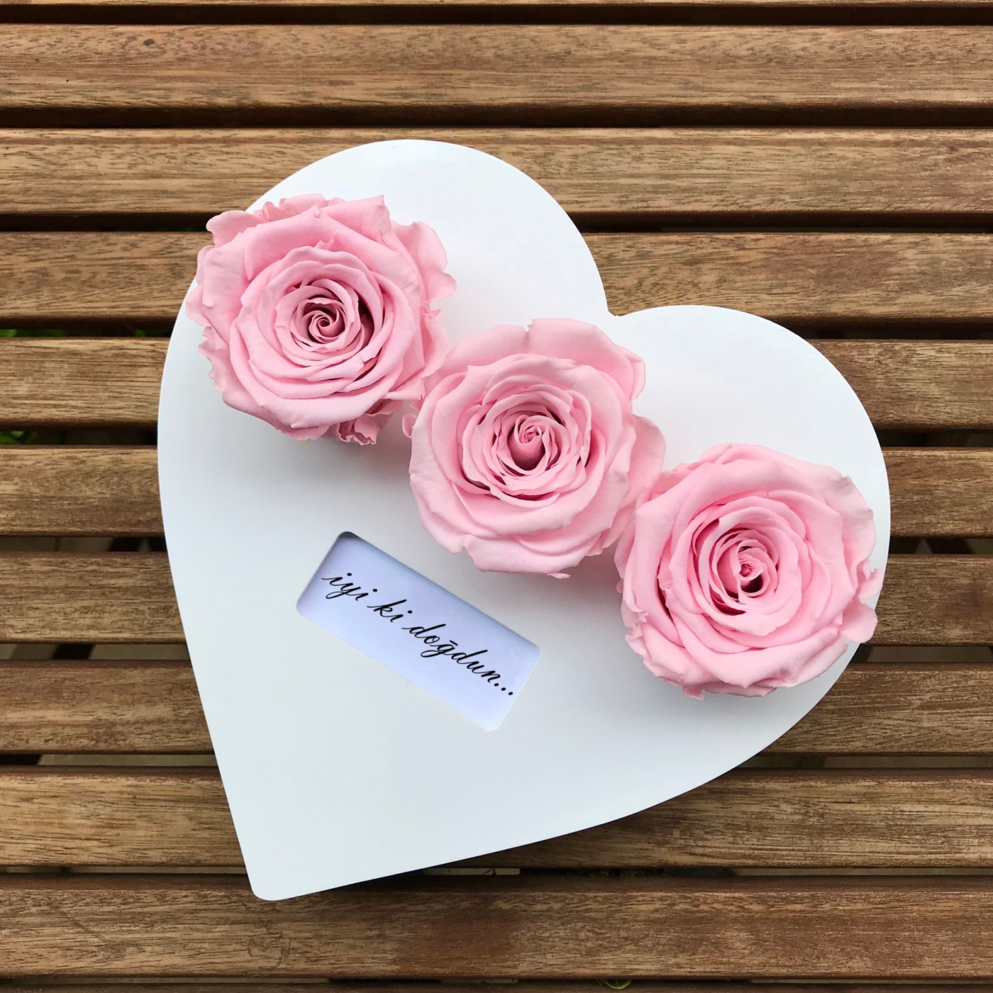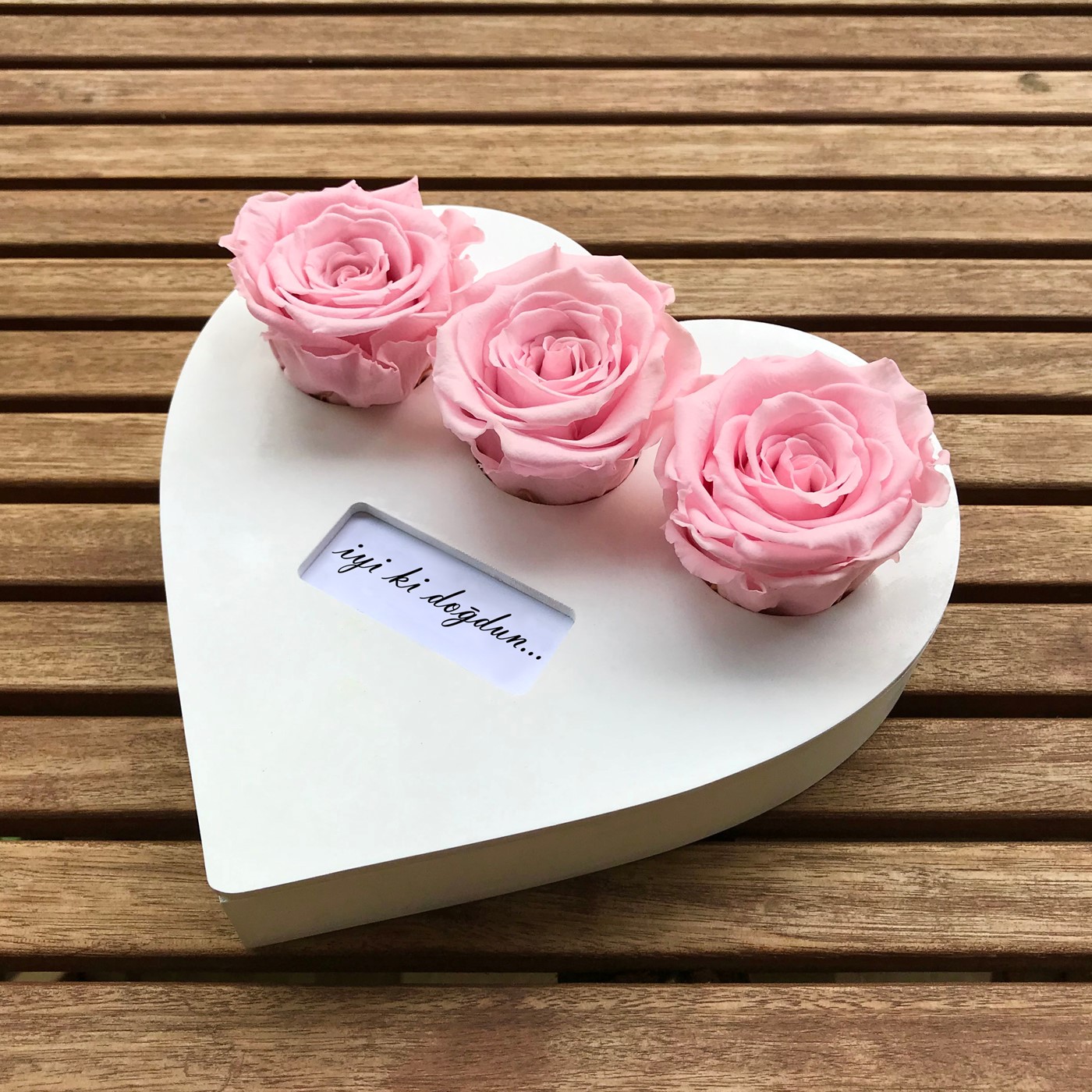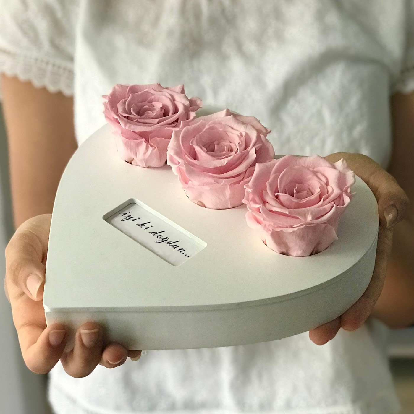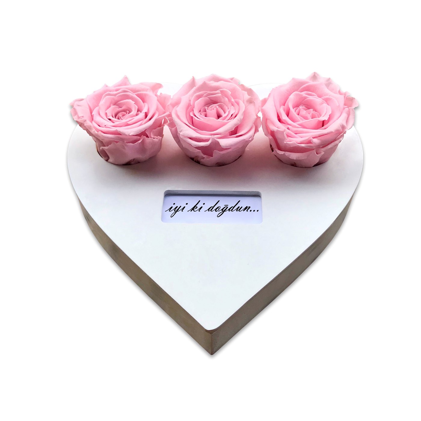 Özel üretim beyaz renkte kalp formlu ahşap platform üzerinde 3 adet pembe XL boy solmayan gül ile hazırlanmıştır. Ahşap platform üzerinde "İyi ki Doğdun..." yazan kart yer alır. Kalp formlu platformun yaklaşık boyutları: 20 x 20 cm ve yükseklik 3.5 cm’dir. Hediyeniz "özel tasarım" hediye kutusunda teslim edilir. *Solmayan güller özenle seçilen ve özel işlemden geçirilen gerçek Ekvator gülleridir. Nem ve direk güneş ışığından korunarak, hiçbir bakıma gerek duymadan 3 yıla kadar görünümlerini koruyabilirler.
