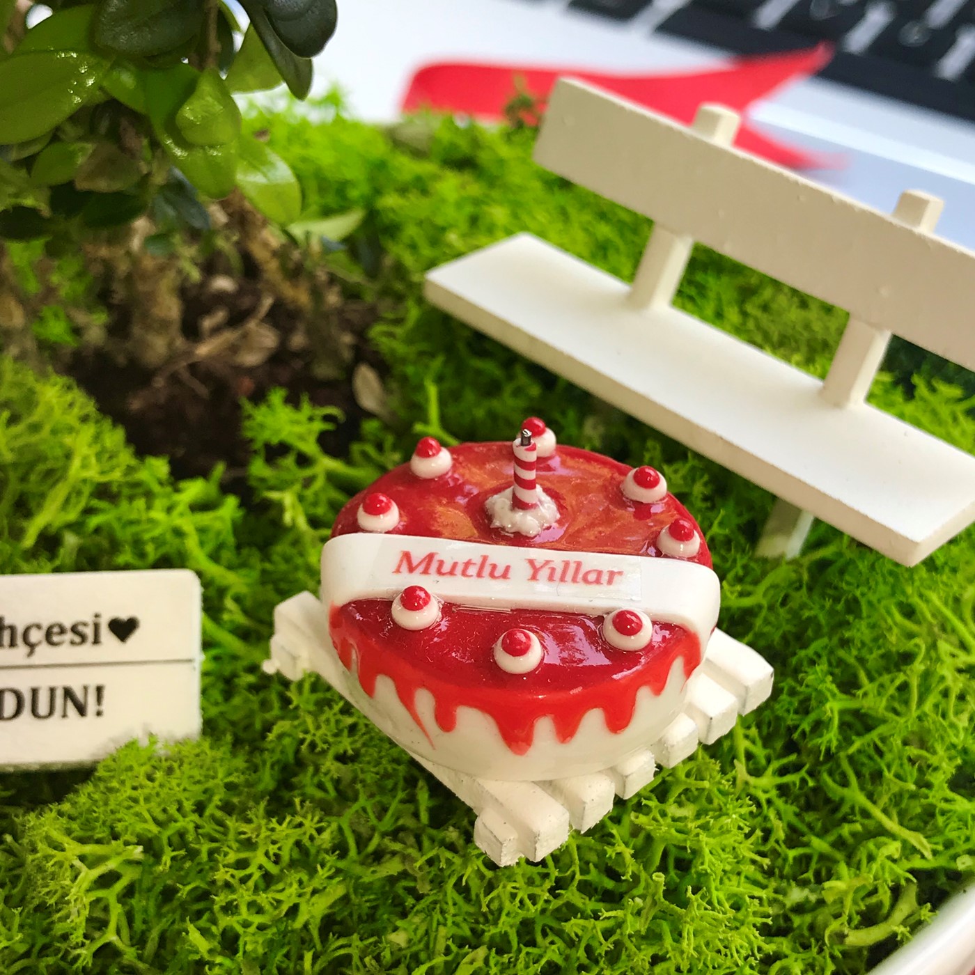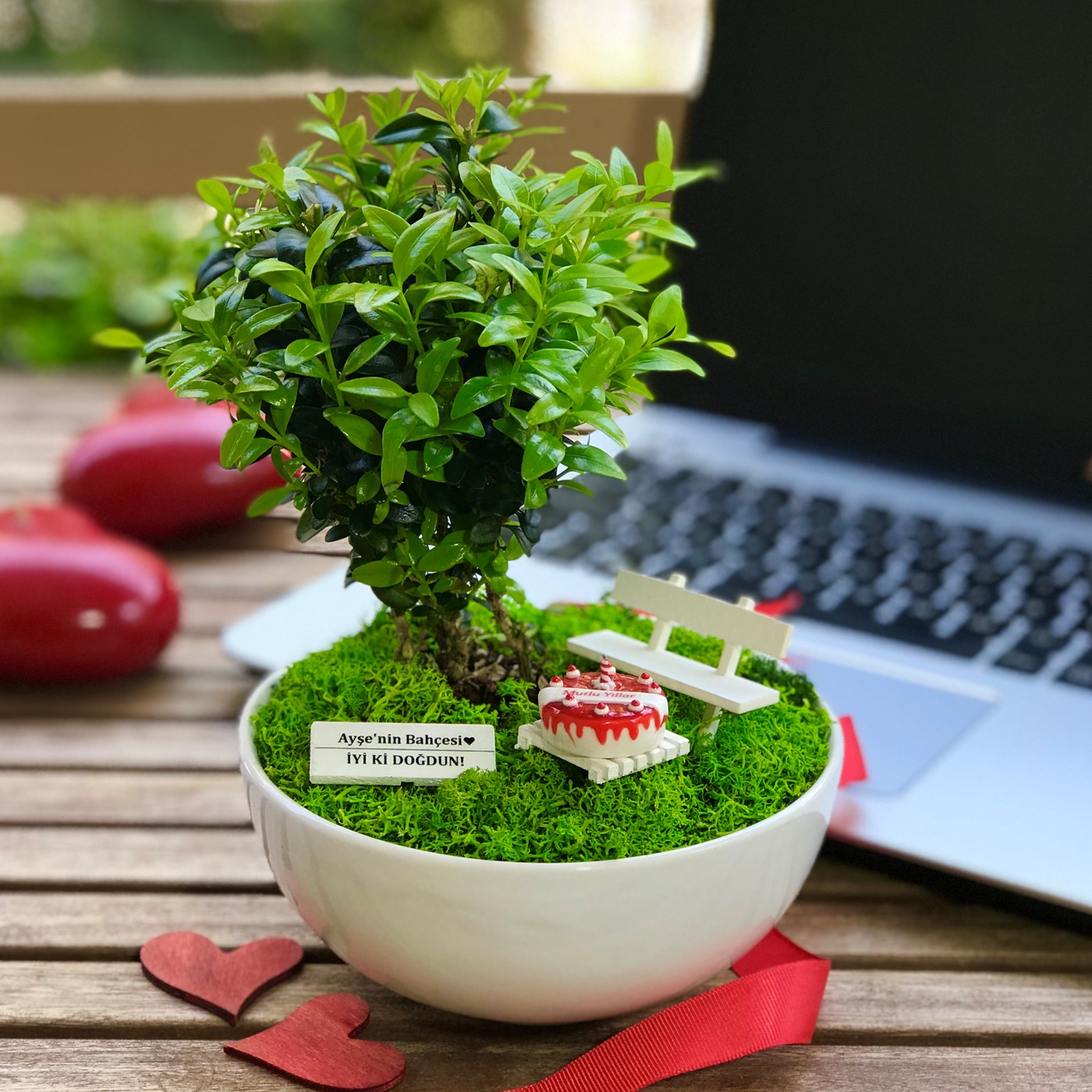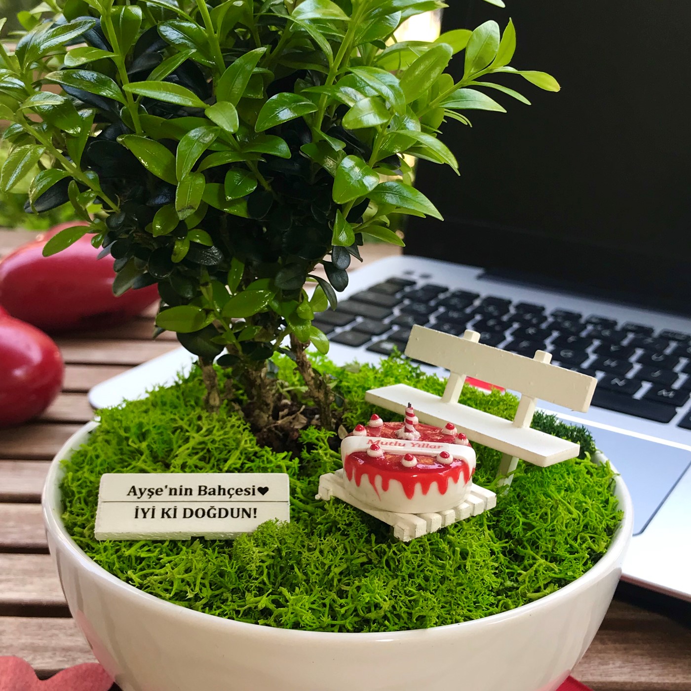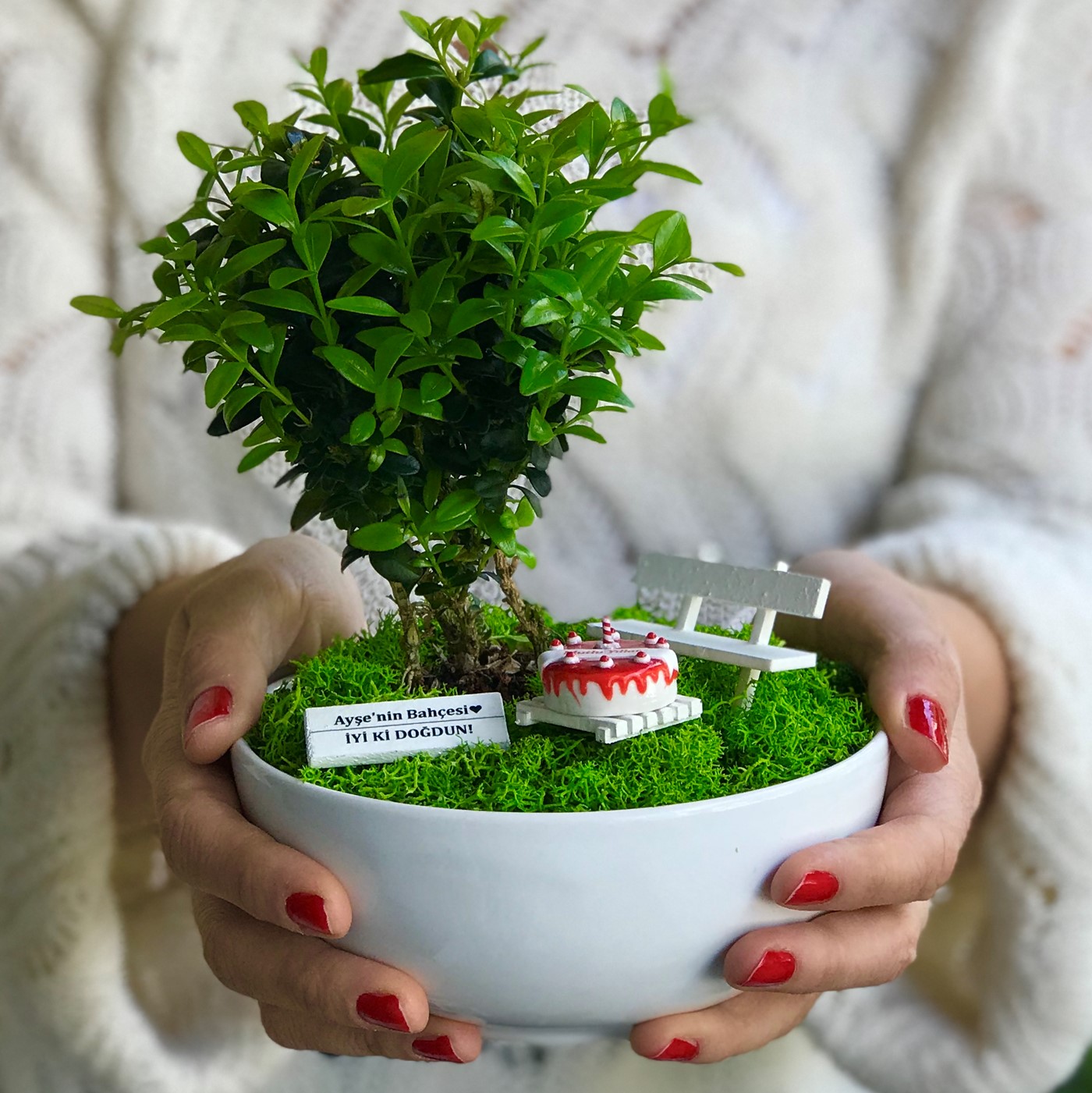 Kişiye Özel Doğum Günü İçin Bonsai Bahçesi Bu orijinal tasarım yıllarca unutulmayacak eşsiz bir hediye arayanlar için canlı bitkiler ve ahşap mobilyalarla hazırlanmıştır. El emeği ile üretilen şeyler her zaman özeldir. Minyatür bahçeniz, sevdiklerinizin gününü güzelleştirmek için özenle seçilen bitkiler ve tek tek elde hazırlanan aksesuarlarla tamamlanır. Minyatür bahçe, yaklaşık 13 cm çapında 6 cm yüksekliğinde benzer formdaki porselen ya da seramik kaplarda Buxus Sempervirens türü bitki ile hazırlanır. Bahçede el yapımı ahşap bank, ahşap sehpa ve üzerinde el yapımı çilekli pasta figürü bulunmaktadır. (Pasta polimer kilden yapılmıştır. Gerçek pasta değildir. Yenmez.) Zarif hediyeniz, Kişiye Özel hazırlanan şık bir bahçe tabelası ile tamamlanmaktadır. Büyük bölümü tek tek elde hazırlanan minyatür aksesuarların tasarımlarında değişiklikler ya da milimetrik ölçü farklılıkları bulunabilir. Bakım: Minyatür bitki canlıdır. Bol gün ışığı alan dış mekanlar için uygundur. Minyatür bahçenin zemininde canlı ya da şoklanmış yosun kullanılır. Yosunlar zamanla renk ve dokularını kaybedebilir.
