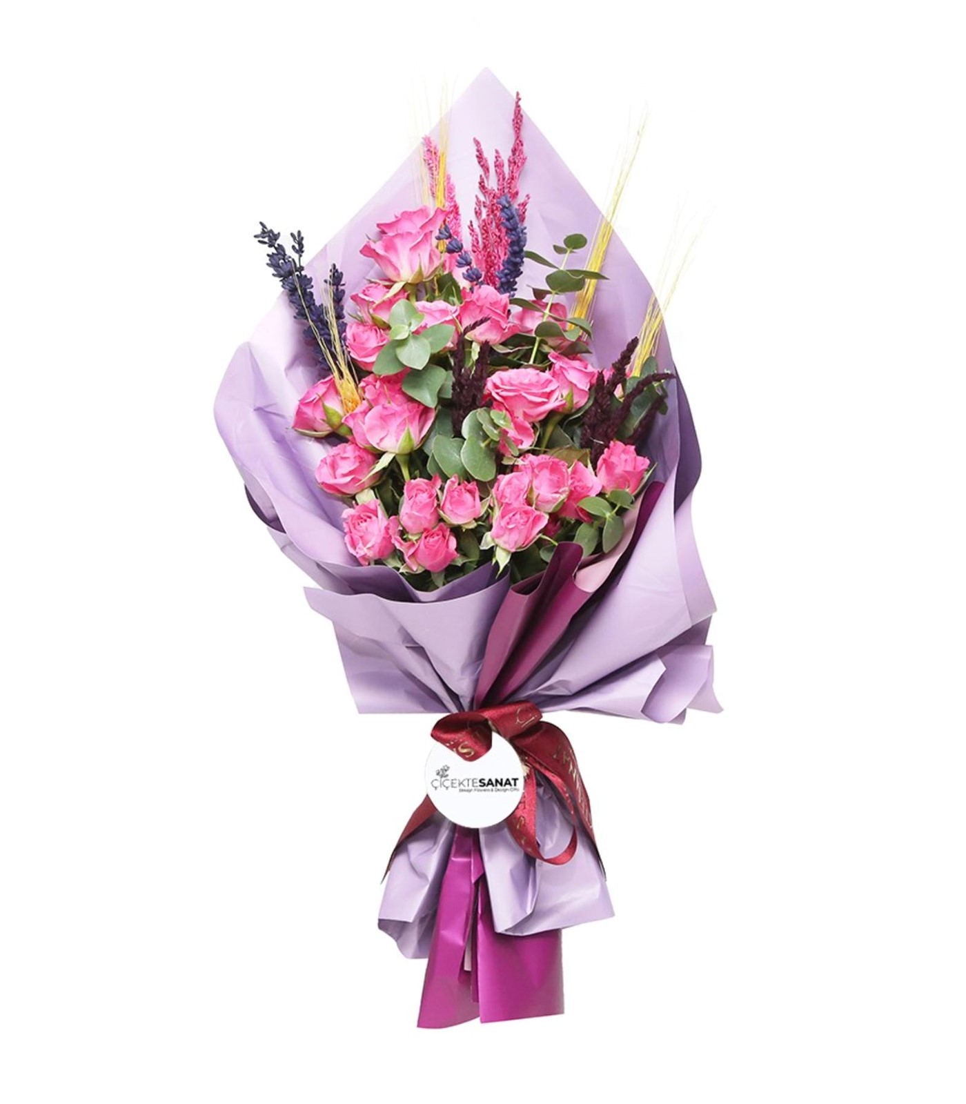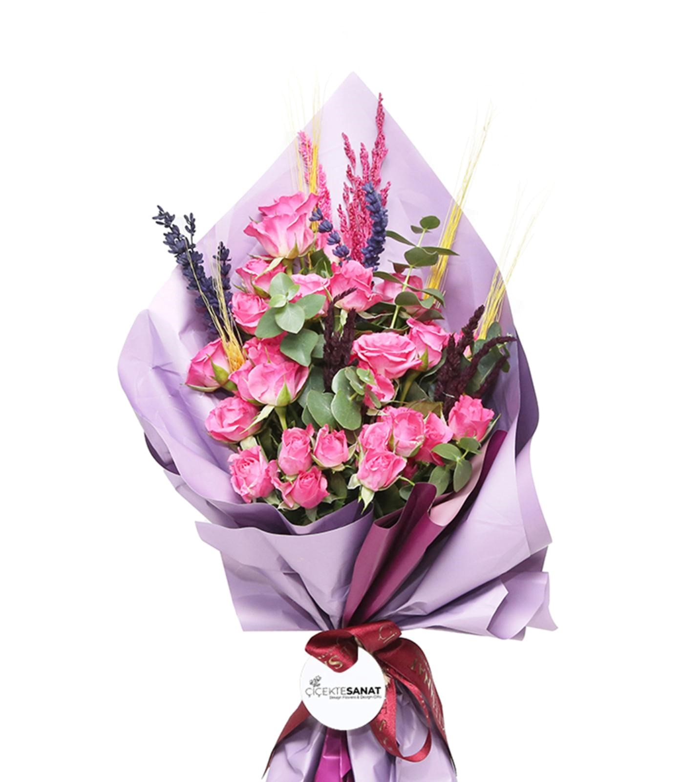Festive Joy Gül Buketi, Floral Designers ekibimizin Pembe Çadak Güller ve Okaliptüslerin birleştiği çiçek buket tasarımıdır.