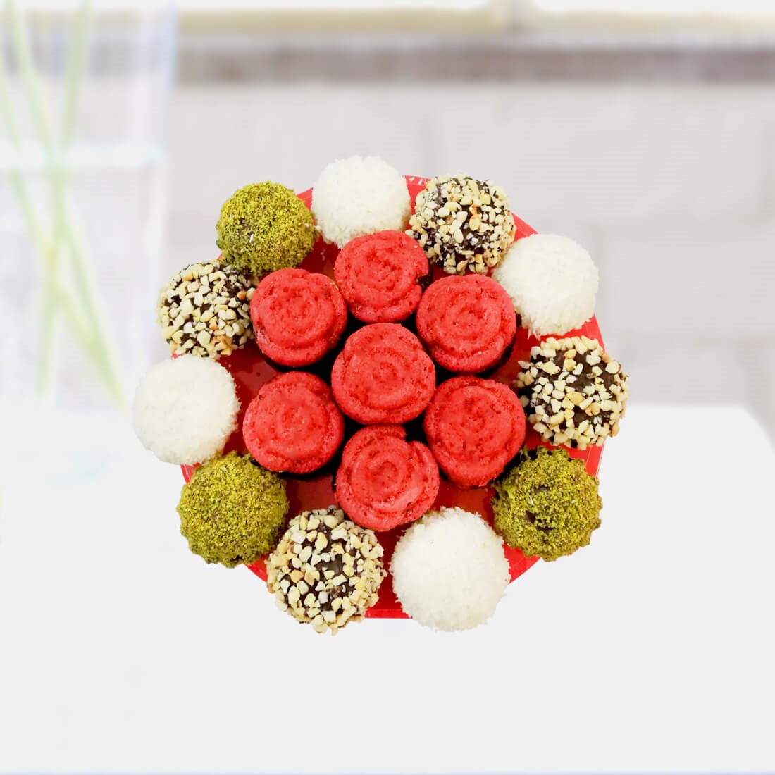 Ürünümüzde yaklaşık 11 adet çikolatalı ,fıstıklı, fındıklı ve hindistan cevizli kurabiye ve 7 adet kırmızı gül kek bulunmaktadır.. Strafor çapı 18 cm dir.