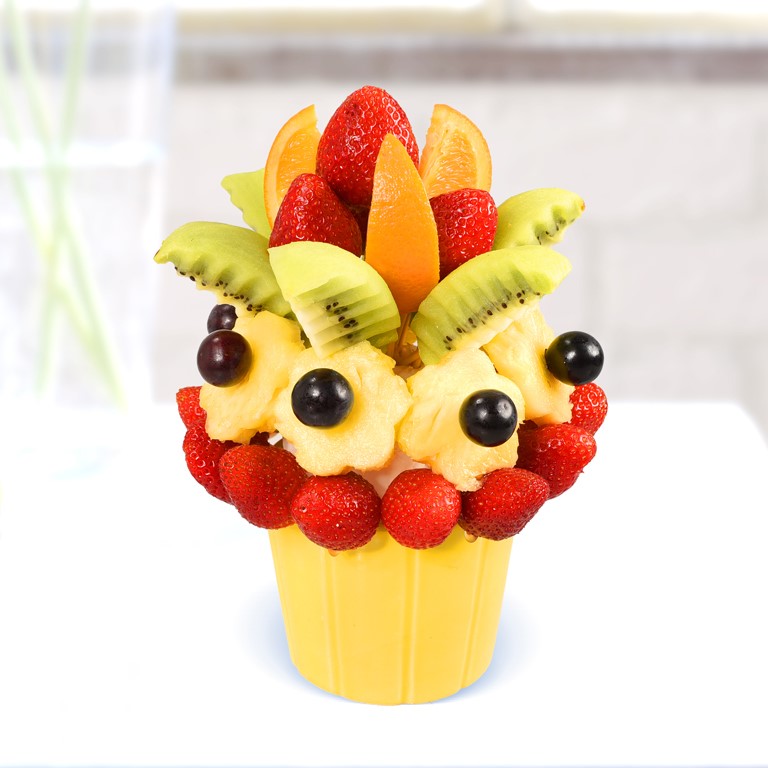 Ürünümüzde yaklaşık olarak 18 adet sade çilek, 7 adet ananas, 7 adet dilim kivi, 3 adet dilim portakal, 7 adet üzüm bulunmaktadır. Saksı çapı 10 cm, yüksekliği 8 cm’dir.