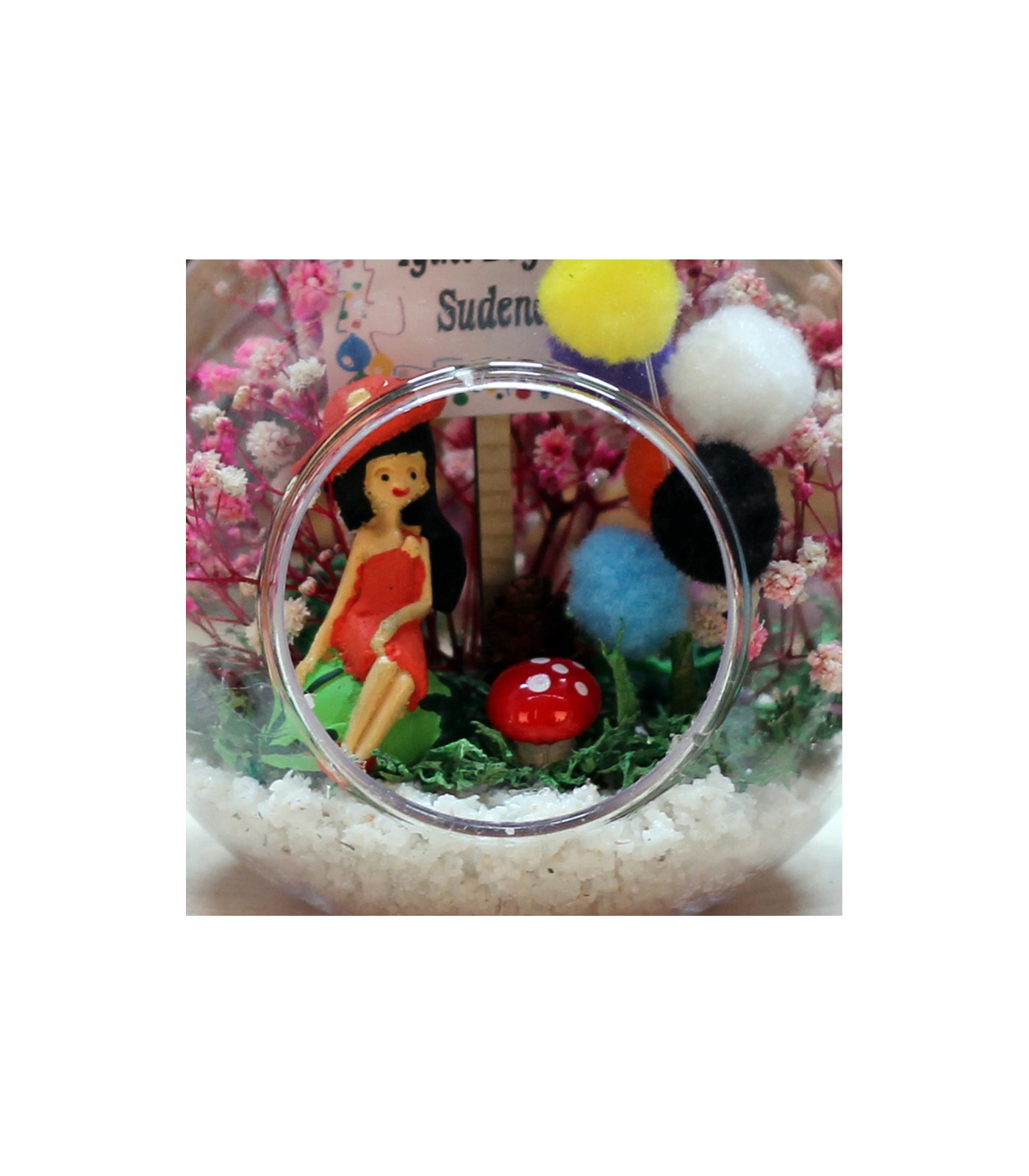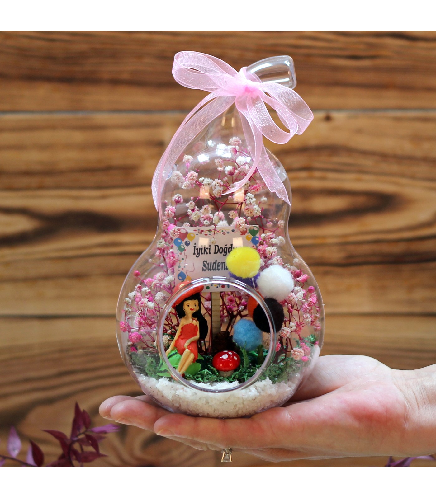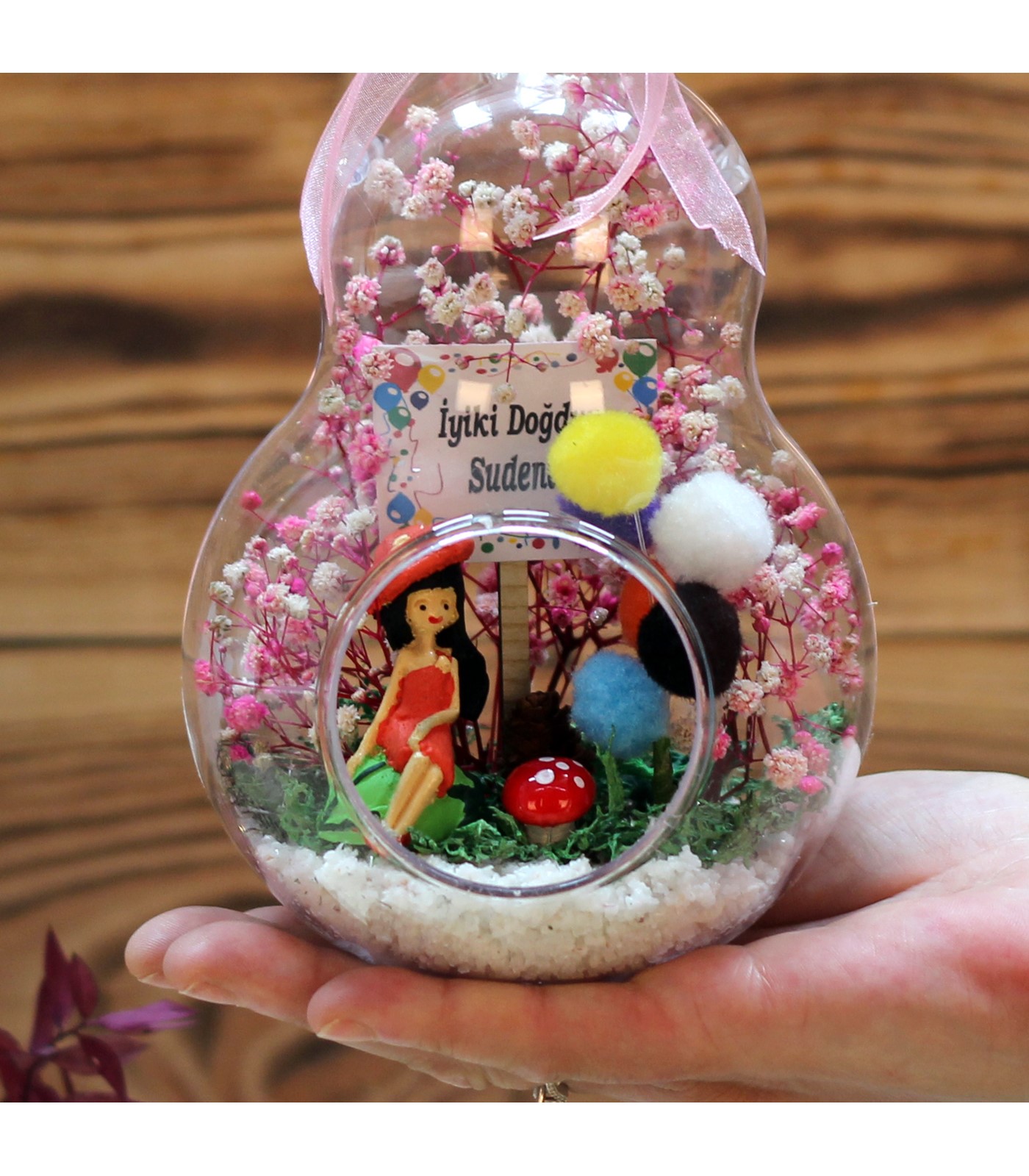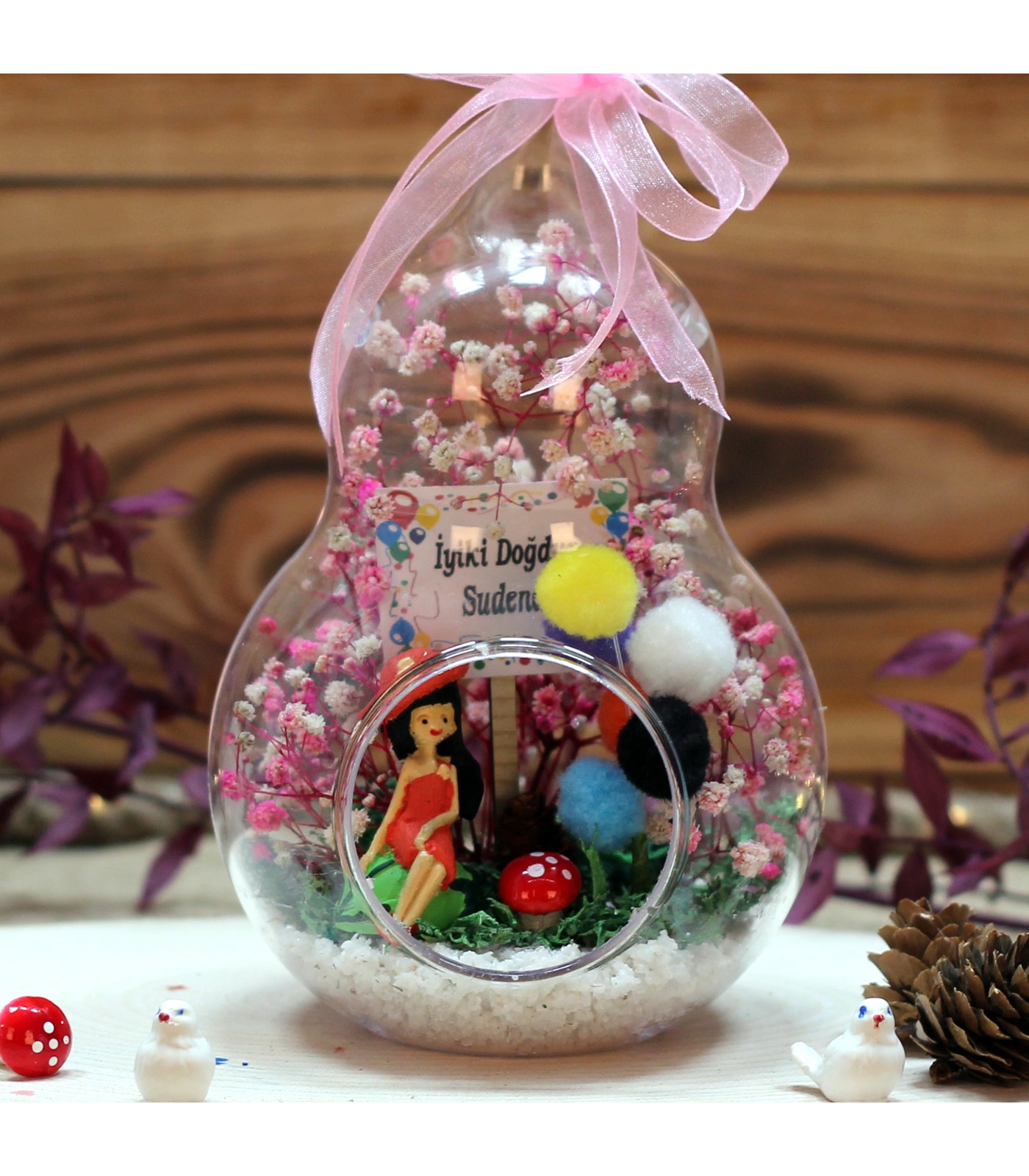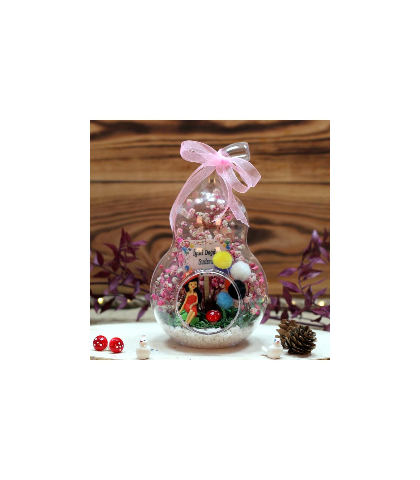 renkli balonlar, kurutulmuş bitki ve şoklanmış yosunla beraber,kum,mantar,kurdele kullanılarak elde hazırlanmıştır. Arkadaş-genç kız temalı biblo,1 adet iyiki doğdun panosu kullanılmıştır.