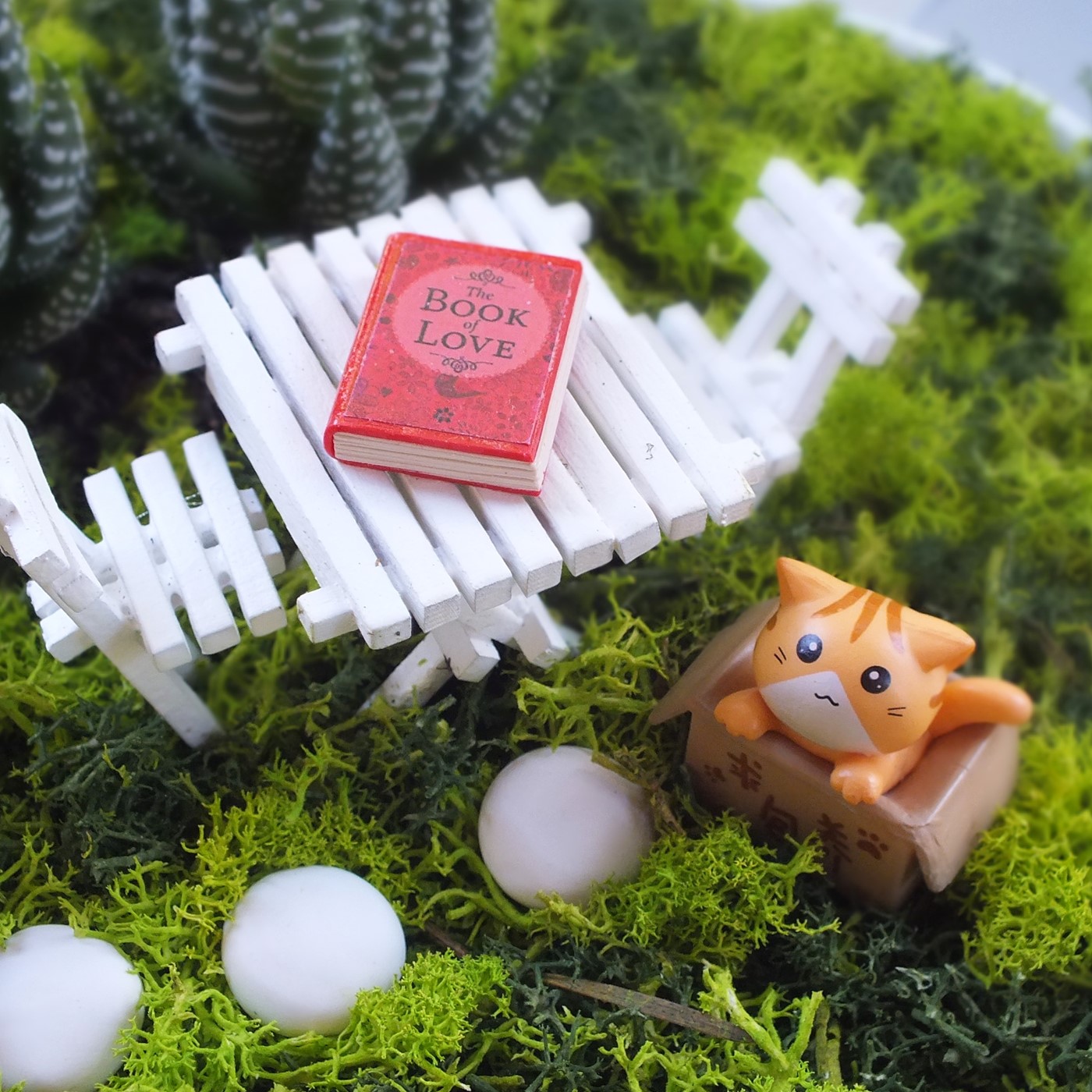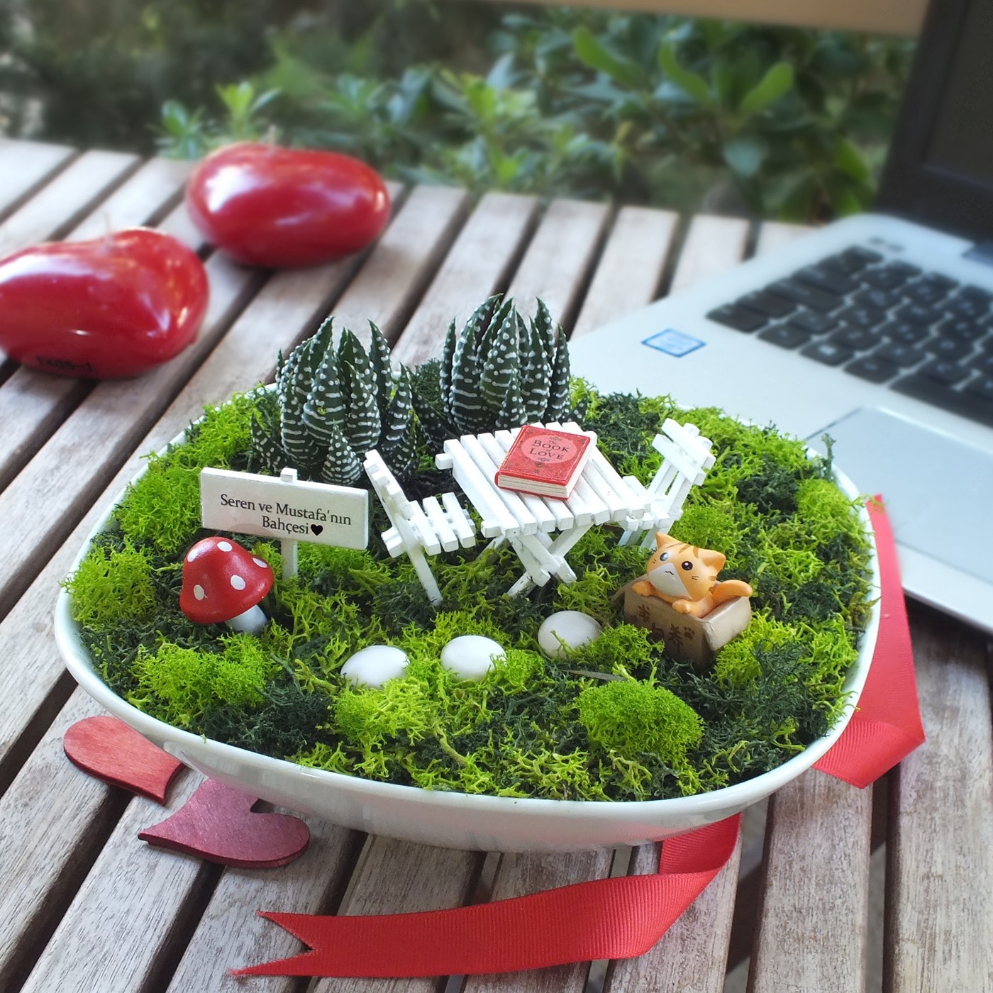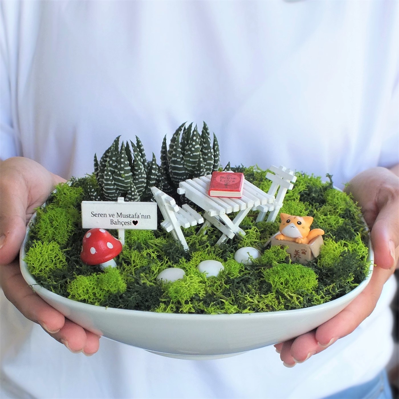 Kap : 20 x 20 cm. beyaz seramik kap Bitki : Haworthia – Sukulent Aksesuarlar : El yapımı ahsap masa ve sandalyeler, masa üzerinde minyatür kitap “The Book of Love” zeminde isme özel hazırlanan bahçe tabelası, el yapımı minyatür mantar, çakıl taşları ve minyatür kedi figürü (Tüm aksesuarlar fiyata dahildir) Bakım : Minyatür bitkiler canlıdır. Bol gün ışığı alan iç mekanlar için uygundur. Detaylı bakım kılavuzu bahçe ile birlikte gönderilir.