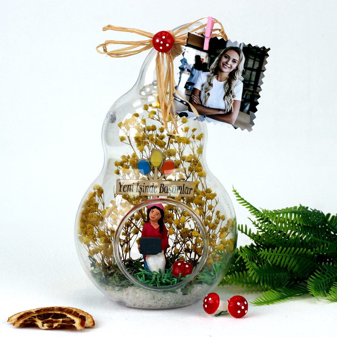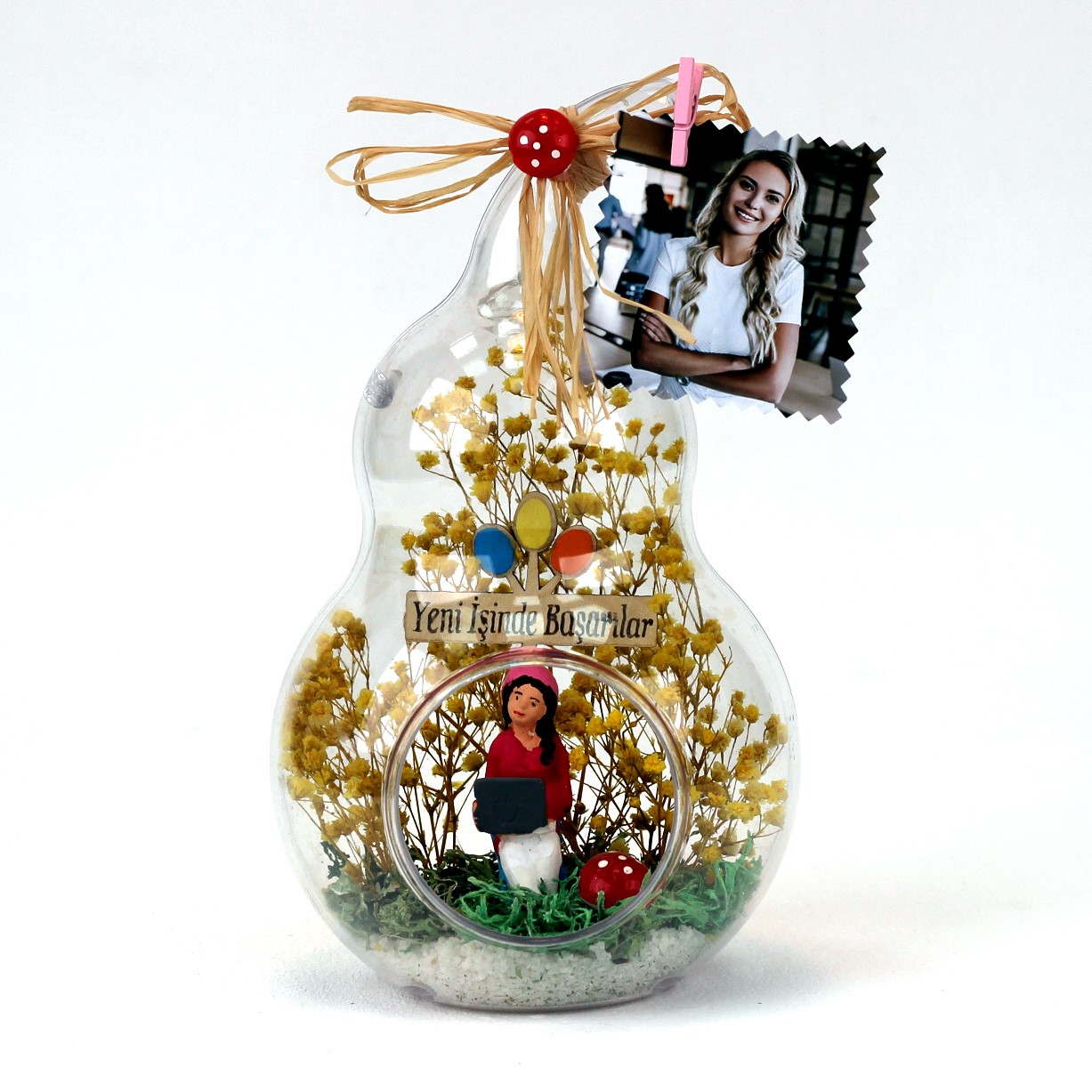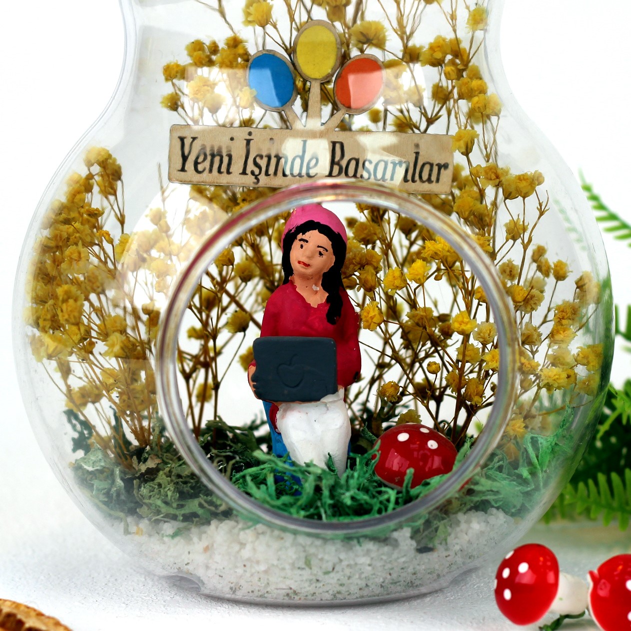 >Arkadaşa hediye ,yeni iş hediyesi, arkadaşınıza hediye,teraryum,arkadaşınıza iş hediyesi olarak armağan edebileceğiniz göz alıcı mutluluk dolu unutulmaz bir hediye...</p> <p>Ürün özellikleri:<br> Teraryum fanus bölümü abs’den yapılmış modelimizde :şoklanmış cipso ve şoklanmış yosunla beraber,mantar, yeni işinde başarılar panosu, sevgili biblosu, ve sap kısmında doğal rafya kullanılmıştır.</p> <p><br> Her biri kendine özgü bir tasarım olup, son derece temiz ve titiz çalışılmaktadır.</p> <p>Ürünlerimizde doğal malzemeler kullanıldığı için renkler stok durumuna göre -çok nadir- değişiklik gösterebilir.</p> <p>Ürün Ölçüleri:En:13cm - Boy:13cm - Yükseklik:23cm'dir.ÜRÜNE FOTOĞRAF EKLEYEREK KİŞİSELLEŞTİREBİLİRSİNİZ.