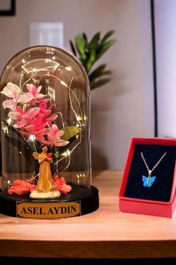 Kişiye Özel Çiçekli Mutlu Ayıcık Temalı Fanus - Led Işıklı ve Kelebek Kolyeli