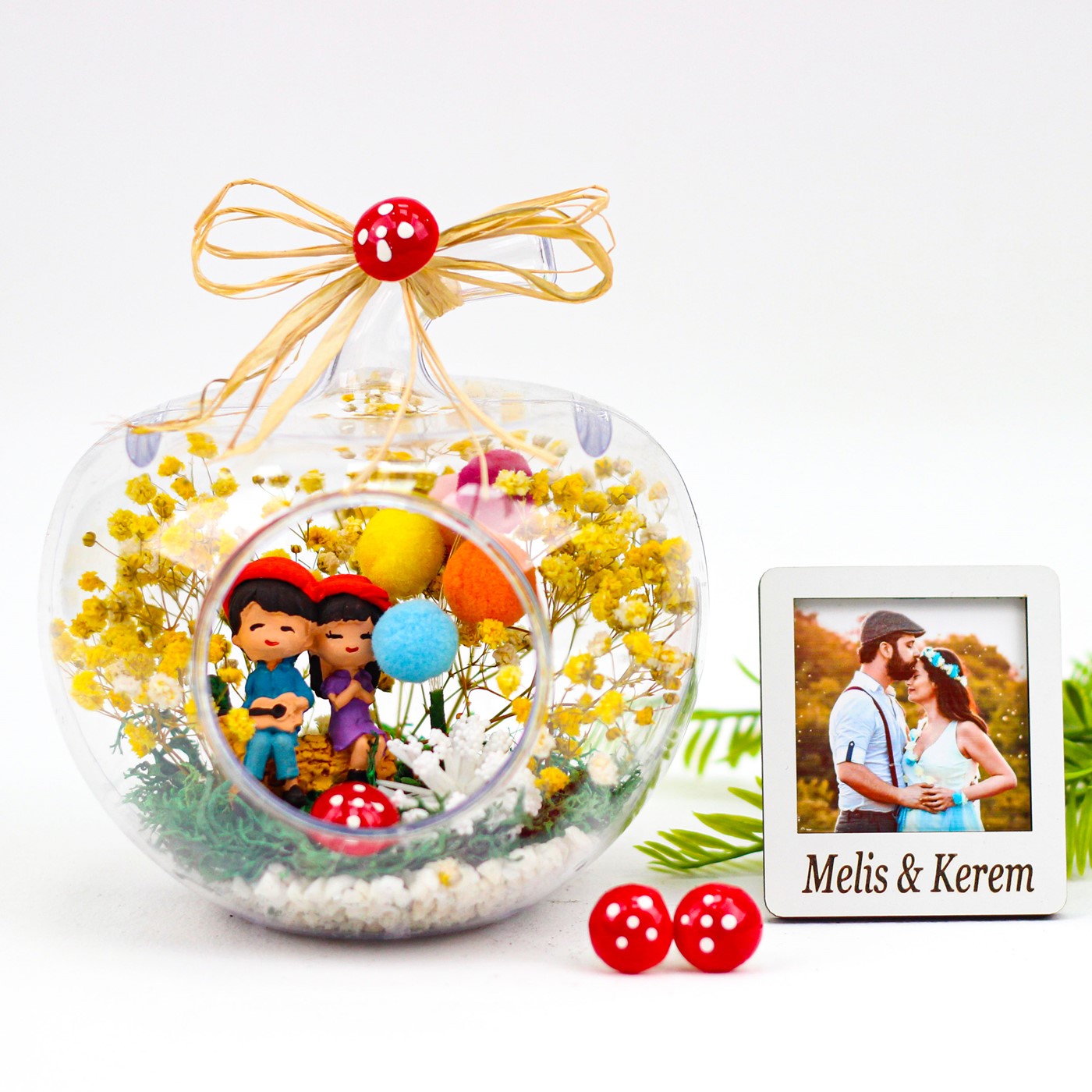 Sevgiliye hediye ,sevgililer günü hediyesi, arkadaşa hediye,teraryum,sevgiliye teraryum olarak armağan edebileceğiniz göz alıcı mutluluk dolu unutulmaz bir hediye Ürün özellikleri: Teraryum fanus bölümü abs’den yapılmış modelimizde tasarlanmış ürünümüz; renkli balonları, kurutulmuş bitki ve şoklanmış yosunla beraber,taş,kozalak,kuru ağaç kabuğu kullanılarak elde hazırlanmıştır. Sevgili biblosu,3 farklı şekilde yanan peri led ışık, mantar,gelincik figürleri ve sap kısmında doğal rafya kullanılmıştır.Yüklenecek fotoğraf yüksek çözünürlük olması önerilir. Fotoğraflarınız 6cm x 6cm ebatlarında polo kart olarak basılmaktadır.Her biri kendine özgü bir tasarım olup, son derece temiz ve titiz çalışılmaktadır.Ürünlerimizde doğal malzemeler kullanıldığı için renkler stok durumuna göre -çok nadir- değişiklik görülebilir.Ürün ölçüleri:En:13 - Boy:13 - Yükseklik:16'dirFotoğraf çerçevesi : En: 7cm Boy:8cm'dir.
