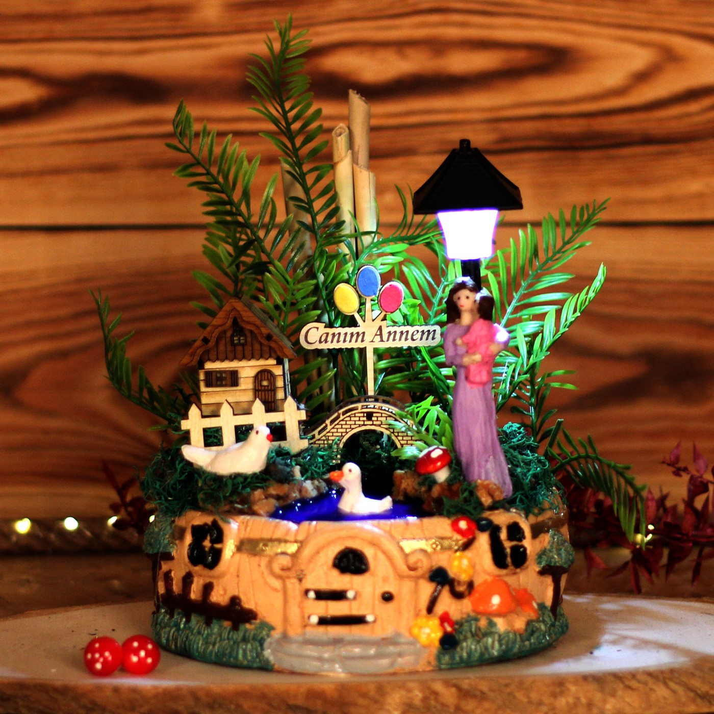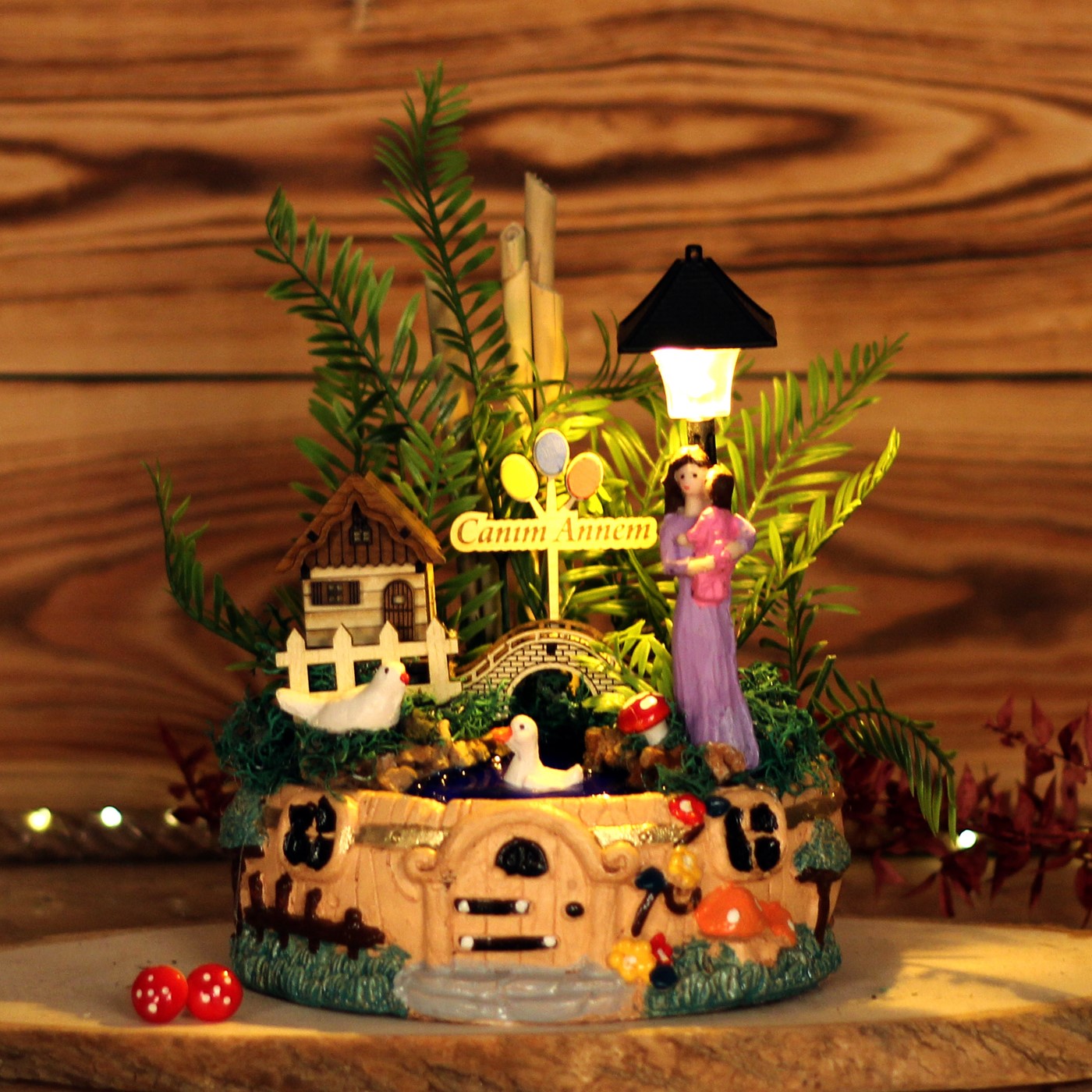 Anneler gününe özel teraryum,teraryum,anneye teraryum ,arkadaşa hediye,Hayattaki en büyük şansınız olan sevdikleriniz için, her baktıklarında yüzlerini gülümsetecek bir hediye</p> <p>Ürün özellikleri:</p> <p>Ürünümüz mantar saksı olarak içerisinde bir adet ahşap mini ev,ahşap çit,ahşap köprü,kuş,ördek,anne-çocuk biblosu,mini mantar figürlerive saat pili ile çalışan sokak lambası bulunmaktadır.Sokak lambası üst kısmında bulunan düğmeye nazikçe basıldığında,2 farklı sarı-beyaz soft renk veren ışığı yanmaktadır.</p> <p>Her biri kendine özgü bir tasarım olup, son derece temiz ve titiz çalışılmaktadır.<br> Ürünlerimizde doğal malzemeler kullanıldığı için renkler stok durumuna göre -çok nadir- değişiklik görülebilir.</p> <p>Ürün Ölçüleri: En:17cm. Boy:17cm. Yükseklik:30 cm.'dir.