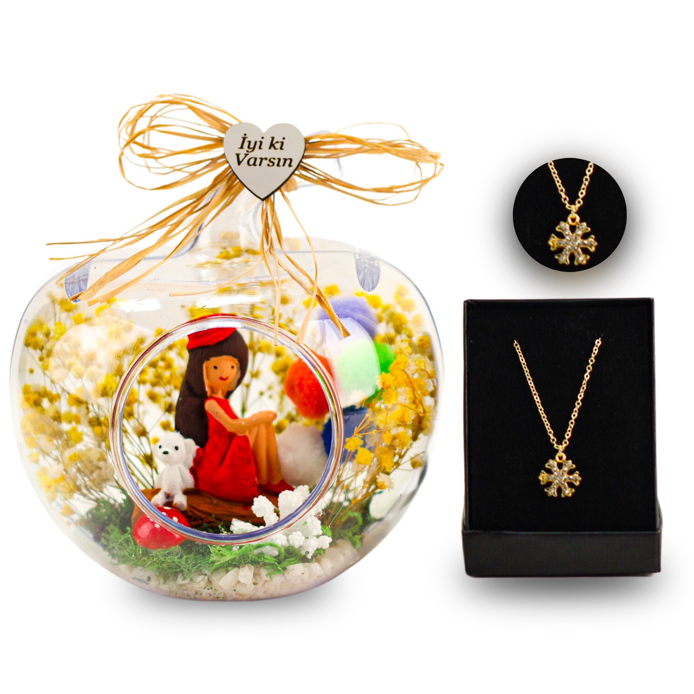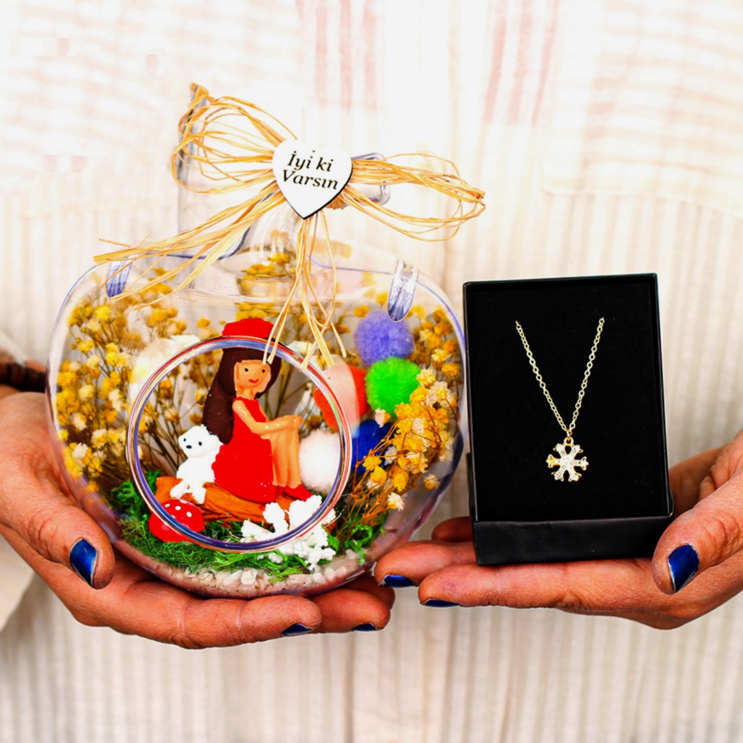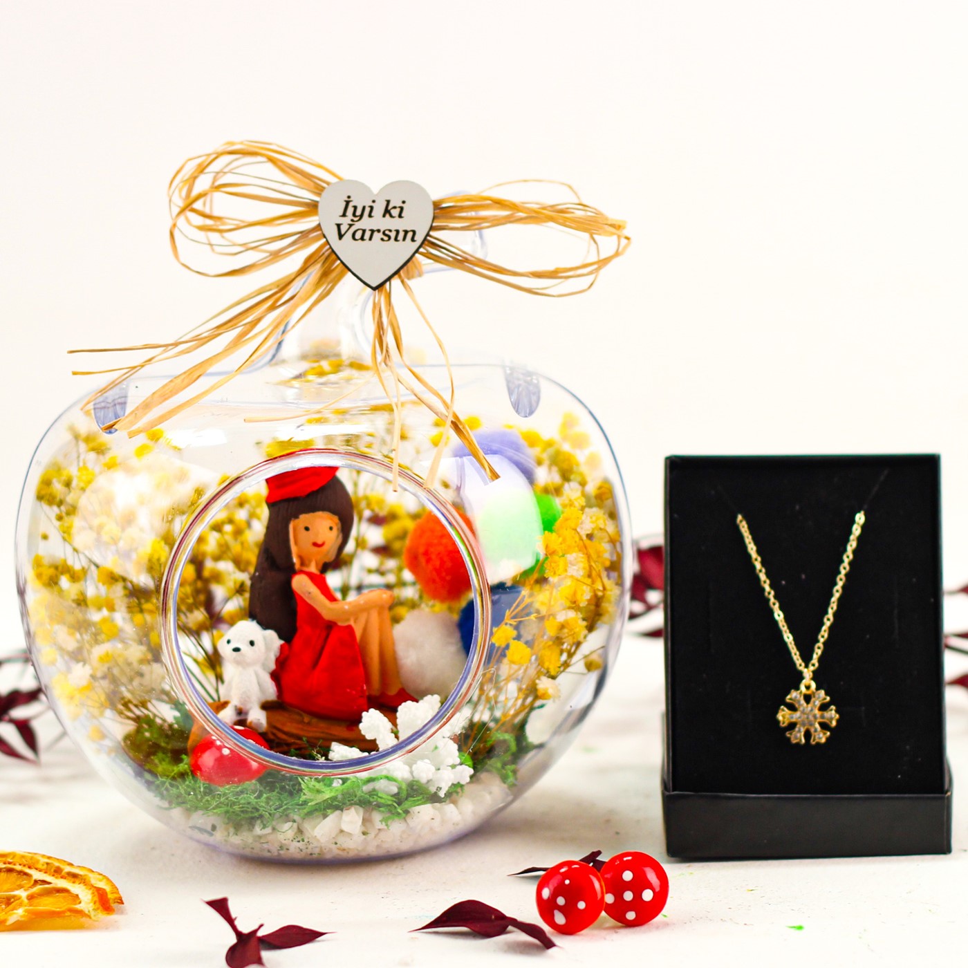 Arkadaşa hediye,kız arkadaşa hediye,teraryum,teraryum hediye,Dostluğunuz ve arkadaşlığınız için, küçük bir anı olarak,yüzde tebessüm yaratacak bir tasarımdır.Ürün Özellikleri:eraryum fanus bölümü abs’den yapılmış modelimizde : Renkli balonları, şoklanmış cipso ve şoklanmış yosun,mantar kullanılarak elde hazırlanmıştır. kız ve kedi biblosu, ve sap kısmında doğal rafya kullanılmıştır.Ürünlerimizde doğal malzemeler kullanıldığı için renkler stok durumuna göre -çok nadir- değişiklik gösterebilir.Her biri kendine özgü bir tasarım olup, son derece temiz ve titiz çalışılmaktadır.Zincir açık 40cm uzunluğunda olup, Kolye uçu 2cm ebatındadır.Ürün ölçüleri:En:13 - Boy:13 - Yükseklik:16'dir