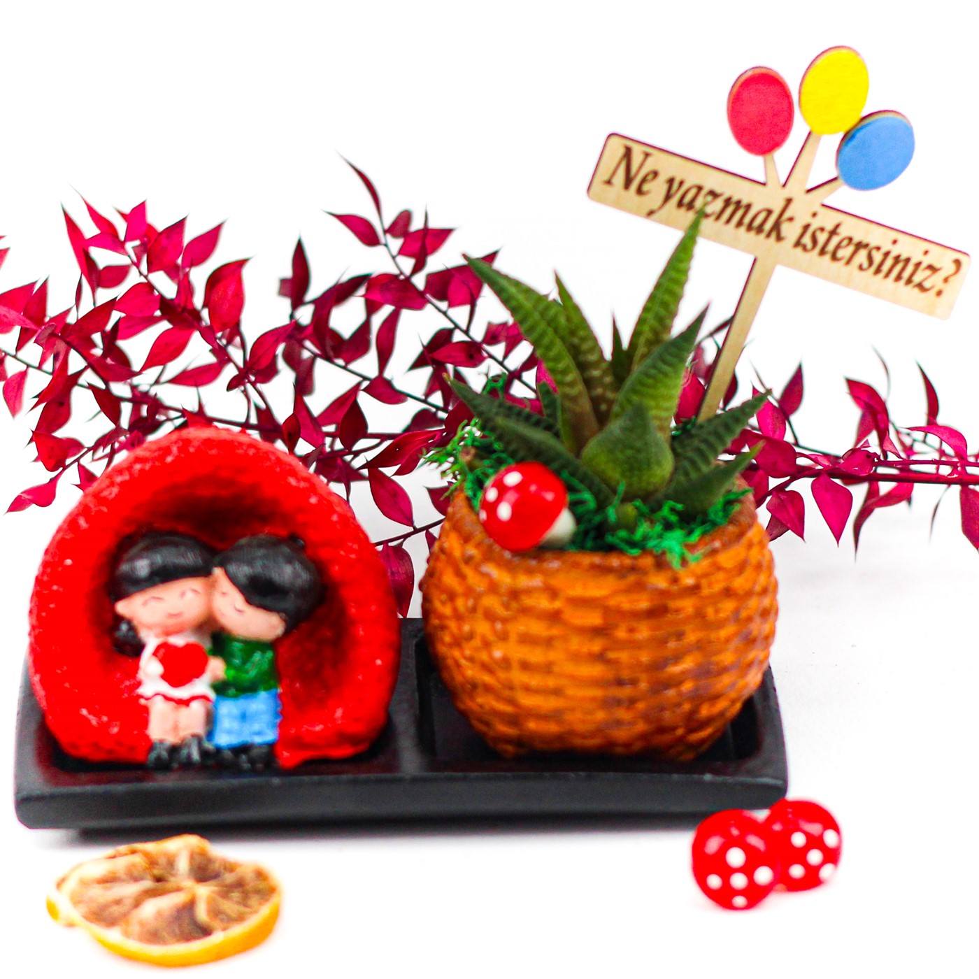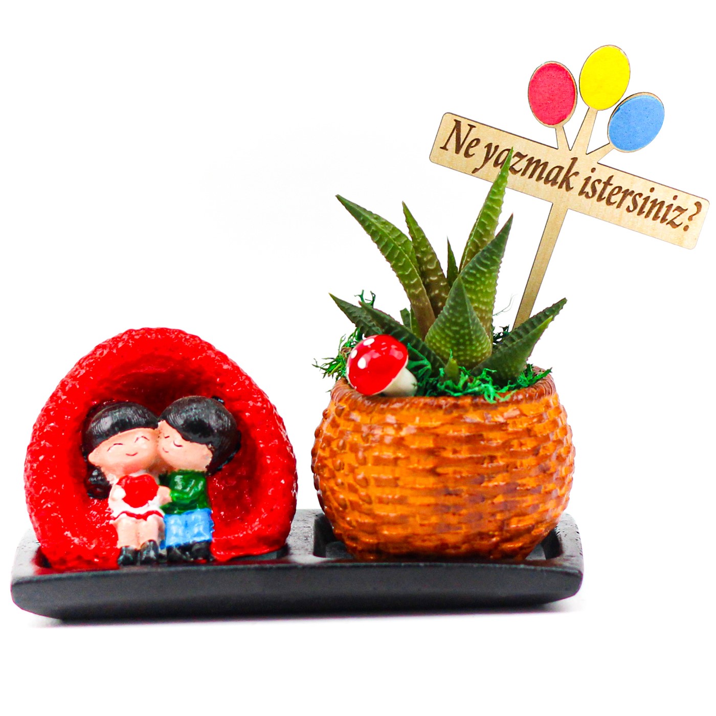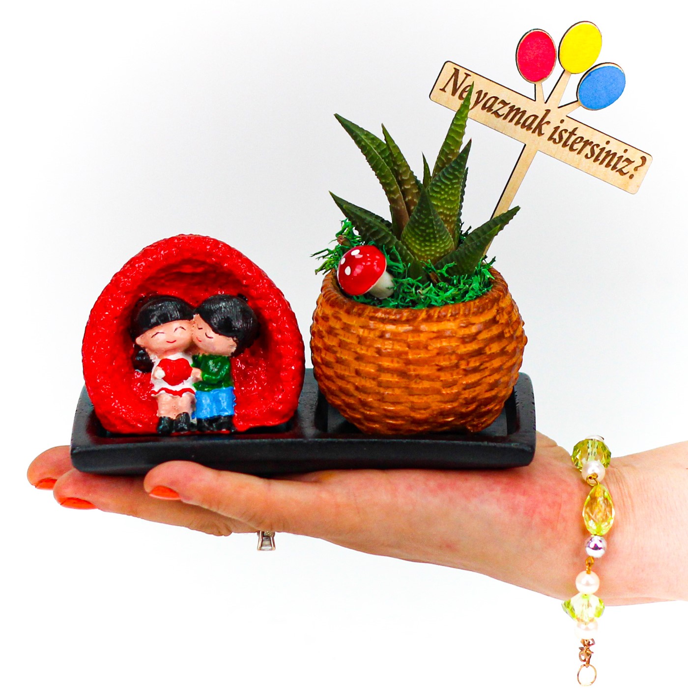 Sevgiliye hediye ,sevgililer günü hediyesi,sevgiliye sukulent , howartia sukulent ,saksı, howartia ,canlı çiçek, sevdikleriniz en değer verdiklerinize alınabilecek en anlamlı hediyelerden sukulent sevdiğinizi mutlu edecek uzun yıllar sizinle beraber olabilecek bir hediye….</p> <p>Ürün özelikleri:</p> <p>1 adet saksı içerisine 1 adet howartia ve 1 adet sevgili biblosu kullanılmıştır.</p> <p>Bakım Talimatları: Nemli ortamlardan kaçınarak, doğrudan güneş ışığı ve parlak ışıktan uzak tutmanız yeterli olacaktır. Bakımını aydınlık bir ortamda sağlamalıdır. İçeriğindeki bitkiler gövde ve yapraklarına su depolayan bitkiler olduğu için sık sulanma ihtiyacı duymamaktadır. Mevsime uygun olarak 7-10 günde 1 yemek kaşığı miktarı su verilmesi yeterli olacaktır.</p> <p>Ürün Ölçüleri: En: 8cm Boy:15cm. Yükseklik:10cm.'dir