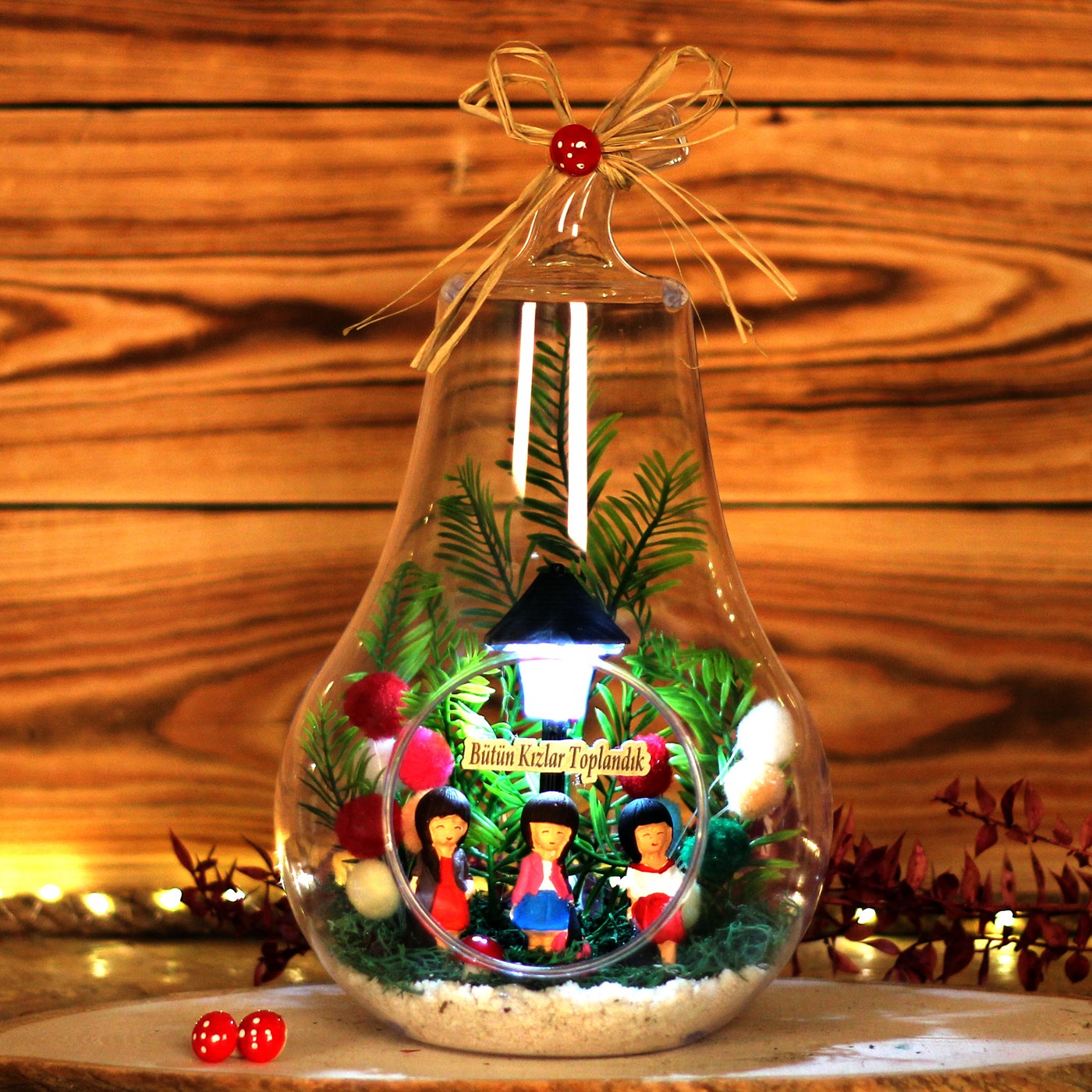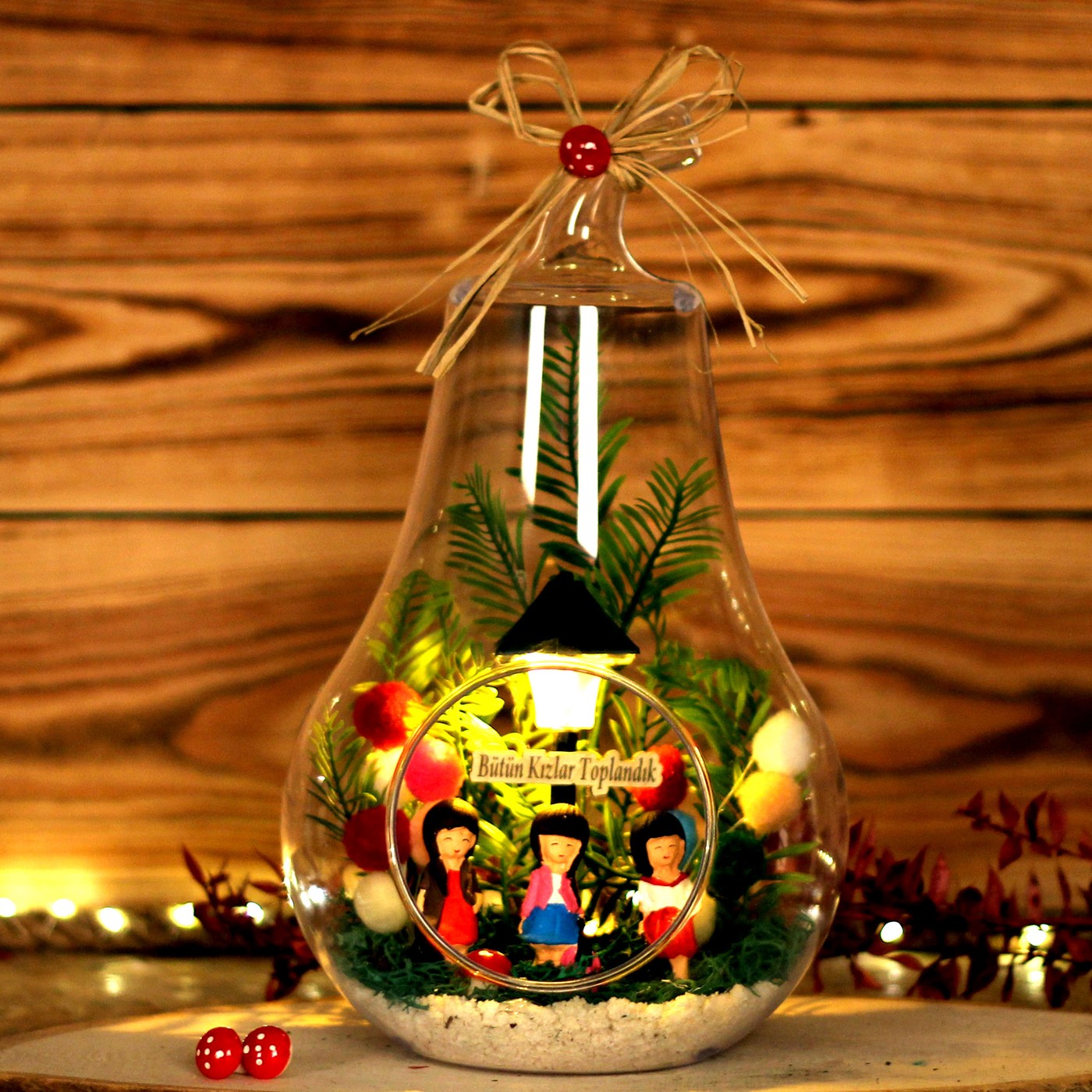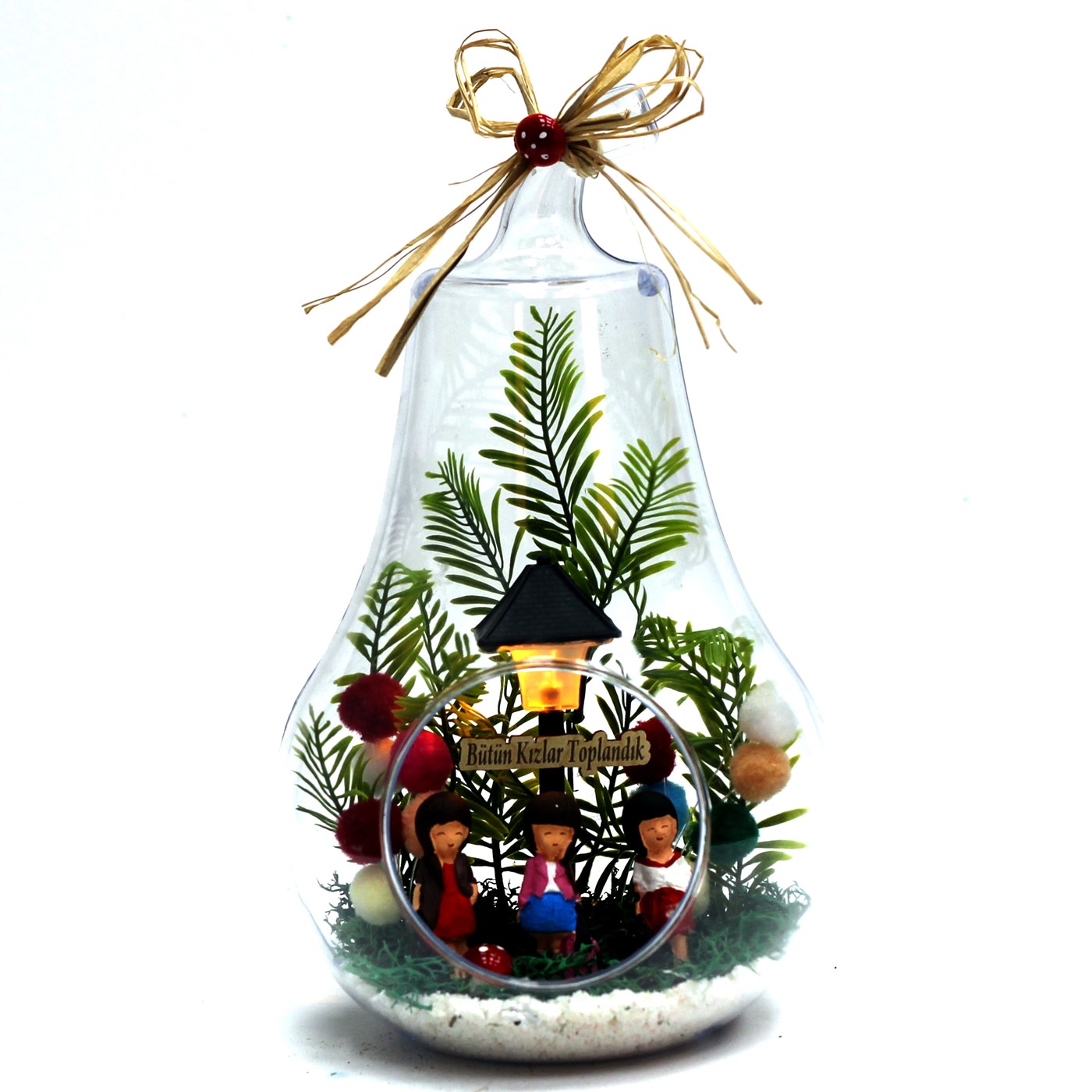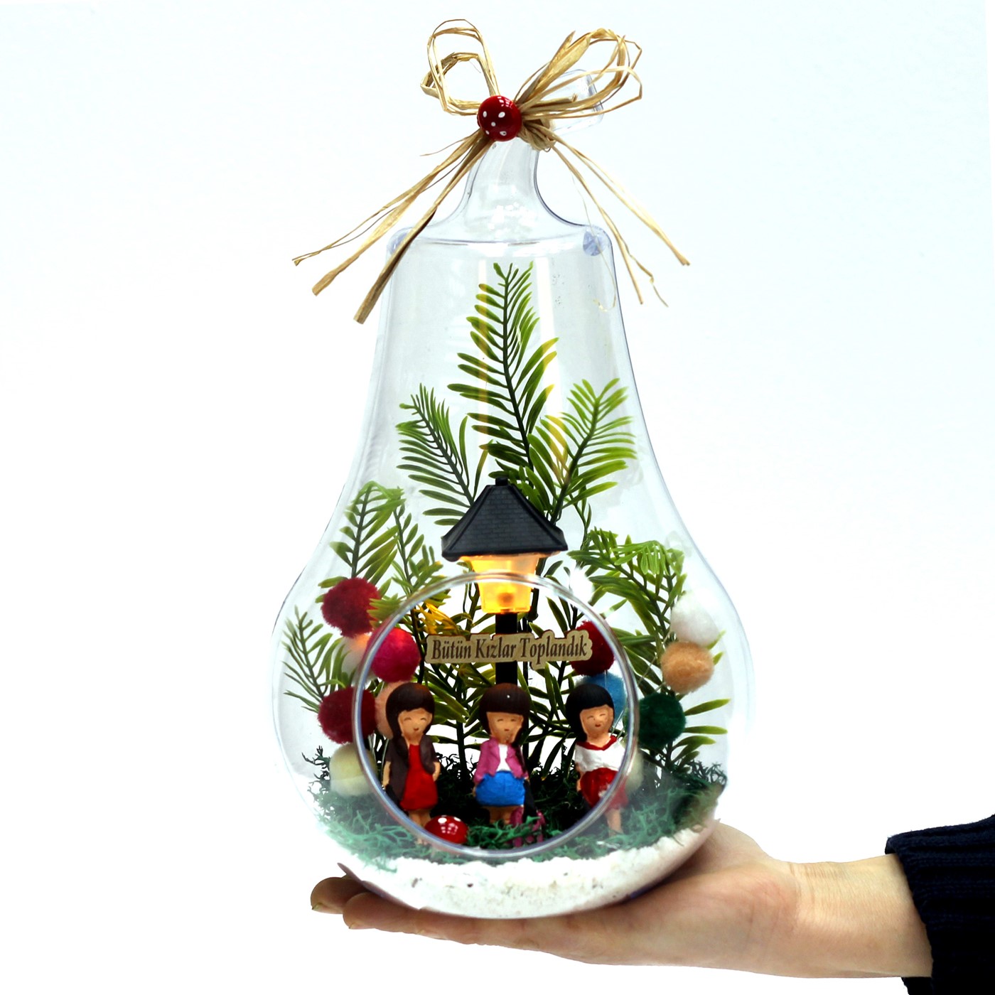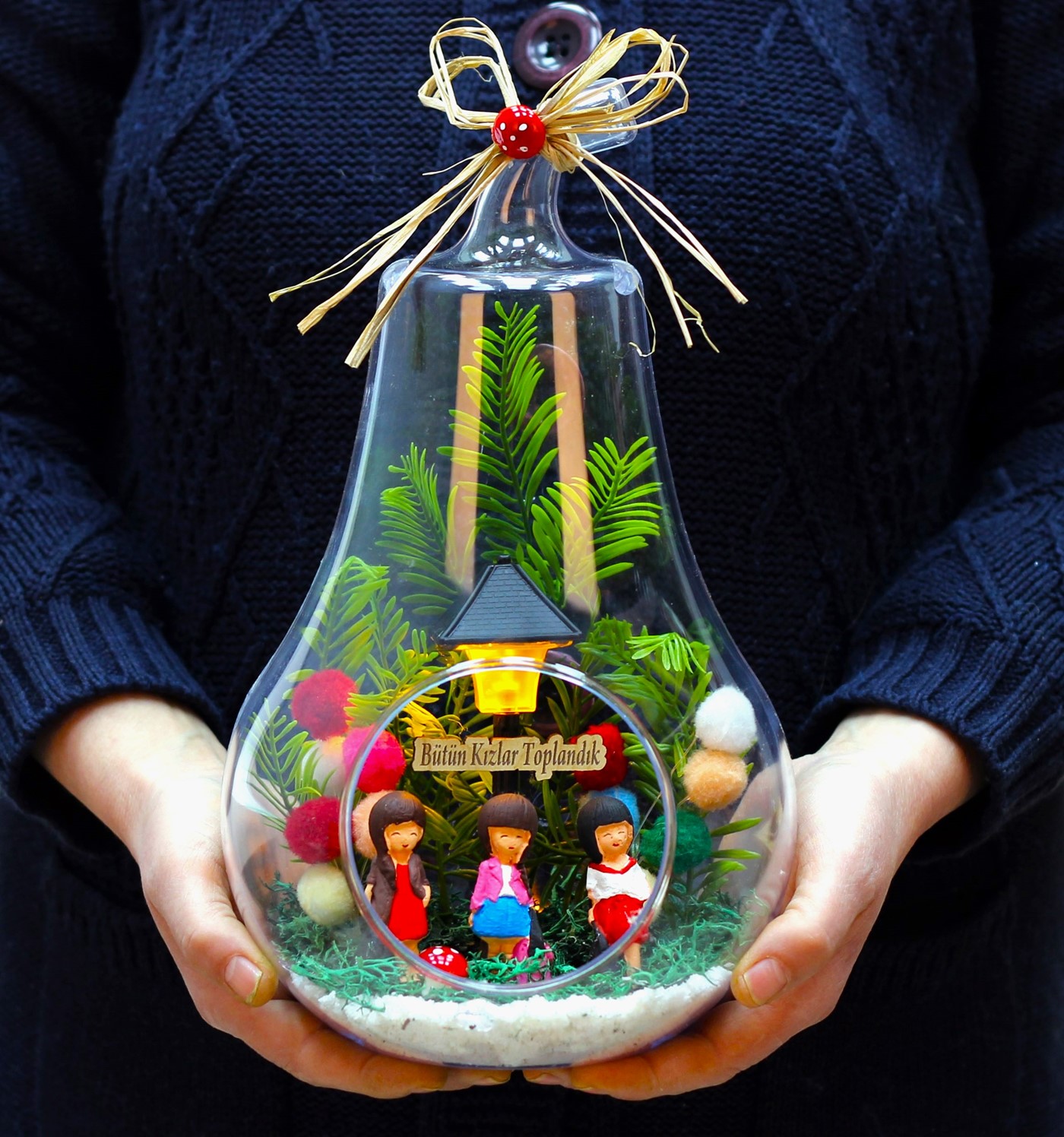 Kız arkadaşa hediye,en yakın arkadaşa hediye, kardeşe hediye verebileceğiniz kız arkadaş gruplarını temsilen ve vereceğiniz kişiyi mutlu edecek bir hediye.</p> <p>Ürün Özellikleri:</p> <p>Cam fanus içine tasarladığımız modelimizde ; yapay çiçek, ponponlardan yapılan iki adet balon, üç adet oturan kız figürü ve saat pili ie çalışan sokak lambası bulunmaktadır.Sokak lambası üst kısmında bulunan düğmeye nazikçe basıldığında,2 farklı sarı-beyaz soft renk veren ışığı yanmaktadır.Yine lamba üst kısmındaki kapağın altındaki pil yatağından,pili değiştirilebilir.İsteğinize göre,ahşap yazı ile kısa mesajınızı iletebilirsiniz.</p> <p><strong>Her biri kendine özgü bir tasarım olup, son derece temiz ve titiz çalışılmaktadır.<br> Ürünlerimizde doğal malzemeler kullanıldığı için renkler stok durumuna göre -çok nadir- değişiklik gösterebilir.</strong></p> <p>Ürün Ölçüleri: En:17cm - Boy:17m - Yükseklik:31cm'dir.