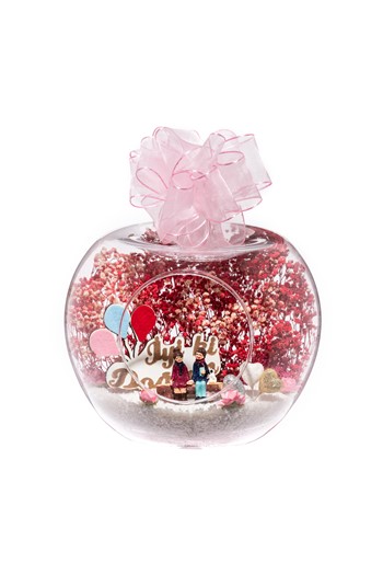 Cam fanus içine tasarladığımız modelimizde ; yapay çiçek, ponponlardan yapılan iki adet balon, üç adet oturan kız figürü ve saat pili ie çalışan sokak lambası bulunmaktadır.Sokak lambası üst kısmında bulunan düğmeye nazikçe basıldığında,2 farklı sarı-beyaz soft renk veren ışığı yanmaktadır.Yine lamba üst kısmındaki kapağın altındaki pil yatağından,pili değiştirilebilir.İsteğinize göre,ahşap yazı ile kısa mesajınızı iletebilirsiniz.
