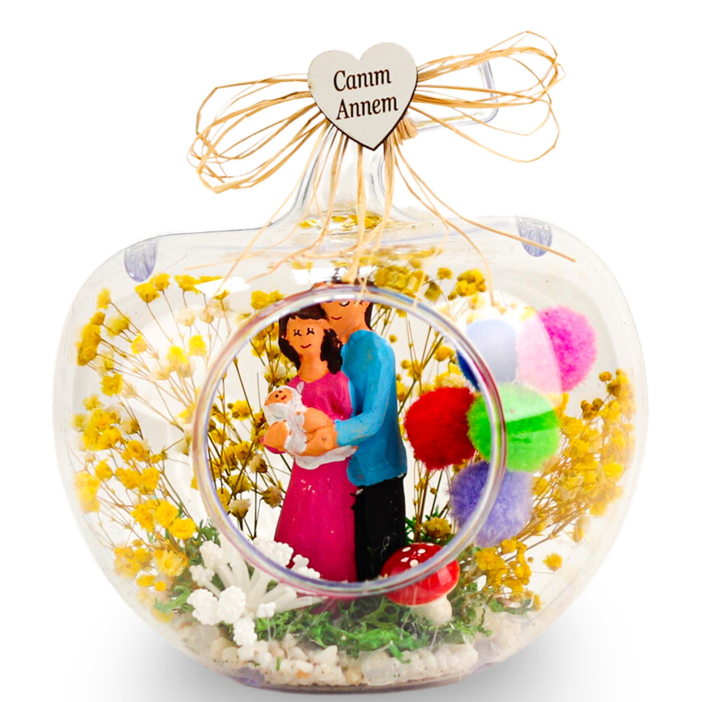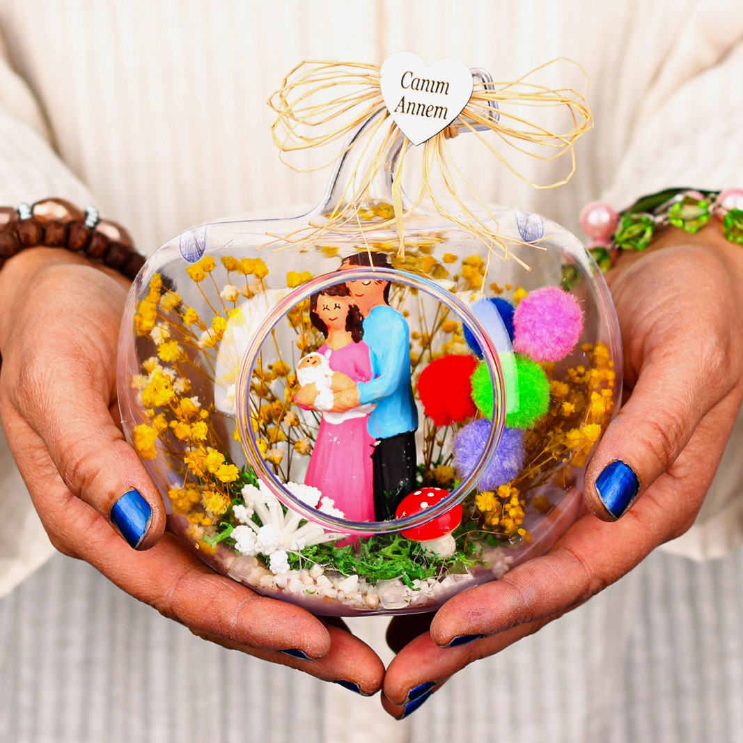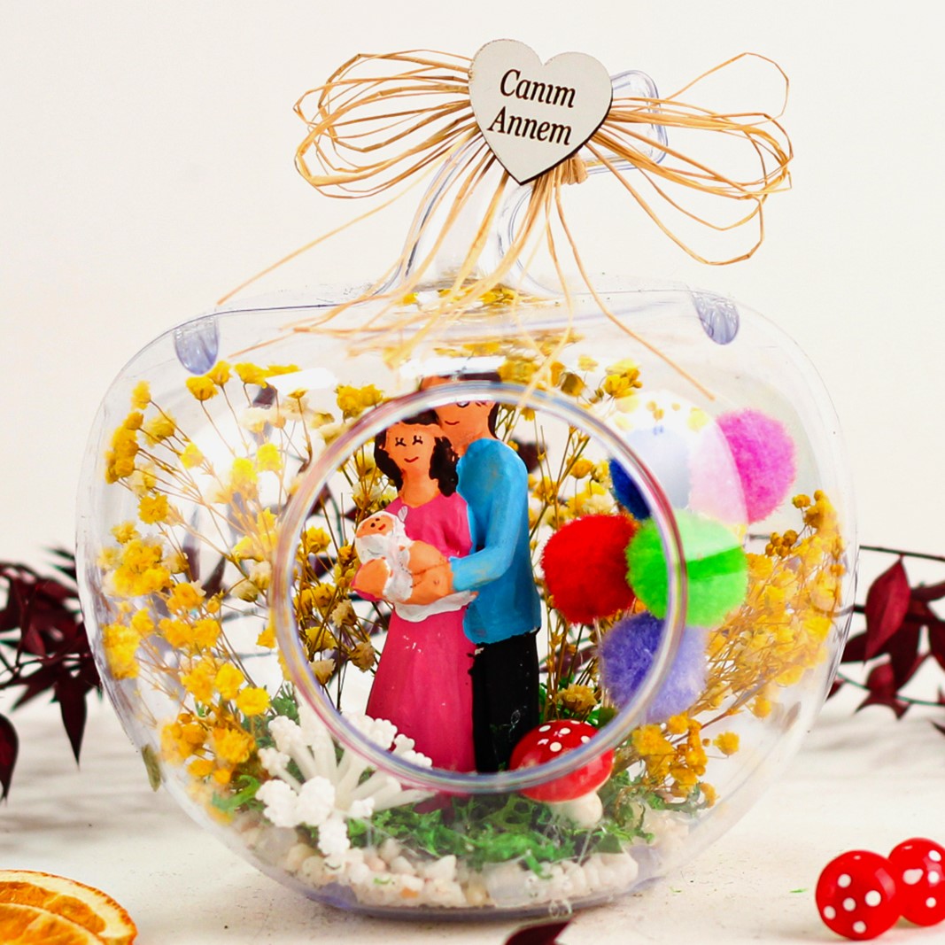 Anneye hediye, anneler günü hediyesi, eşinize hediye, teraryum, annenize teraryum olarak armağan edebileceğiniz göz alıcı mutluluk dolu unutulmaz bir hediye....Ürün özellikleri:Teraryum fanus bölümü abs’den imal edilmiş modelimizde ;şoklanmış cipso ,şoklanmış yosun,balon kullanılarak elde hazırlanmıştır.aile biblosu, mantar, sap kısmında doğal rafya kullanılmıştır.Her biri kendine özgü bir tasarım olup, son derece temiz ve titiz çalışılmaktadır.Ürünlerimizde doğal malzemeler kullanıldığı için renkler stok durumuna göre -çok nadir- değişiklik gösterebilir.</p> <p>Ürün Ölçüleri:En:13 - Boy:13 - Yükseklik:18'dir