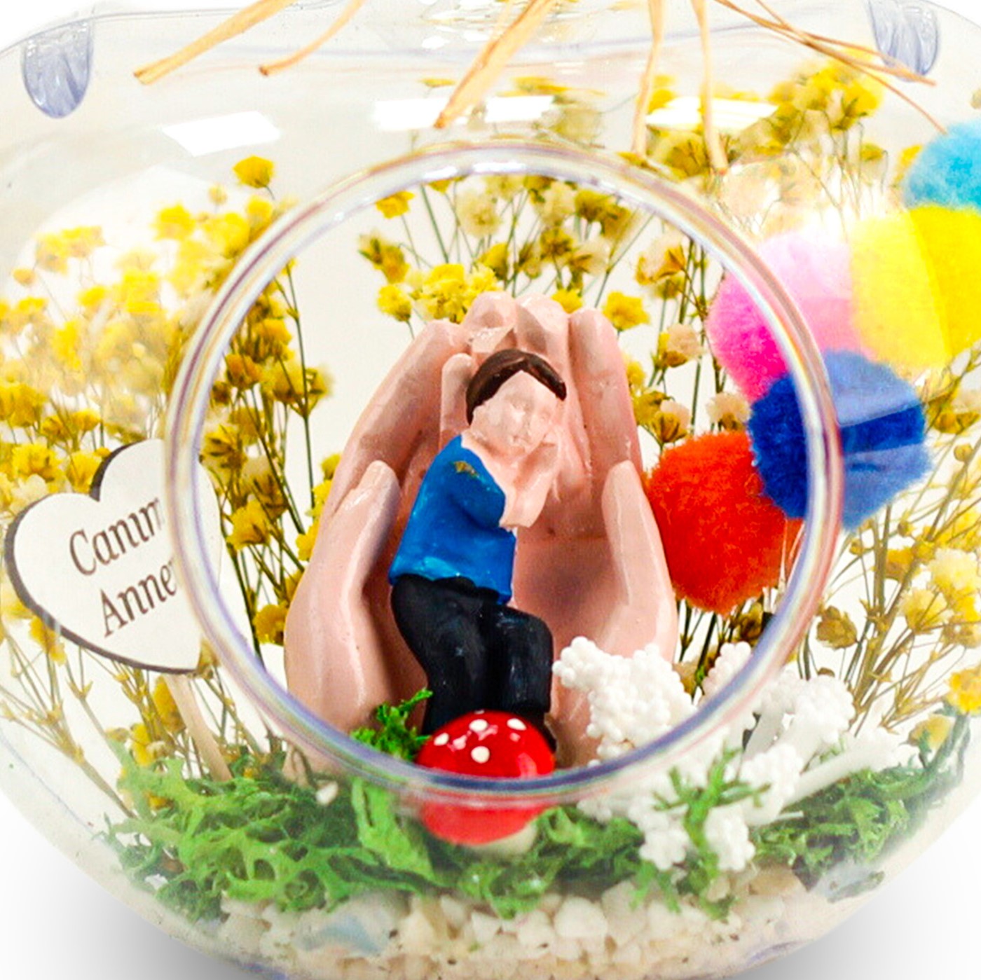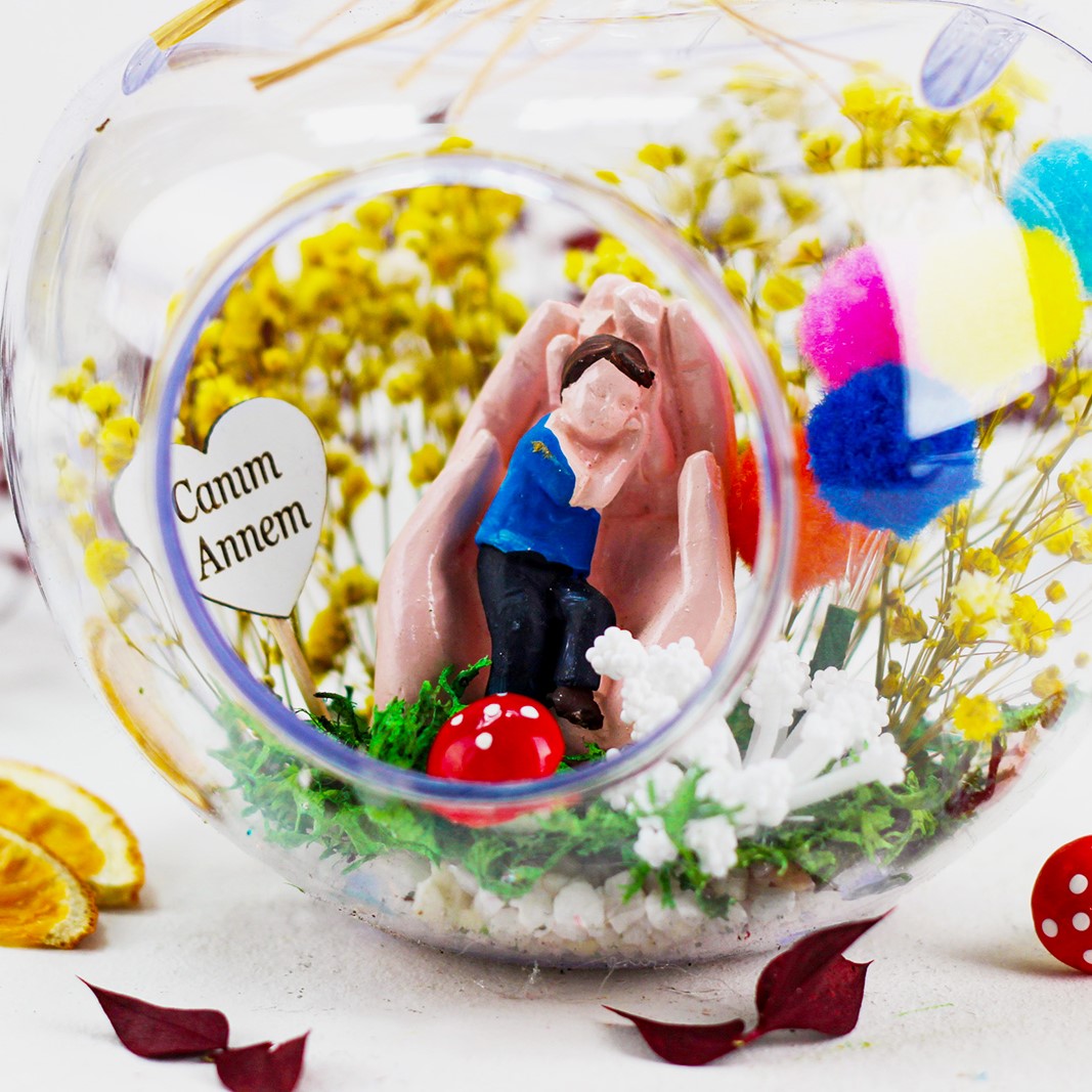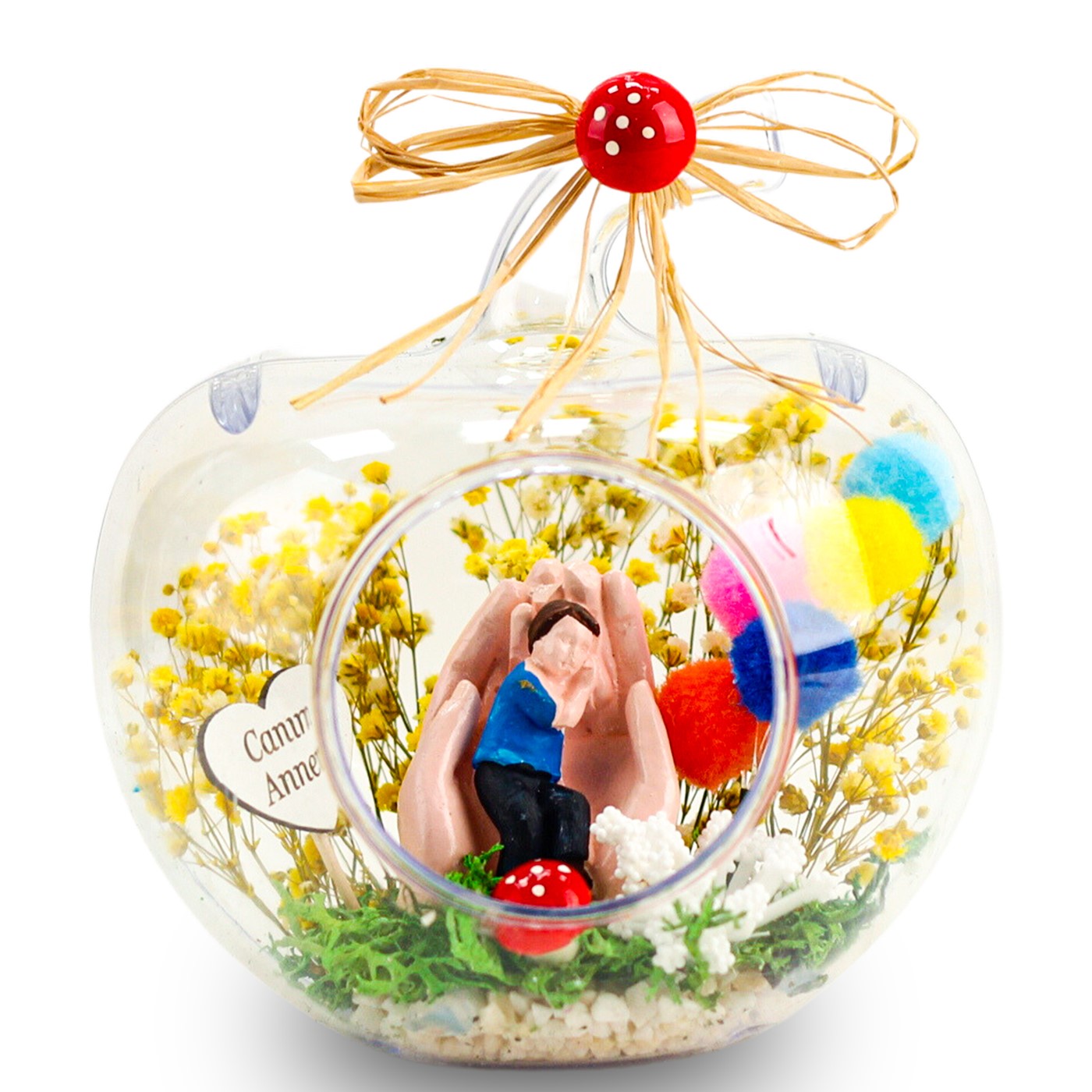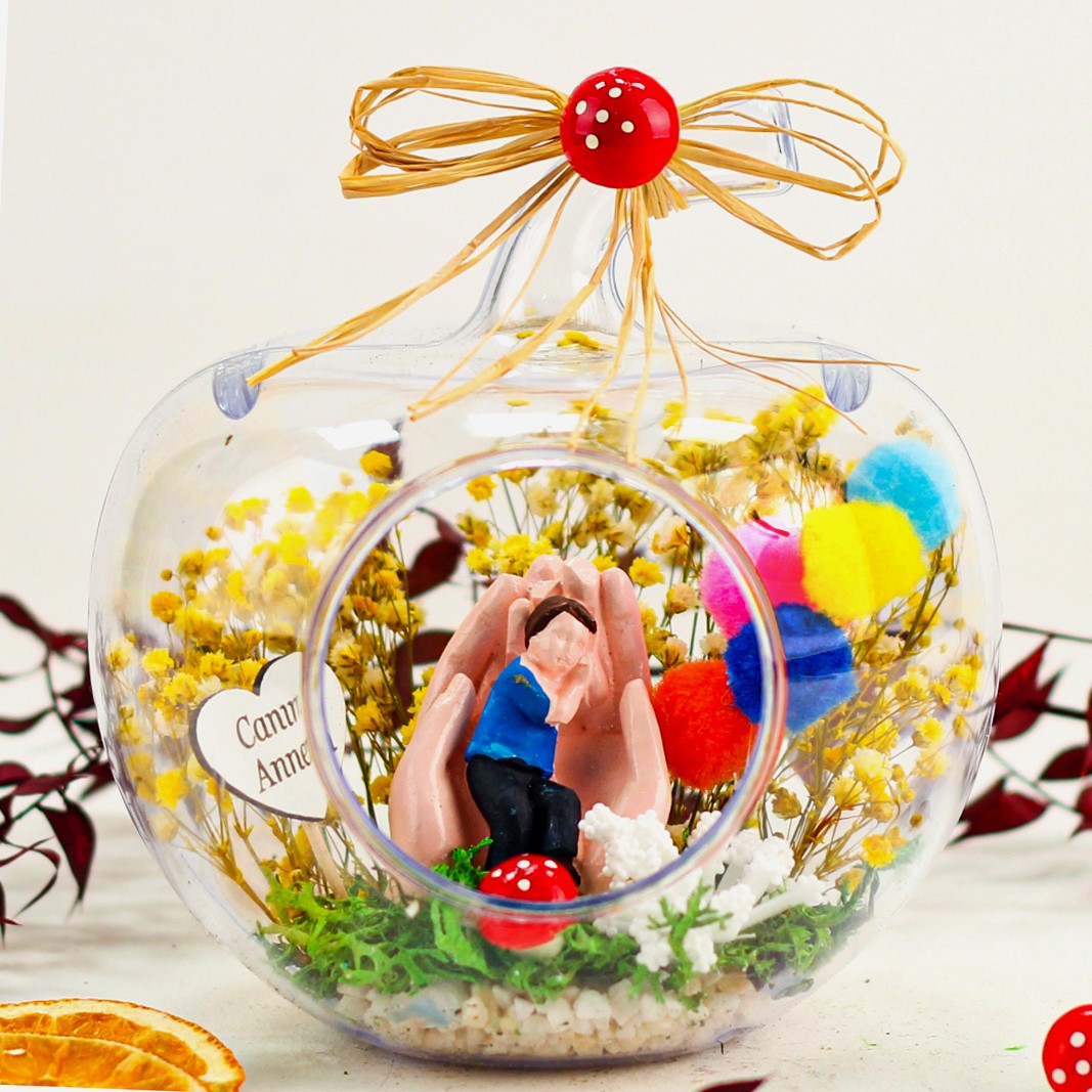 Anneye hediye, anneler günü hediyesi, eşinize hediye, teraryum, annenize teraryum olarak armağan edebileceğiniz göz alıcı mutluluk dolu unutulmaz bir hediye....Ürün özellikleri:Teraryum fanus bölümü abs’den imal edilmiş modelimizde ;şoklanmış cipso ,şoklanmış yosun,balon kullanılarak elde hazırlanmıştır.aile biblosu, mantar, sap kısmında doğal rafya kullanılmıştır.Her biri kendine özgü bir tasarım olup, son derece temiz ve titiz çalışılmaktadır.Ürünlerimizde doğal malzemeler kullanıldığı için renkler stok durumuna göre -çok nadir- değişiklik gösterebilir.Ürün Ölçüleri:En:13 - Boy:13 - Yükseklik:16'dir.