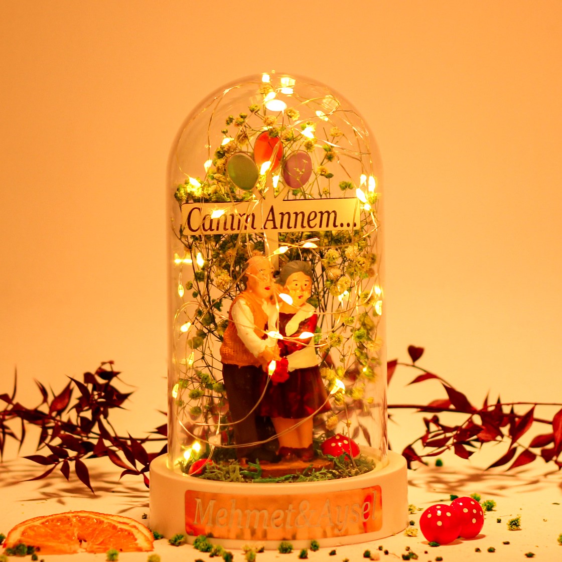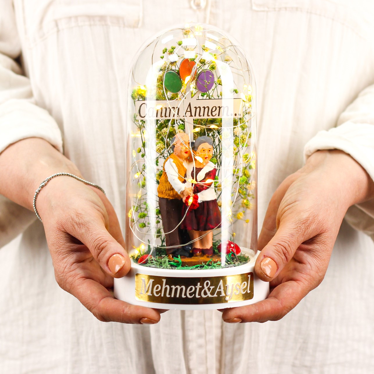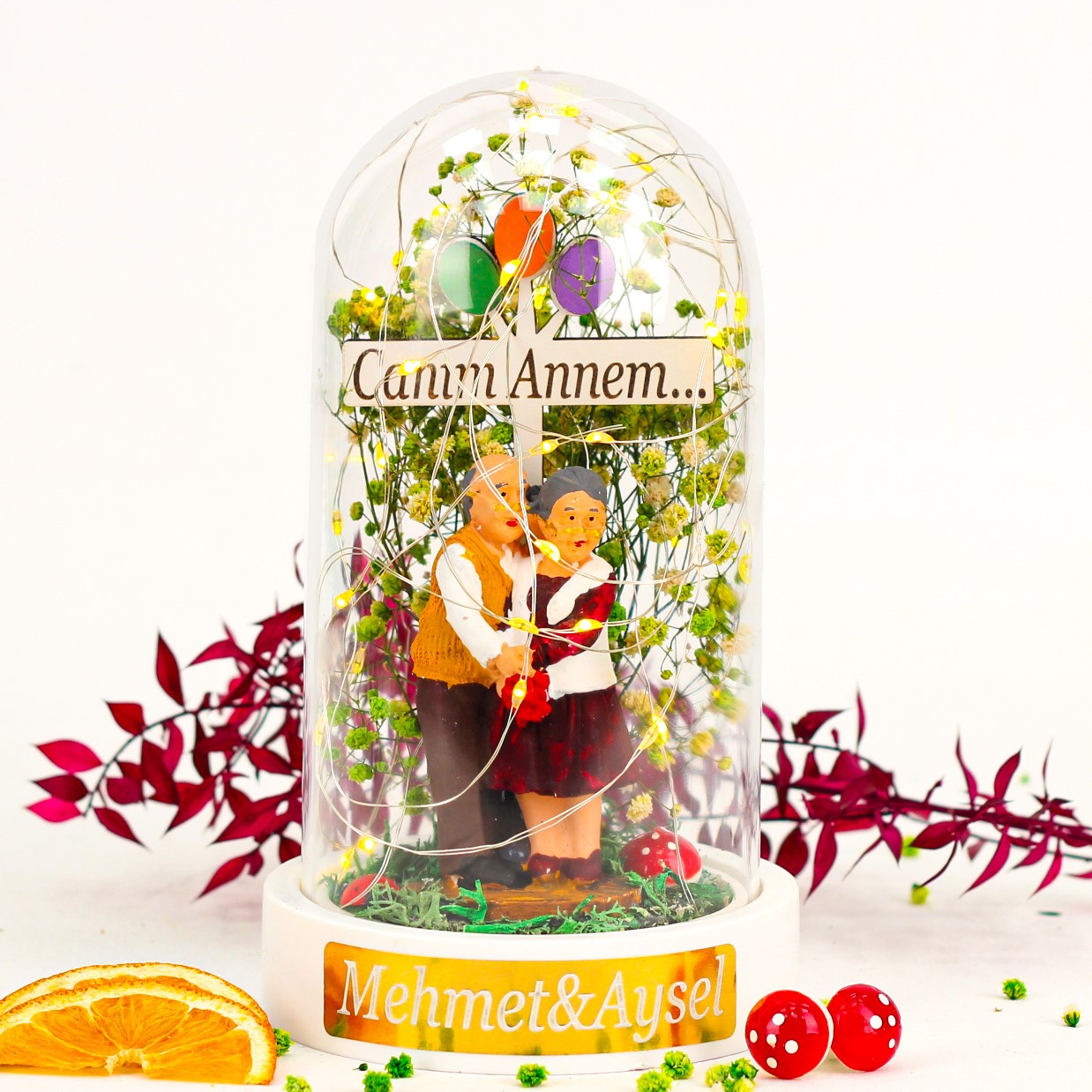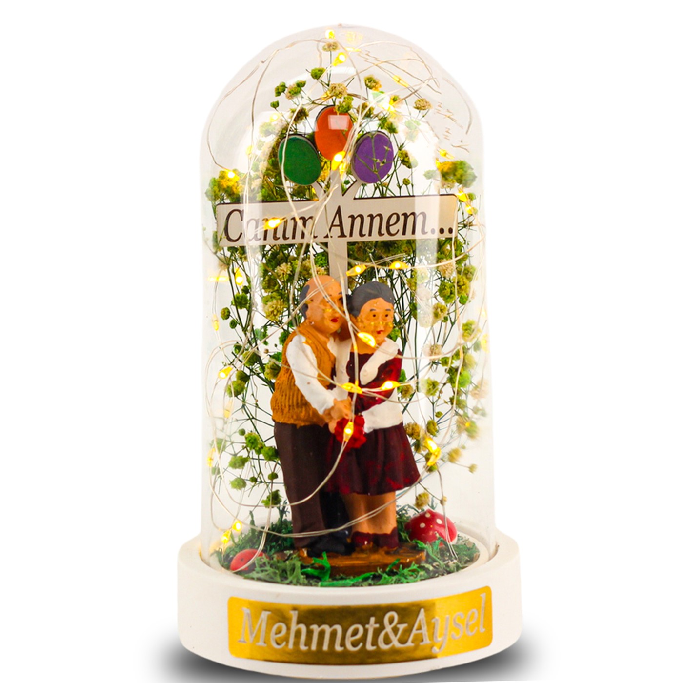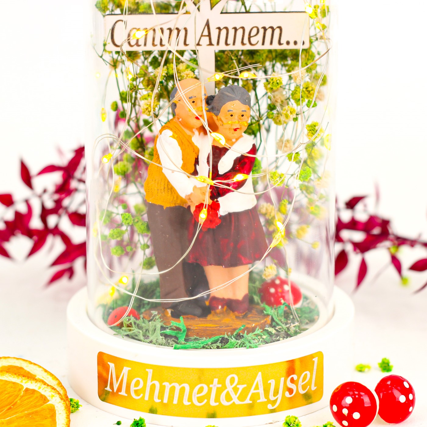 Anneye hediye, sevgililer günü hediyesi, babanneye hediye, anneanneye hediye, sevdiklerinize teraryum olarak armağan edebileceğiniz göz alıcı mutluluk dolu unutulmaz bir hediye...Ürün özellikleri:Teraryum fanus bölümü abs’den imal edilmiş modelimizde; Kurutulmuş cipso, şoklanmış yosun kullanılarak elde hazırlanmıştır. Dede anneanne-babaanne bibloları, mantar ve uğur böceği figürleri kullanılmıştır..Her biri kendine özgü bir tasarım olup, son derece temiz ve titiz çalışılmaktadır.Ürünlerimizde doğal malzemeler kullanıldığı için renkler stok durumuna göre -çok nadir- değişiklik gösterebilir.Ürün Ölçüleri: En:12cm - Boy:12cm - Yükseklik:22cm'dir.