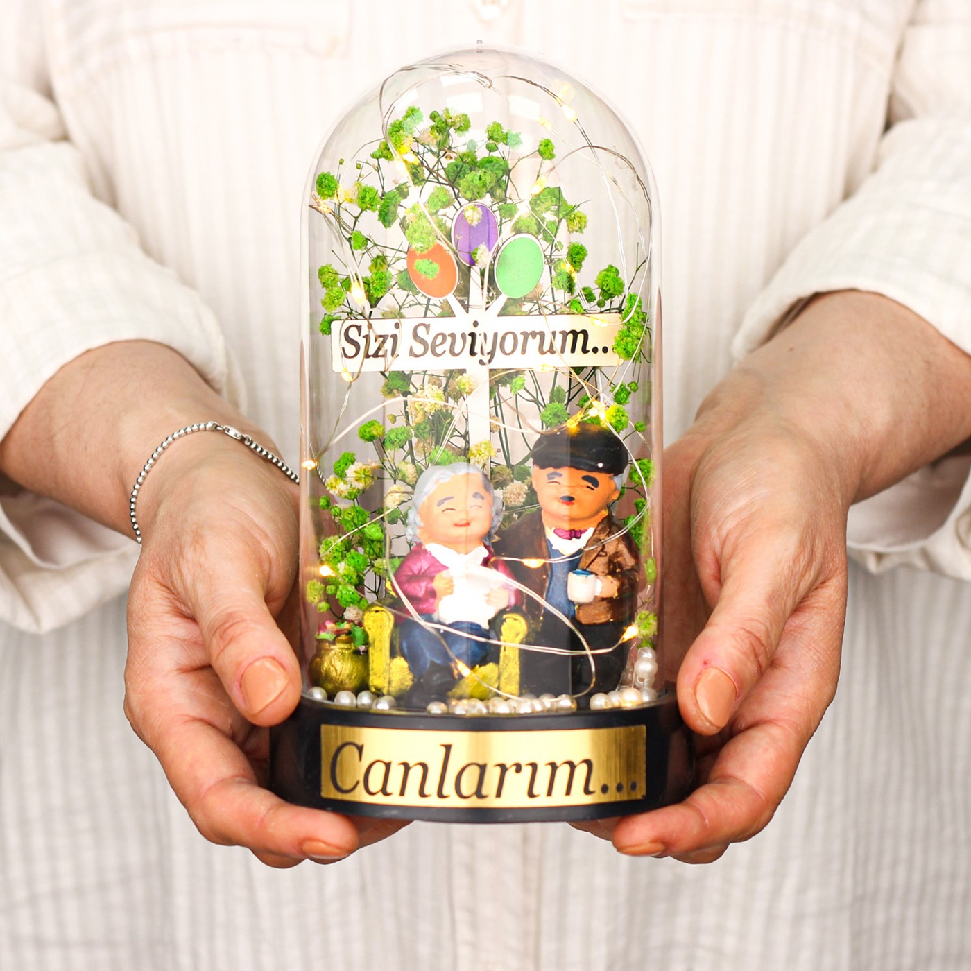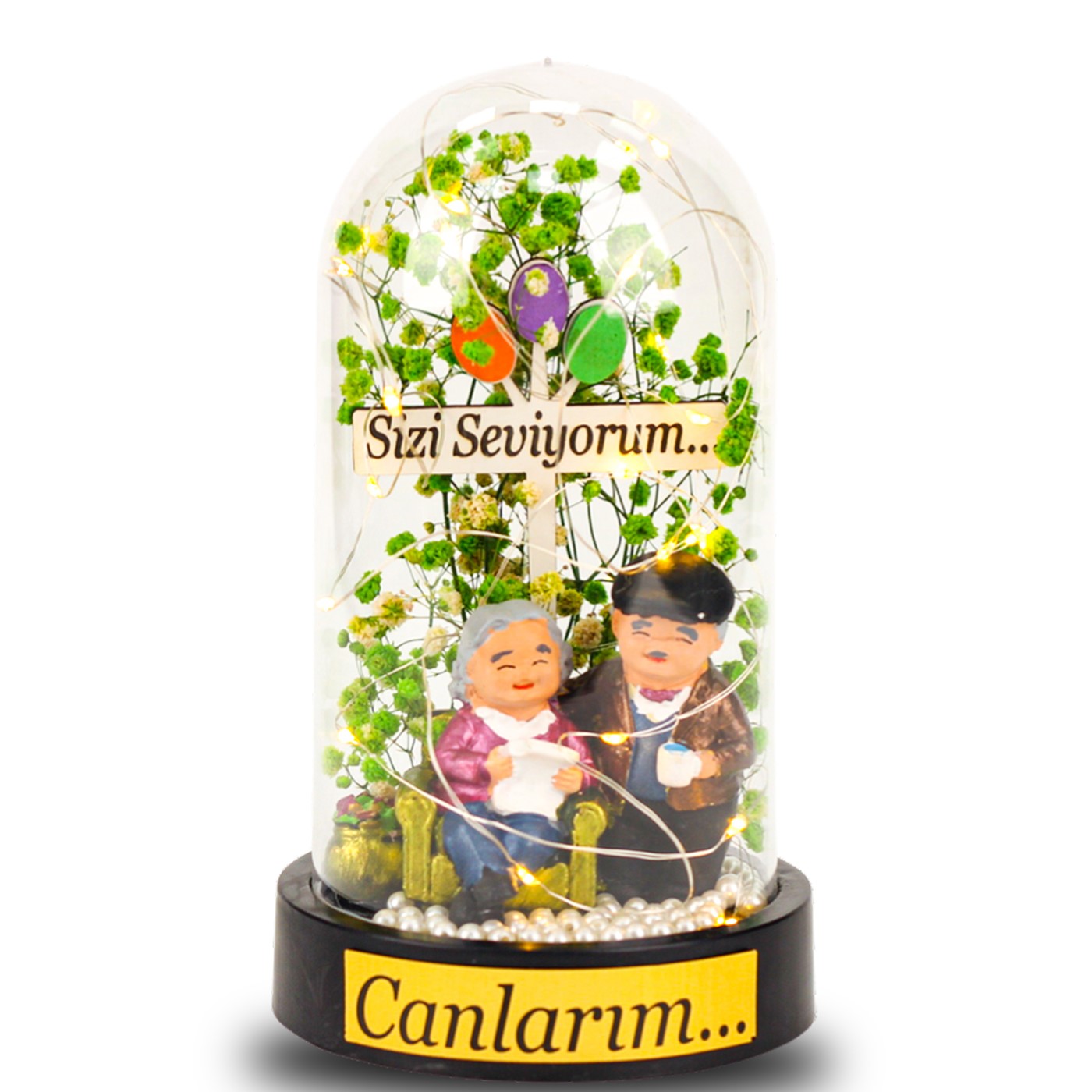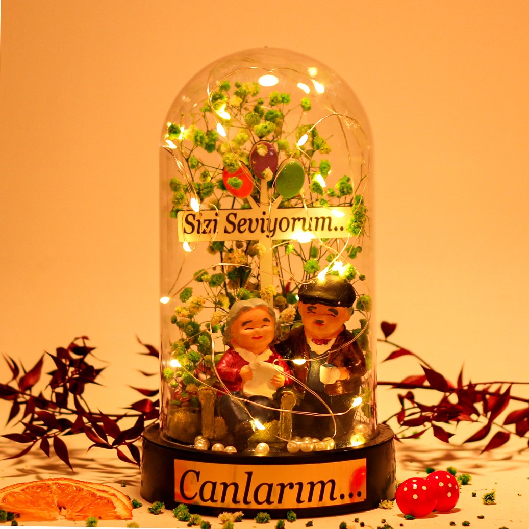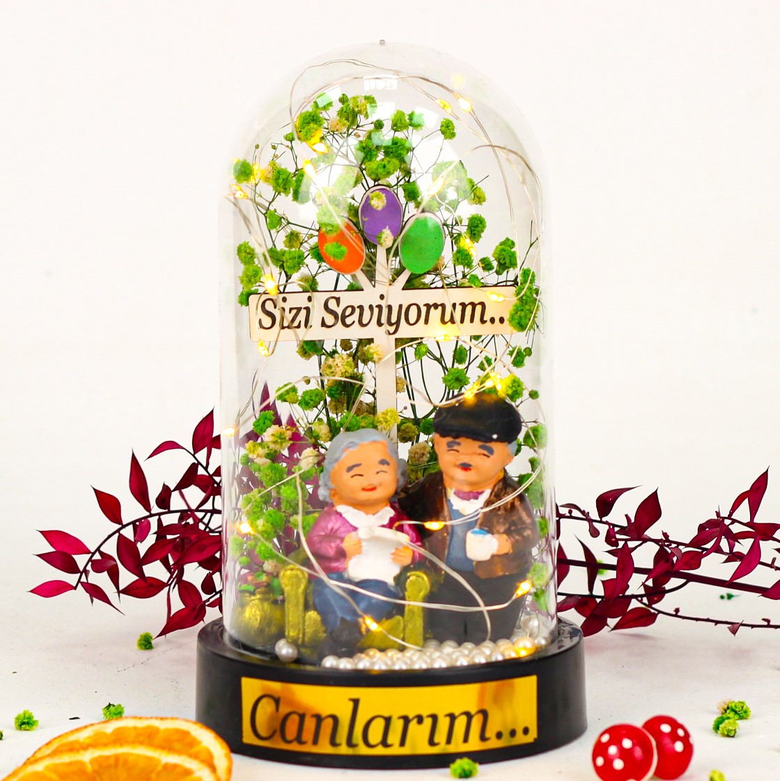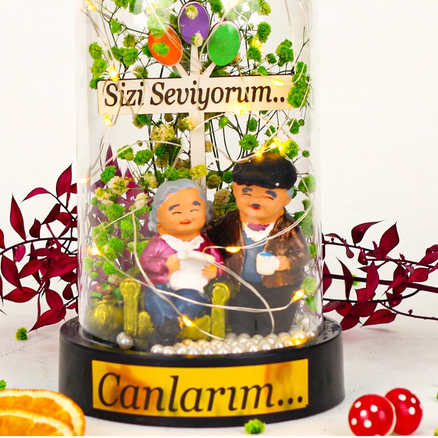 Anneanneye hediye, babaanneye hediye, anneler günü hediyesi, kadına hediye, teraryum, sevdiklerinize teraryum olarak armağan edebileceğiniz göz alıcı mutluluk dolu unutulmaz bir hediye...Ürün özellikleri:Teraryum fanus bölümü abs’den imal edilmiş modelimizde; şoklanmış cipso, inci, dede anneanne-babaanne biblolar kullanılmıştır.Her biri kendine özgü bir tasarım olup, son derece temiz ve titiz çalışılmaktadır.Ürünlerimizde doğal malzemeler kullanıldığı için renkler stok durumuna göre -çok nadir- değişiklik gösterebilir.Ürün Ölçüleri: En:12cm - Boy:12cm - Yükseklik:22cm'dir.