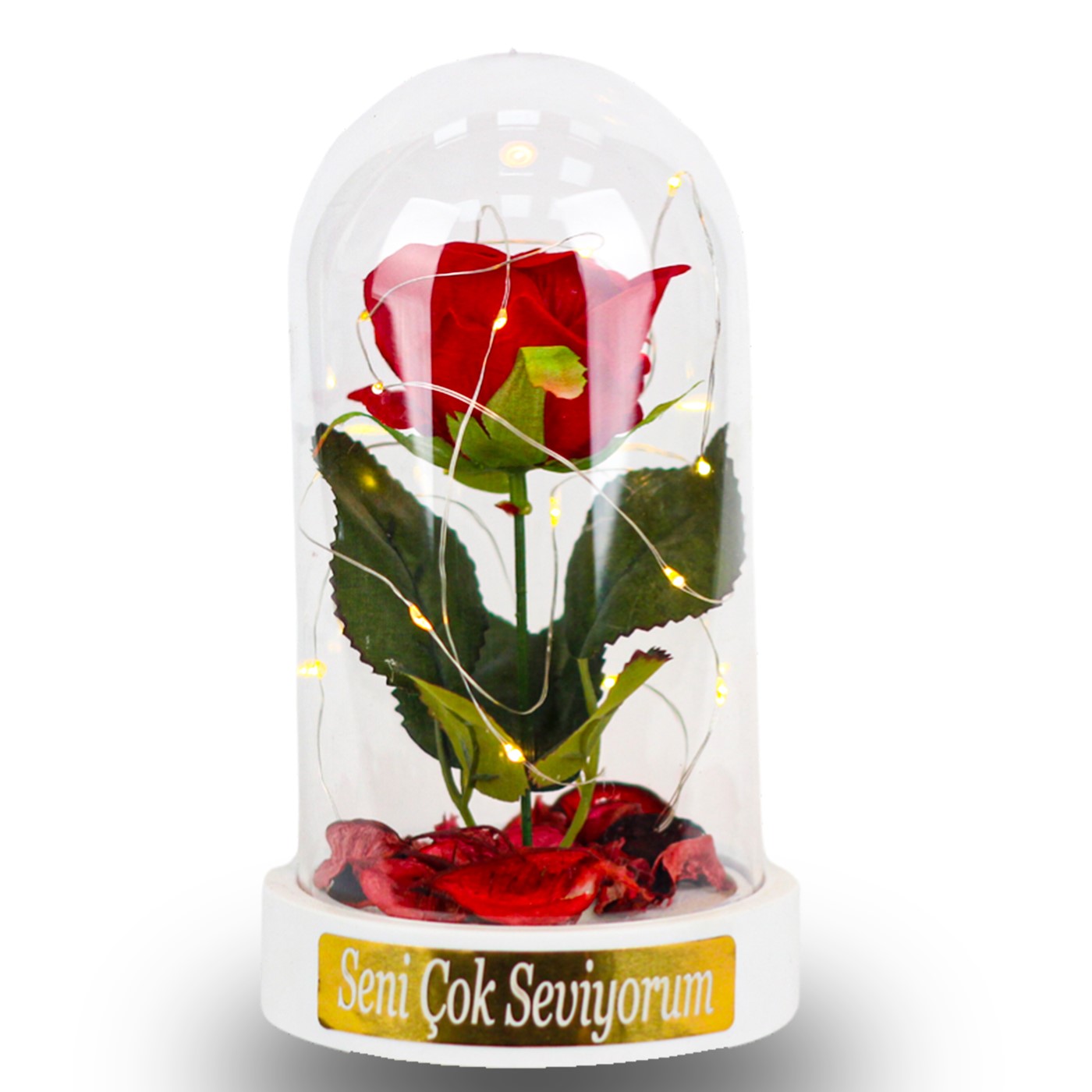 Kırmızı gül,gül,hediye gül,hediye,sevgiliye hediye,eşinize hediye,<strong> sevdikleriniz içinuzun yıllar boyunca hatırlanacağınız anlamlı ve kalıcı bir hediye...Ters fanus bölümü abs'den yapılmış modelimizde; 1 adet kadife gül , gül yaprakları ve inci ile tasarlanmıştır.İsteğinize göre kendi isim-soyisim iletirseniz,ürüne ekleyebiliriz.>Her biri kendine özgü bir tasarım olup, son derece temiz ve titiz çalışılmaktadır.Ürünlerimizde doğal malzemeler kullanıldığı için renkler stok durumuna göre -çok nadir- değişiklik gösterebilir.Ürün Açık Ölçüleri: En:12cm- Boy:12cm- Yükseklik:21 cm'dir.