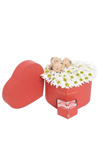 Kutu Ölçüsü: 14*14*14 cm (en*boy*yükseklik) Gül Adeti: 16 Adet 1 adet 30 cm peluş oyuncak. 2 adet kalp çikolta ve draje çikolata Not: Güllerin renk tonları ve boyutları mevsim koşullarına göre değişiklik gösterebilir.