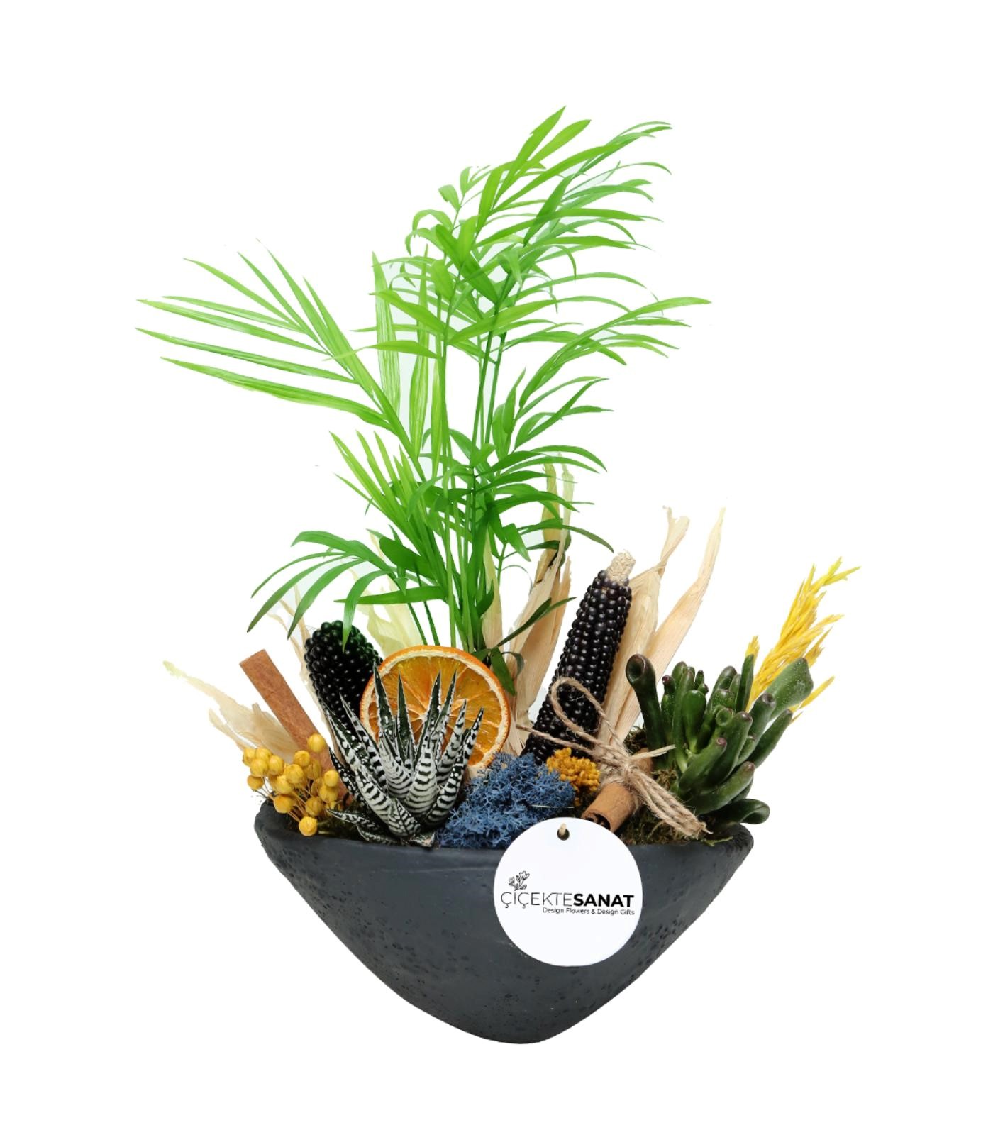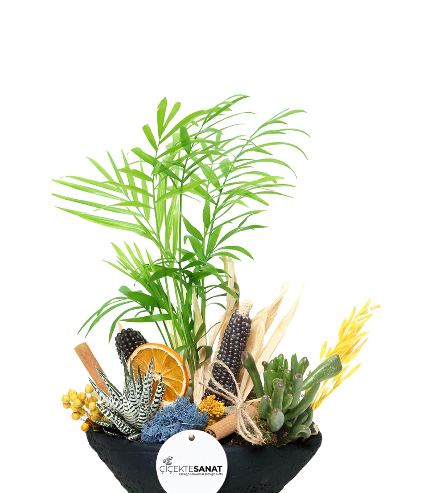 Ürünümüzün içerisinde Succulentler, Portakallar , Mısır ve kuru çiçekler mevcut olup floral designers ekibimizin sizler için yakınlarınıza harika bir hediye fırsatı sunmaktadır.Areka Bitkileri boyutları mevsimsel olarak daha kısa olabilmektedir. Bitkiler gerekli bakımları ve sulama işlemleri yapıldıkça uzayacaktır.