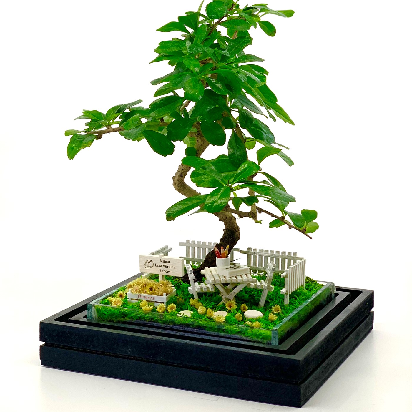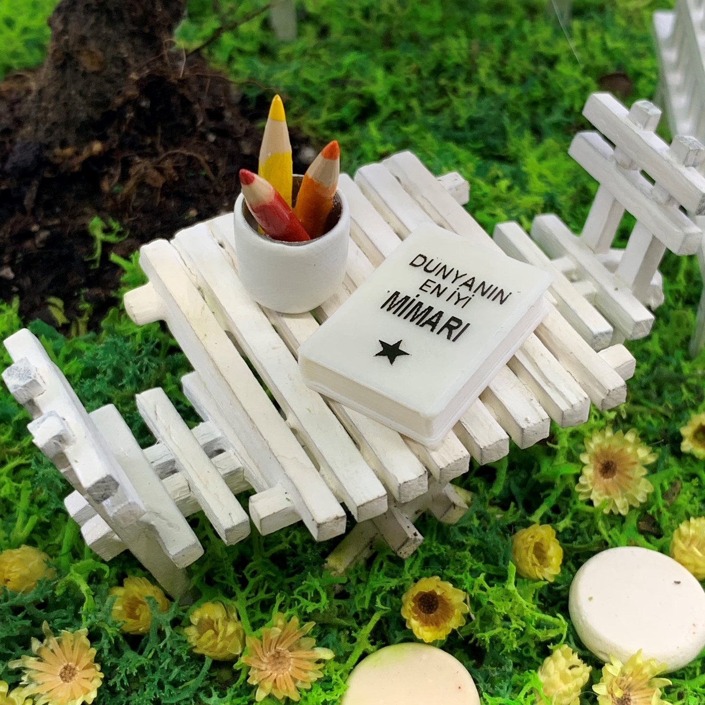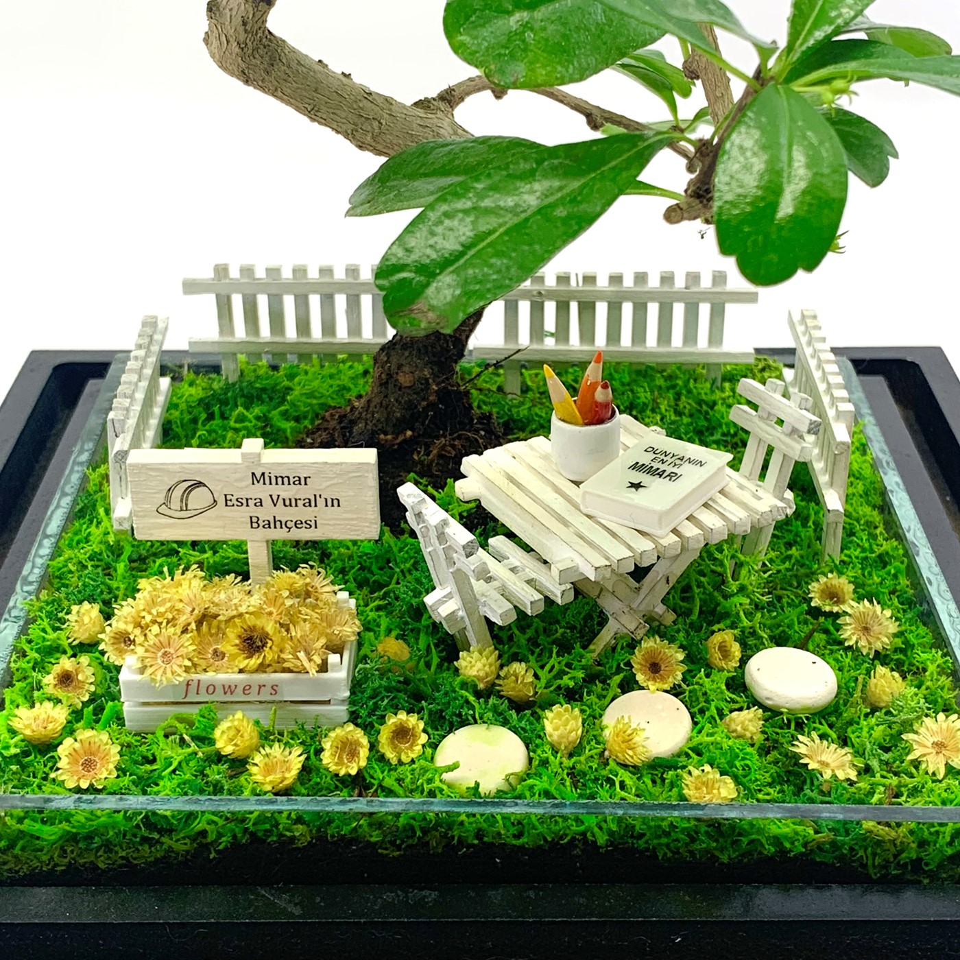 Aksesuarlar : El yapımı ahşap bahçe çitleri, el yapımı ahşap masa ve sandalyeler, masa üzerinde tercih edeceğiniz el yapımı kitaplarımızdan biri ve kalemlik figürü, el yapımı ahşap kasa içerisinde gerçek kurutulmuş minik sarı çiçekler, el yapımı minyatür taş figürleri, isme özel hazırlanan bahçe tabelası (Tüm aksesuarlar fiyata dahildir)