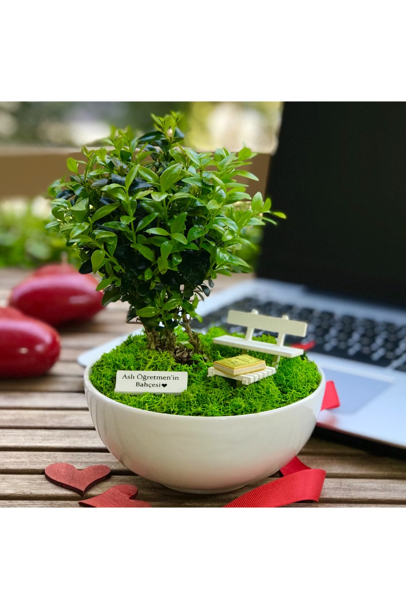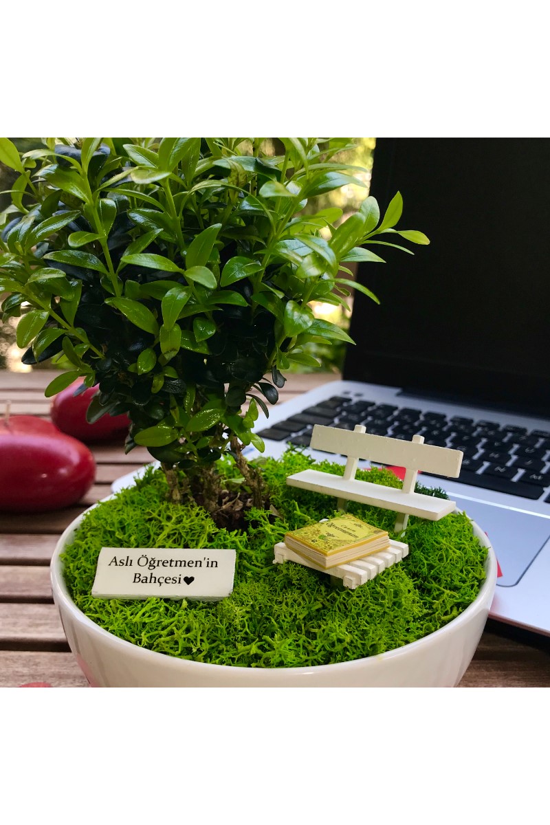 Kişiye Özel Öğretmenler İçin Bonsai Bahçesi 1 Bu orijinal tasarım yıllarca unutulmayacak eşsiz bir hediye arayanlar için canlı bitkiler ve ahşap mobilyalarla hazırlanmıştır. El emeği ile üretilen şeyler her zaman özeldir. Minyatür bahçeniz, sevdiklerinizin gününü güzelleştirmek için özenle seçilen bitkiler ve tek tek elde hazırlanan aksesuarlarla tamamlanır. Minyatür bahçe, yaklaşık 13 cm çapında 6 cm yüksekliğinde benzer formdaki porselen ya da seramik kaplarda Buxus Sempervirens türü bitki ile hazırlanır. Bahçede el yapımı ahşap bank, ahşap sehpa ve üzerinde el yapımı minyatür Canım Öğretmenim kitabı bulunmaktadır. Zarif hediyeniz, Kişiye Özel hazırlanan şık bir bahçe tabelası ile tamamlanmaktadır. Büyük bölümü tek tek elde hazırlanan minyatür aksesuarların tasarımlarında değişiklikler ya da milimetrik ölçü farklılıkları bulunabilir. Bakım: Minyatür bitki canlıdır. Bol gün ışığı alan dış mekanlar için uygundur. Minyatür bahçenin zemininde canlı ya da şoklanmış yosun kullanılır. Yosunlar zamanla renk ve dokularını kaybedebilir.