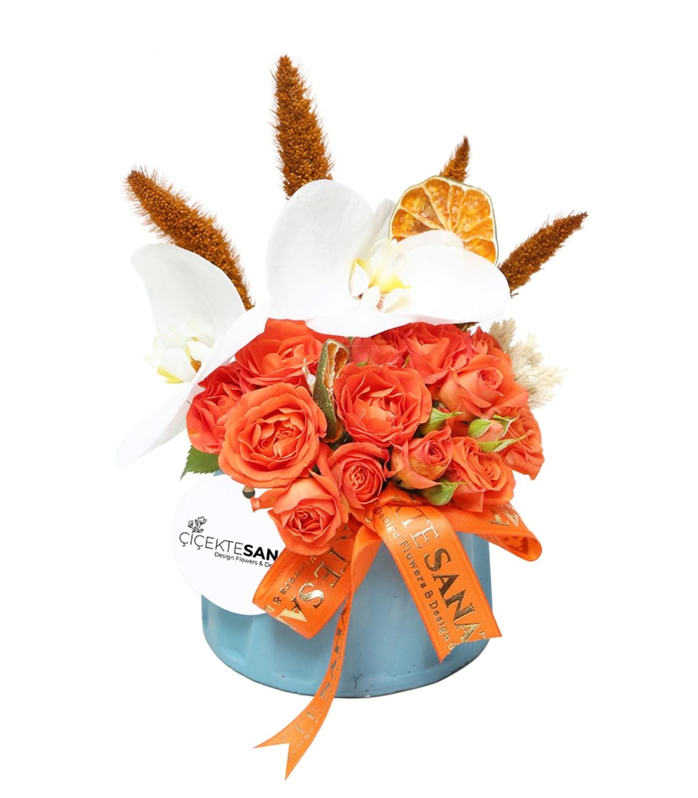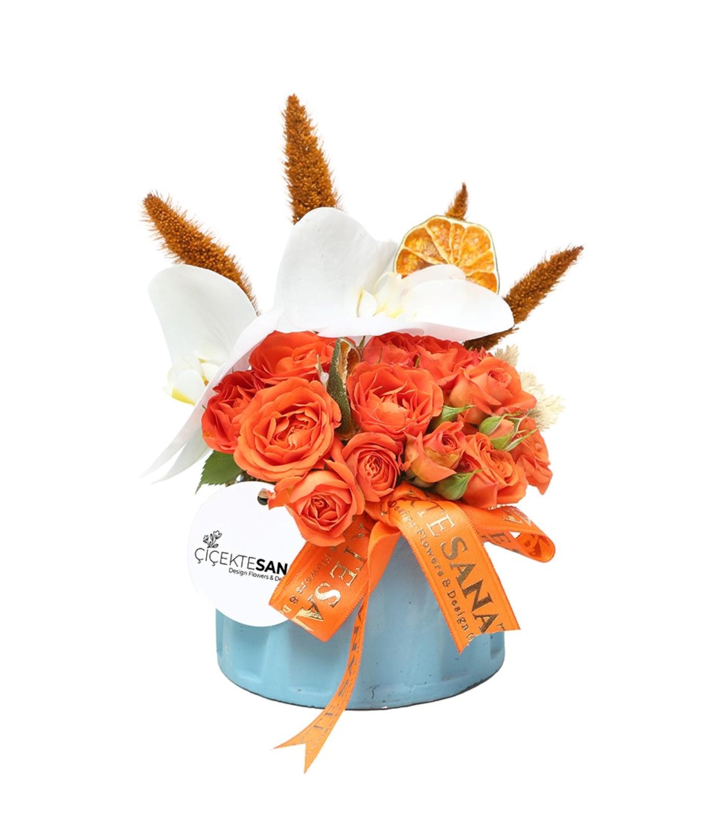Orange Purity Aranjman için altlık olarak ithal seramik kullanılmıştır. Direk güneş ışığı aldığında çiçeklerde bayılmalar meydan gelebilir, oda sıcaklığında ofis , ev , işyerleri için çok uygundur