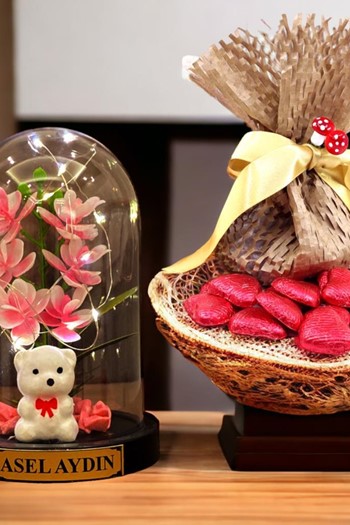 Görselliği zenginleştirilerek yapay çiçek ve cipsolarla aranje edilmiştir. Bu aranjman ile evinizin ve iş yerinizin dekorasyonuna farklı bir hava katabileceğiniz gibi sevdiklerinize de bu kalıcı hediye ile özel hissettirebilirsiniz.