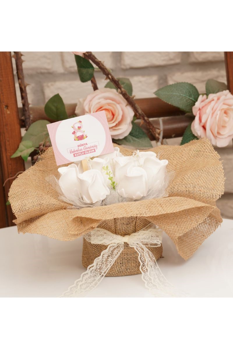 Özel Yapım Jüt Saksıda Beyaz Aşk Gonca Güller Kokulu Taş Çiçek Aranjmanı (Dünya Kadınlar Günü)