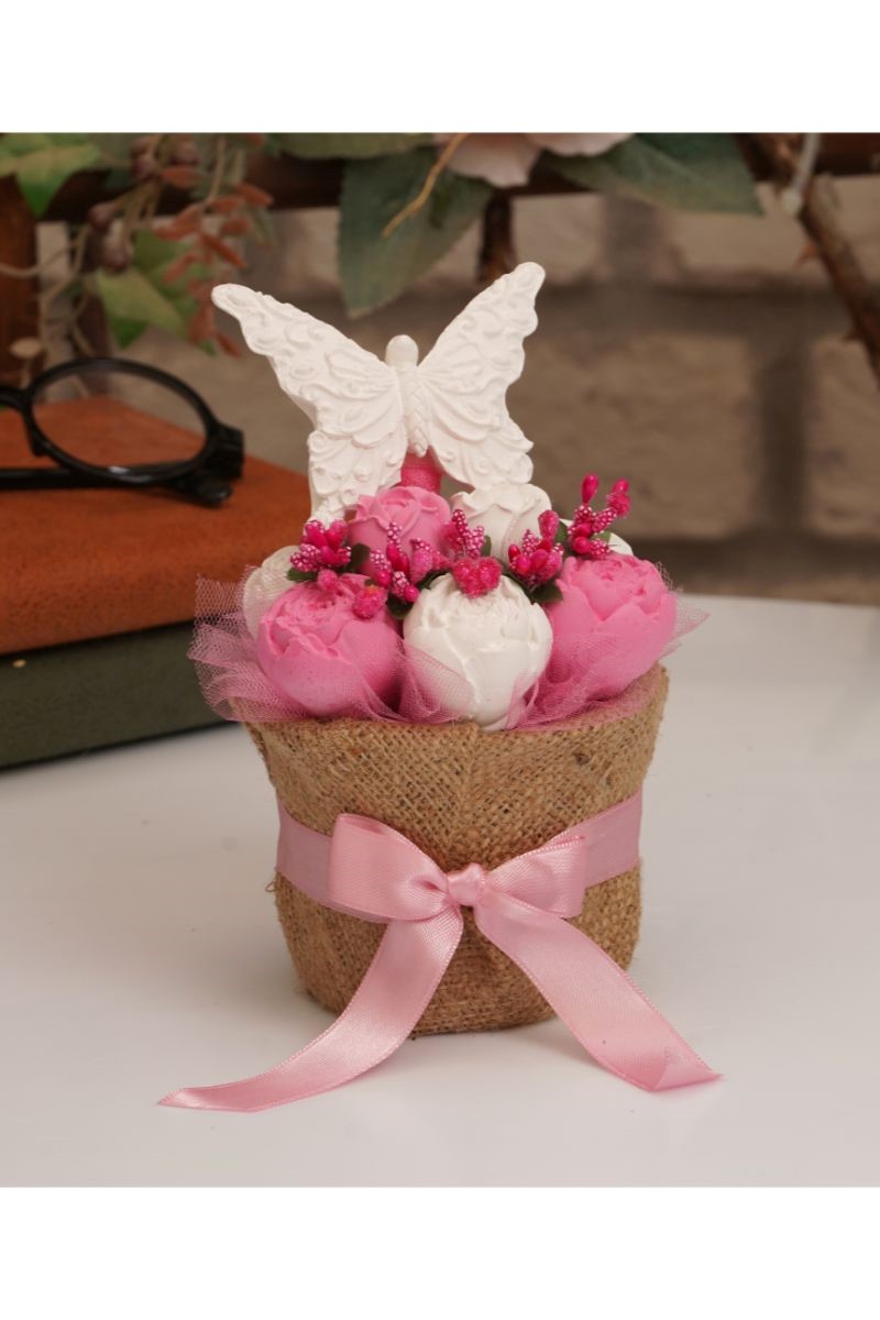 Özel Yapım Jüt Saksıda Kelebek Figürlü Pembe Kokulu Taş Çiçek Aranjmanı