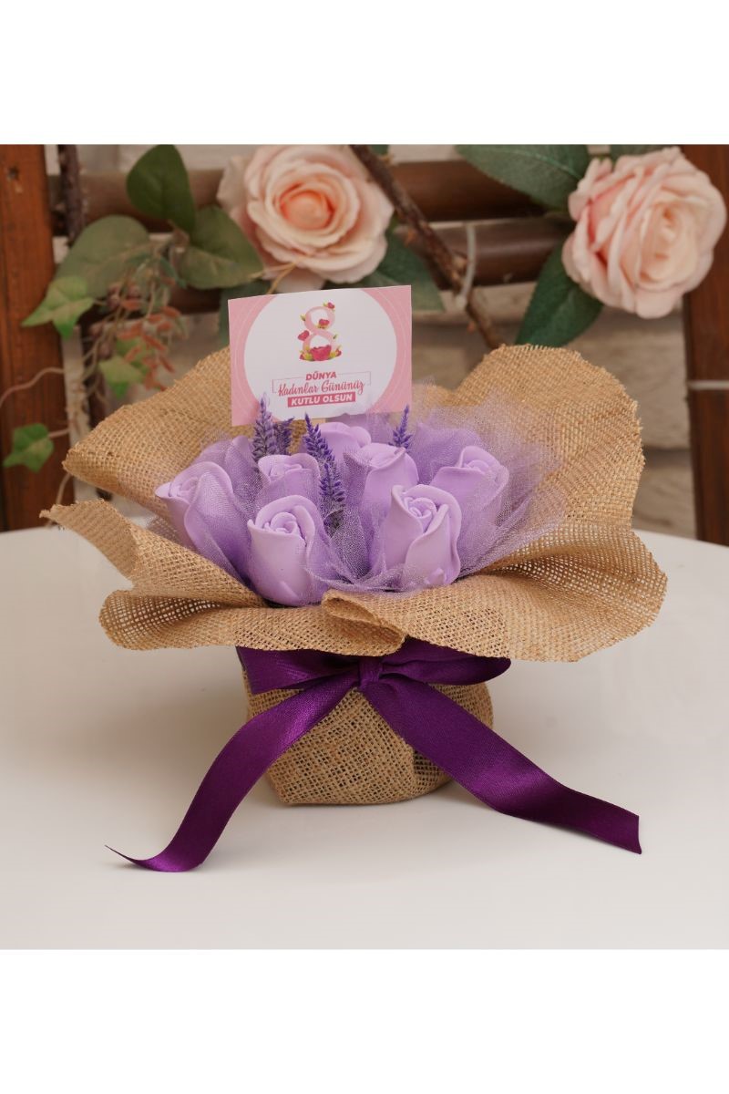 Özel Yapım Jüt Saksıda Lila Aşk Gonca Güller Kokulu Taş Çiçek Aranjmanı (Dünya Kadınlar Günü)
