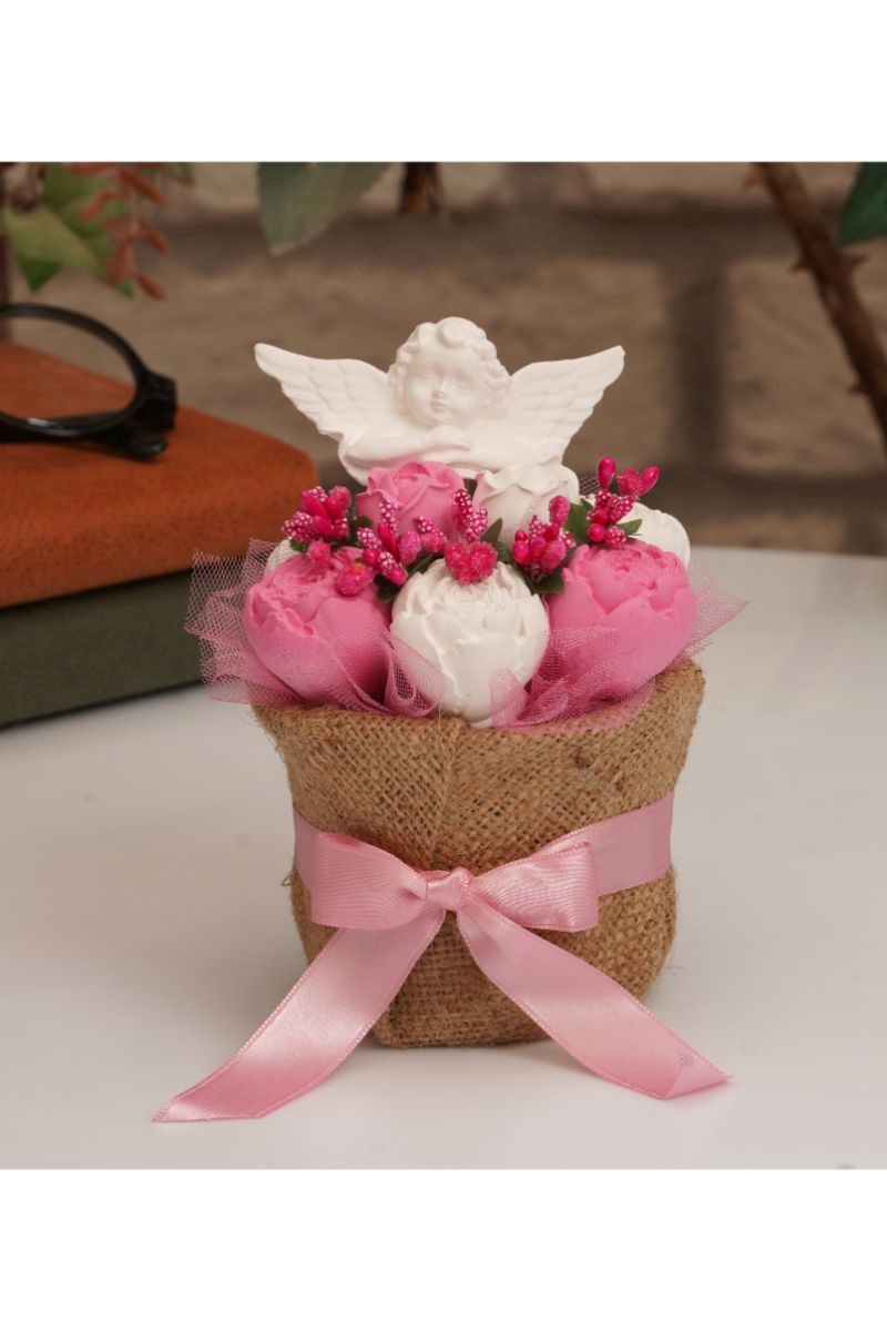 Özel Yapım Jüt Saksıda Melek Figürlü Pembe Kokulu Taş Çiçek Aranjmanı