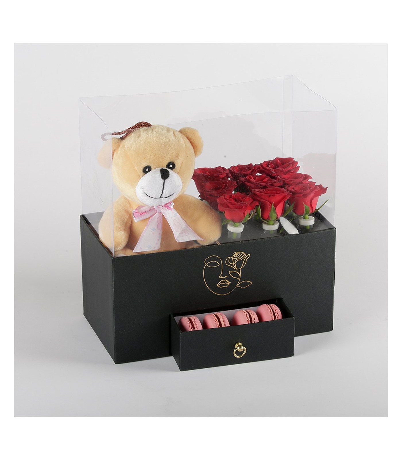 Peluş Oyuncaklı Makaronlu Kırmızı Güller 1 adet peluş oyuncak Gül Adeti : 9 makaron adeti : 4 Not: Güllerin renk tonları ve boyutları mevsim koşullarına göre değişiklik gösterebilir.