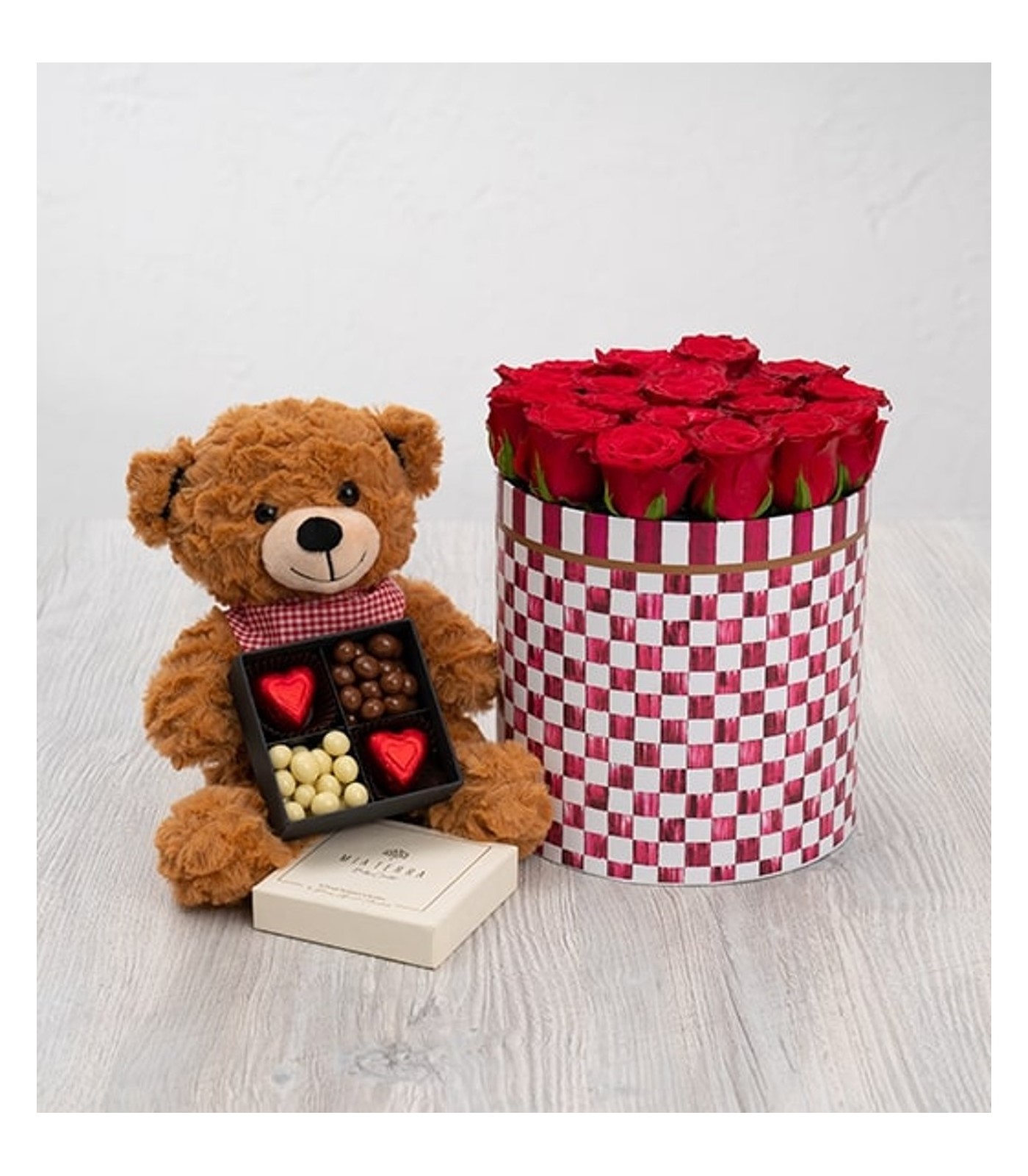 Pembe Pitikare Desen Silindir Kutuda Peluş Oyuncak Güller ve Çikolata
