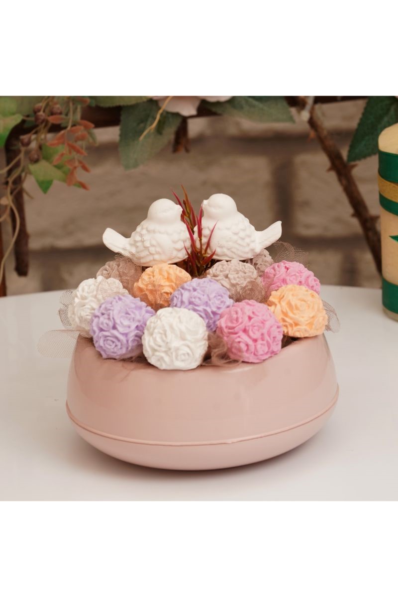 Pembe Saksıda Aşk Bahçesi Çifte Kumrular Kokulu Taş Çiçek Aranjmanı