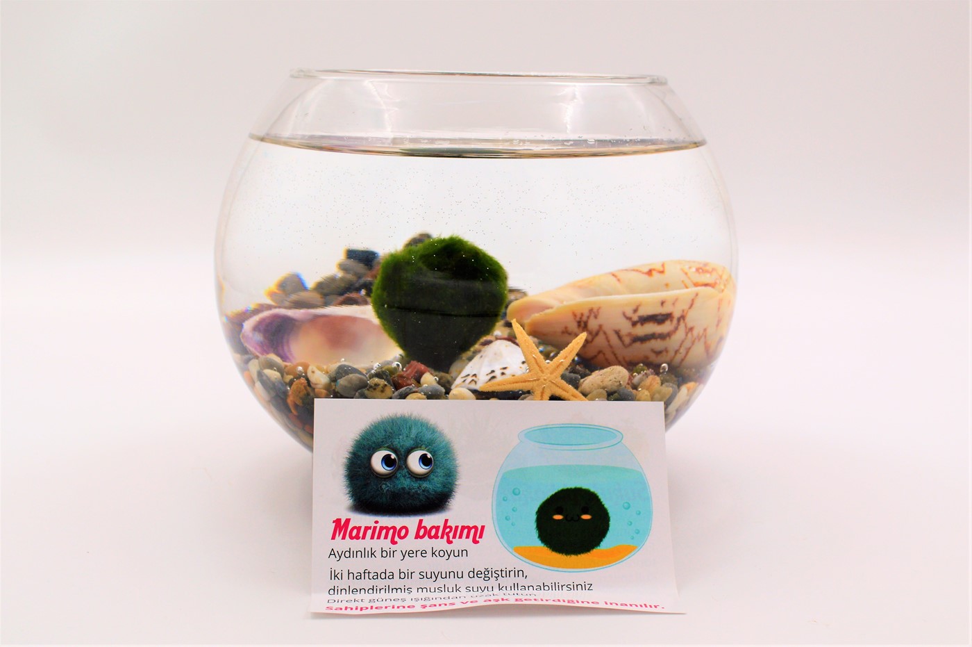 Suyun doğal hareketleriyle top şeklini alan yeşil alglerin oluşturduğu Marimo, fotosentez yaparak kendi besinini üretebilen ve su içinde yaşayan bir canlı türü olarak sınıflandırılıyor. Japonya’nın Akan, İzlanda’nın Myvatn göllerinde koloniler halinde yaşayan Marimo, oldukça az rastlanan canlı türleri arasında.1921 yılında Japonya’da, 2006 yılında ise İzlanda’da ‘’ulusal hazine’’ ilan edilerek koruma altına alınan bu canlıların,avuç içinde sıkıca tutunca dilekleri gerçekleştirdiğine inanılıyor.Ayrıca sahibine şans, mutluluk, huzur ve bereket getirdiğine de inanılıyor.Yılda ortalama 5 mm büyüyor.Bakımı suyunu değiştirmek kadar kolay.Boyut: 22X22cm Ürün bakım bilgileri siparişinizle birlikte gönderilecektir.